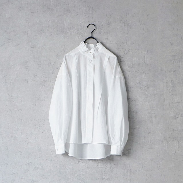 size 肩幅60cm 裄丈80cm 着丈(前)63cm(後)70cm 袖丈50cm 身幅59cm 袖口周り21cm 首周り42cm (モデル身長=166cm) composition 表地 コットン60% リネン40% 付属 くるみボタン、シェルボタン made in japan DETAIL 襟元をぐるりとやさしく包み込む、細やかに小さく折りたたんだラッフル・フリルが、丁寧な印象を与えるブラウス。 適度にゆったりと美しく、 体に収まりの良いシルエットに仕上げたブラウスは、 凛とした表情がありながら、 きゅっと締まったカフスに寄せたタックのふんわり感により、 クラシックなデザインに仕上がりました。 幅広のフライフロントや、くるんとカーブしたヨークなど、 ちょっとしたMAGALIらしい遊び心を取り入れました。 素材は、横方向に畝のある平織のコットン×リネン。 天然素材特有のネップ感がリズミカルに現れ、 色合いは単一ではない品のある表情をみせてくれます。 ふんわりとやわらかな風合いに仕上げていますので、 年間を通して着用していただきやすい素材です。 非常に使い勝手がよいブラウスで、アウターやワンピースから襟をのぞかせて 表情豊かな着こなしをお楽しみいただけます。 - - - - - - - - - - - - - - - - - - - - - - - - - - - - - - - - - - - - - - - - - - - - - - - - - - - - - - - - - - - - - - - - - ・表面に織フシやネップがある場合がありますが、天然繊維独特の特徴ですのでご了承ください。 ・摩擦により色落ちし、他の衣料に移染することがありますのでご注意ください。 ・お洗濯は、ネットに入れて弱水流か、または手洗いしてください。 ・お洗濯の際は、できるだけ他の物と分けてください。 ・タンブラー乾燥はお避け下さい。