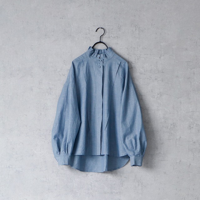 MAGALI コットンリネン.シャンブレー.ラッフルブラウス ブルー