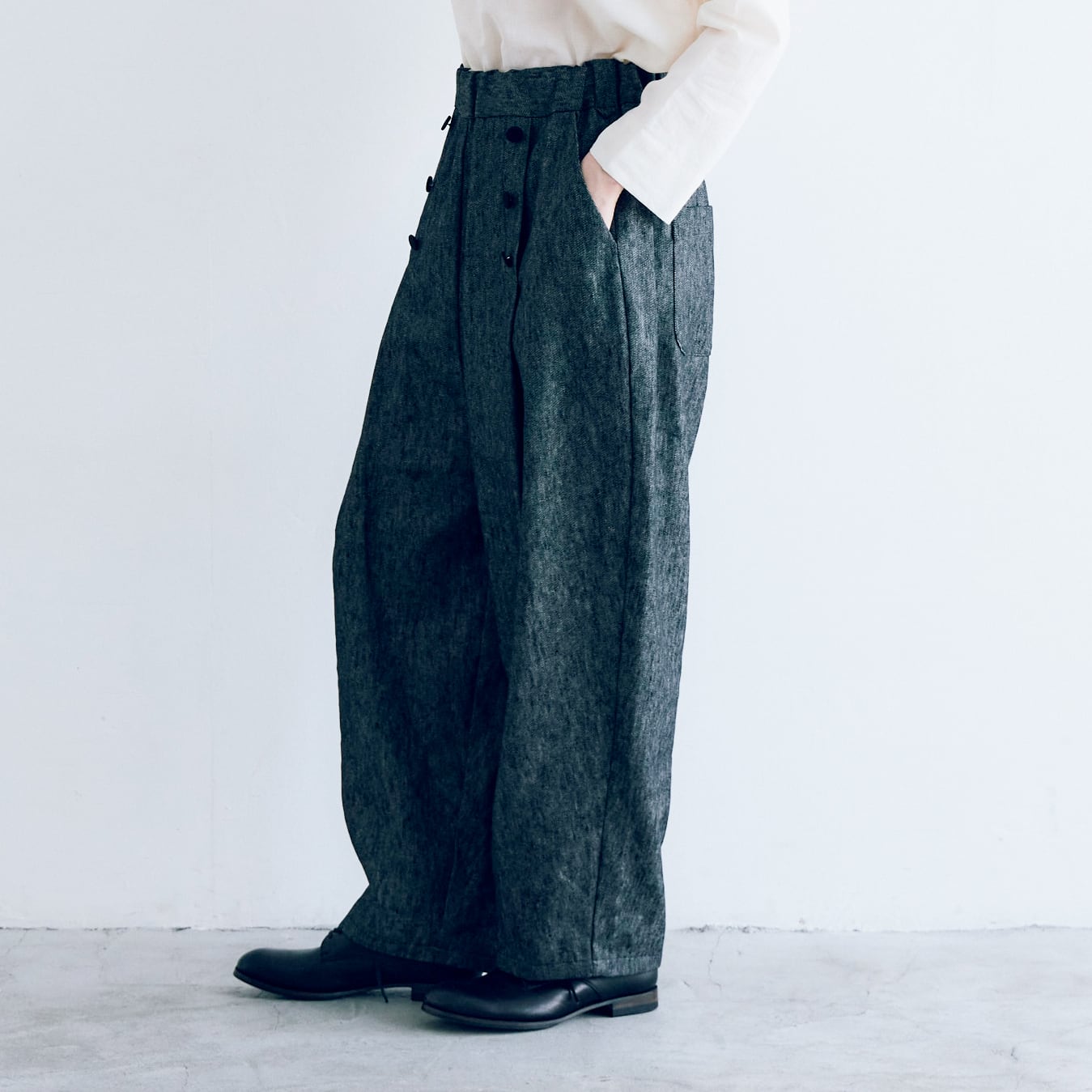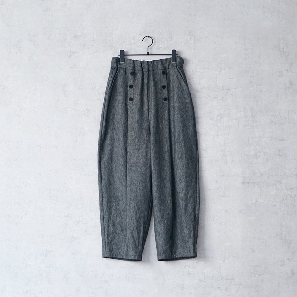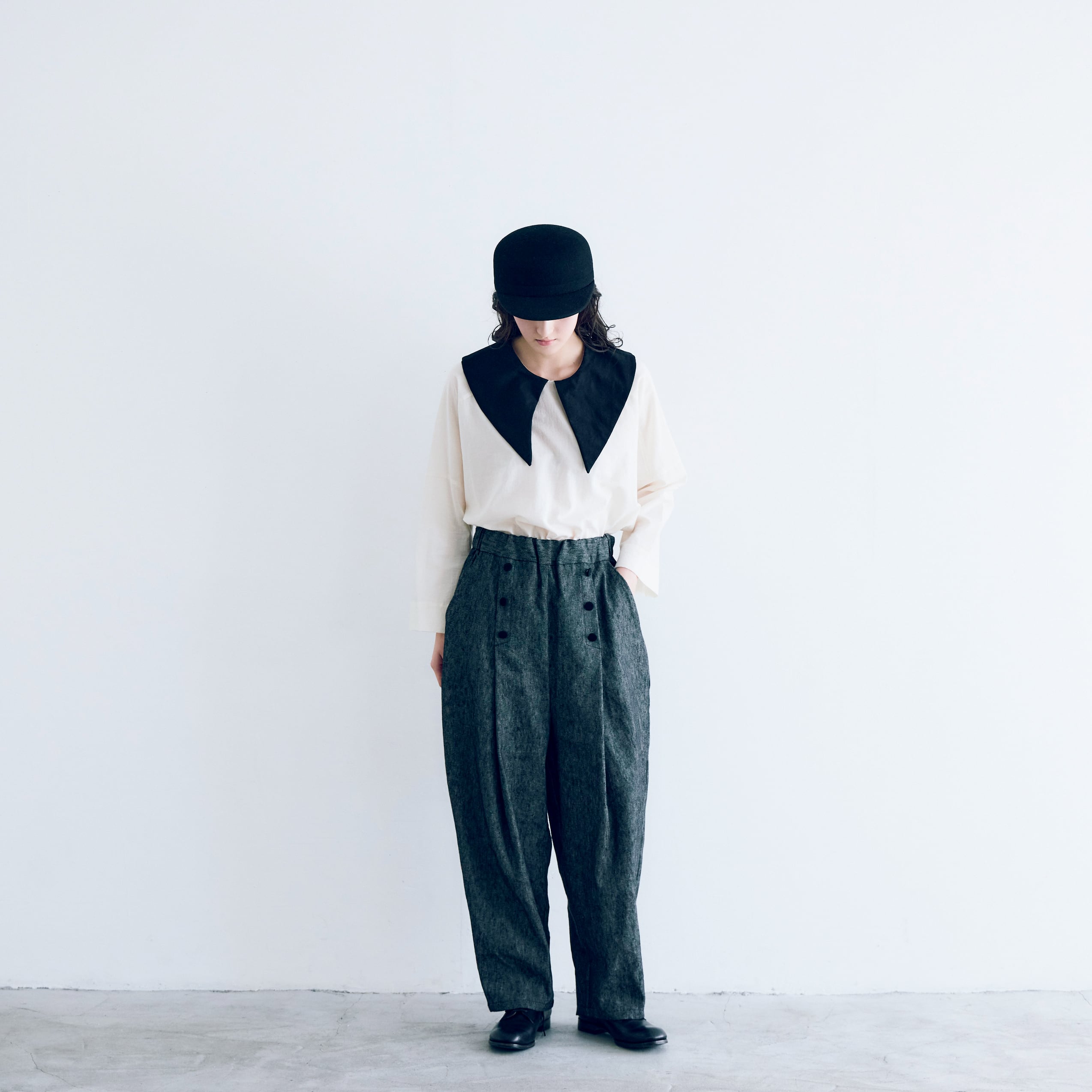 大きなタックには配色のくるみボタンをあしらい、まるでセーラーパンツのような趣きに。