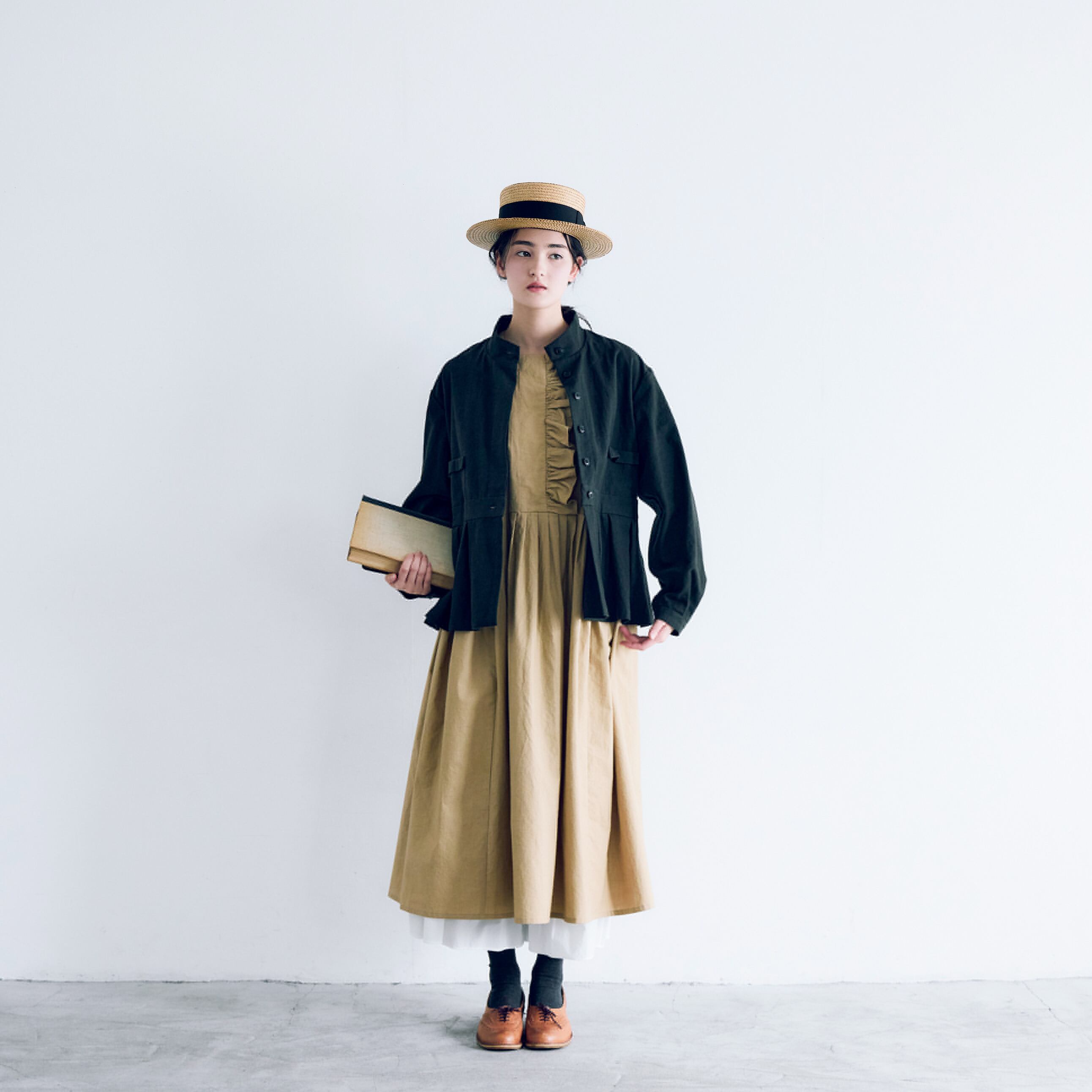 ミリタリー風の面持ちですが、 タックにより少しふわっとした袖やペプラムの裾がフェミニンなアクセントとなり、穏やかに調和しています。