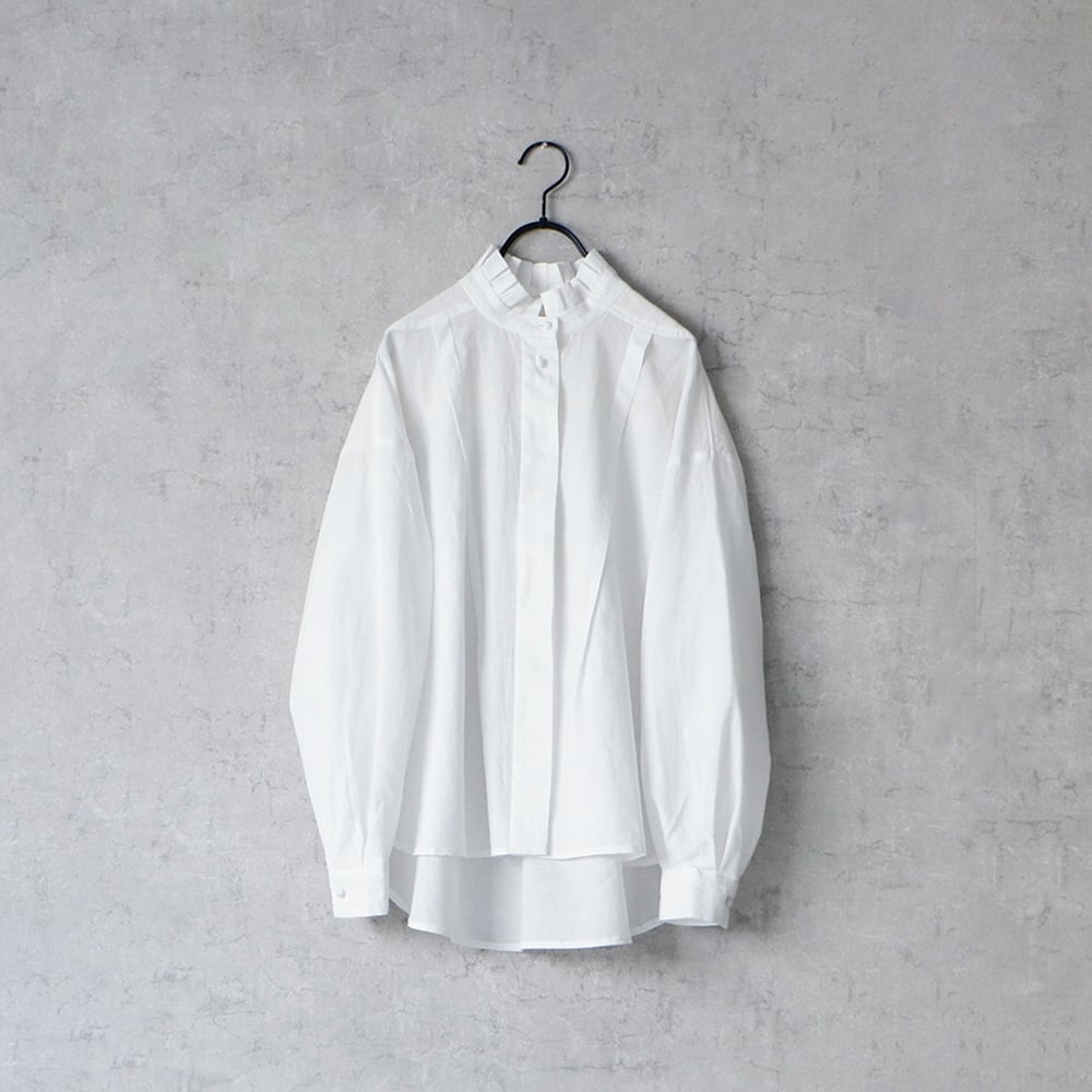 襟元をぐるりとやさしく包み込む、細やかに小さく折りたたんだラッフル・フリルが、丁寧な印象を与えるブラウス。