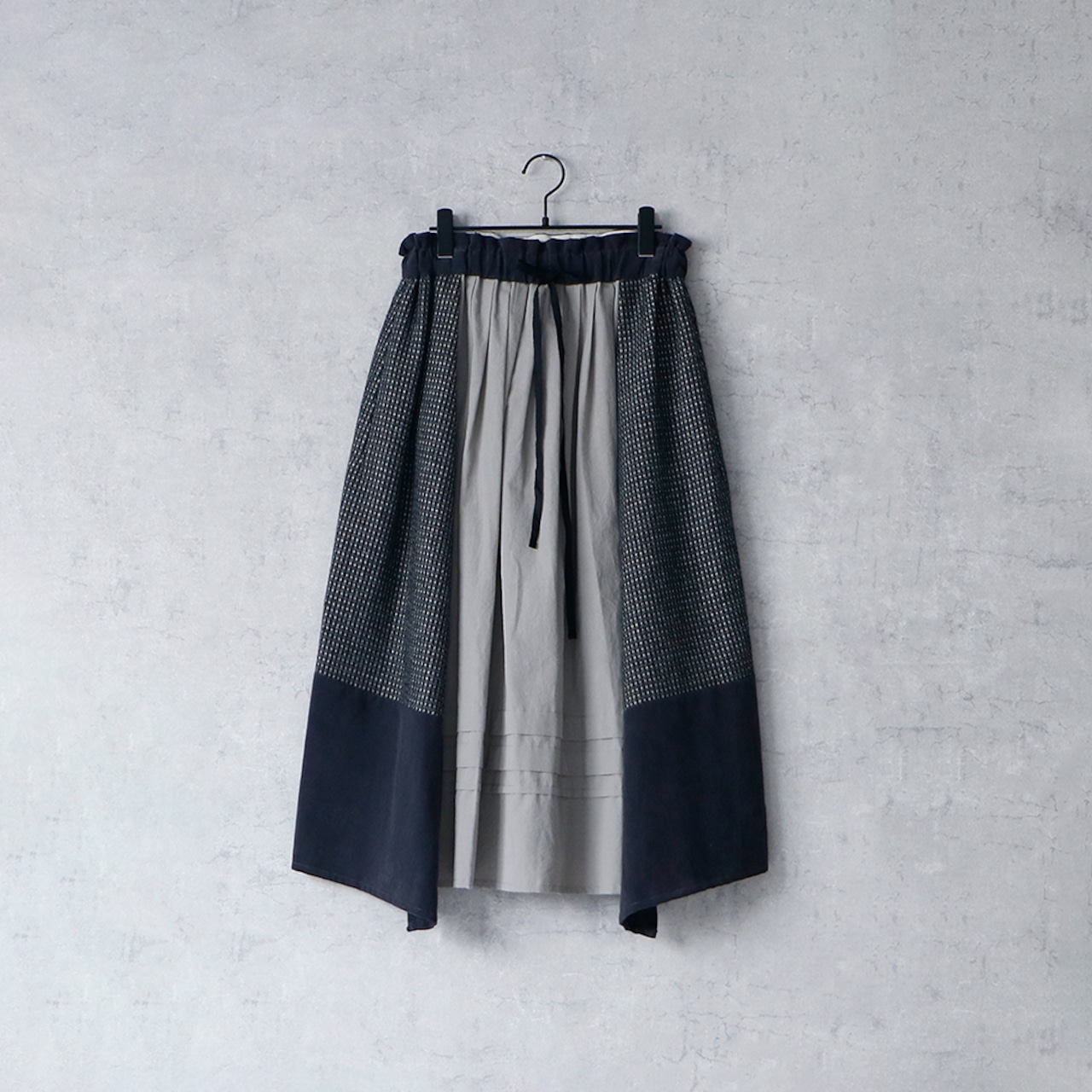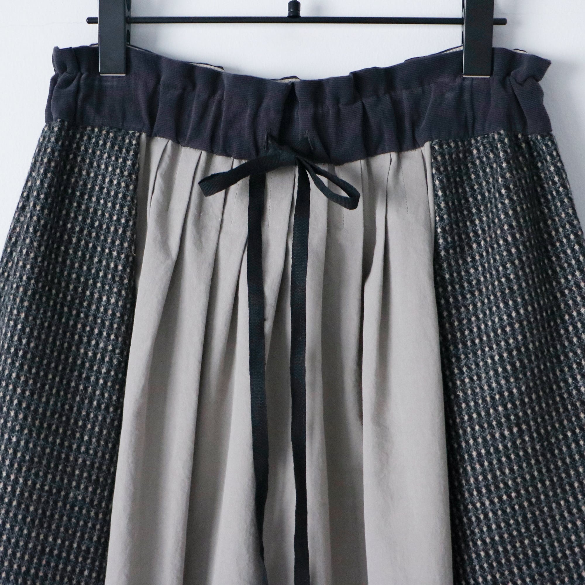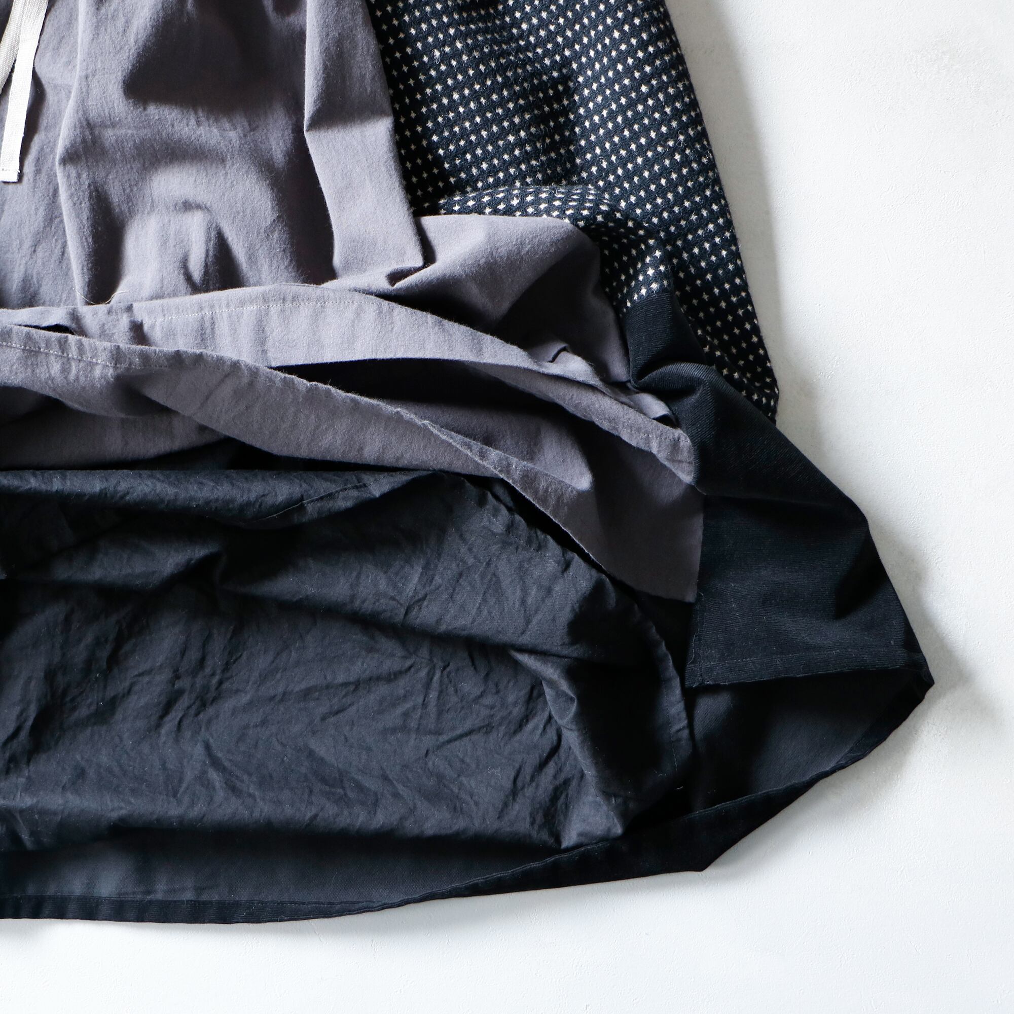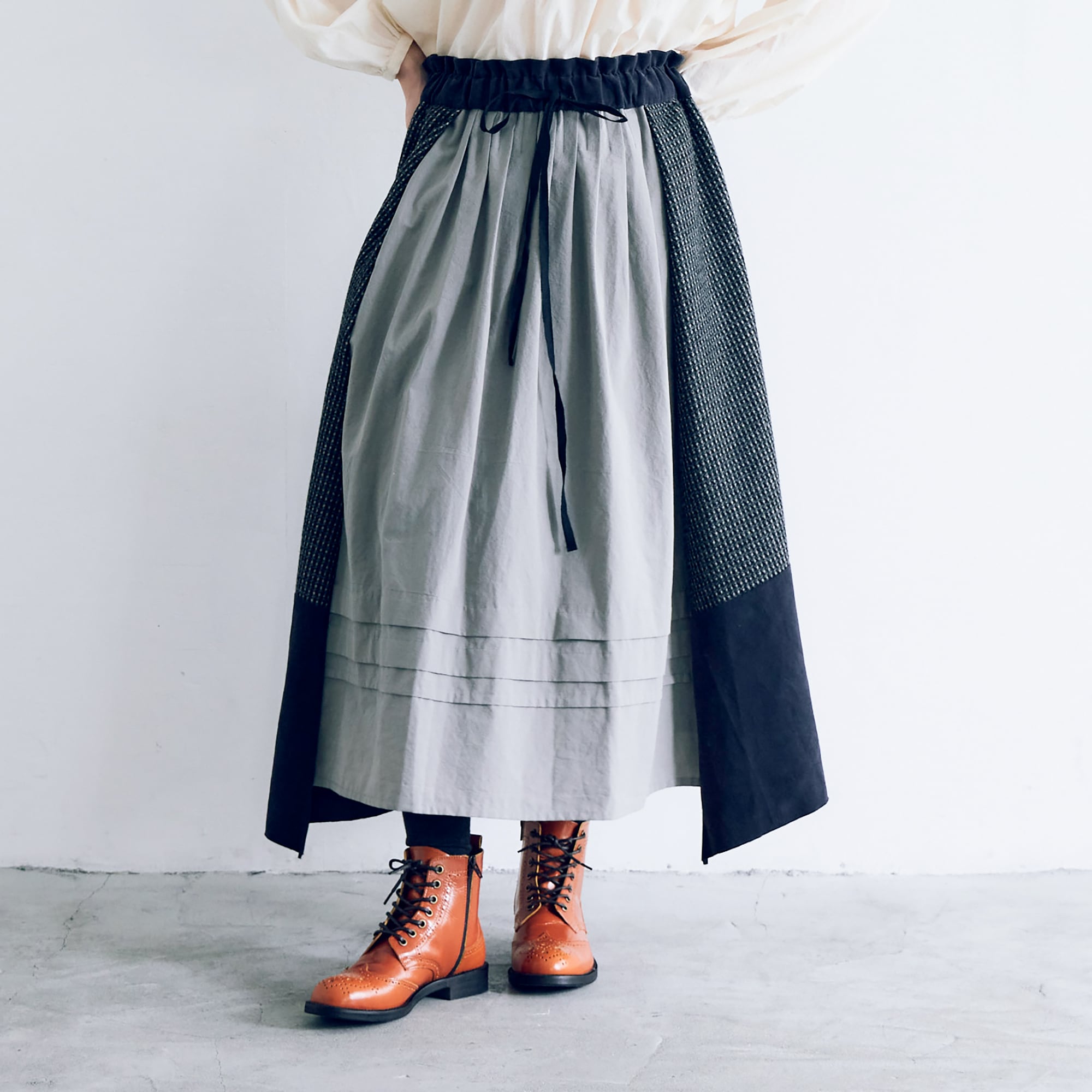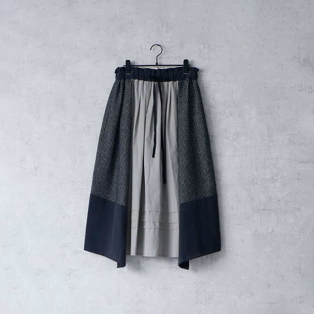 3種類の素材をつなぎ合わせて出来上がったスカートは、素朴で、それでいてどこにもない、愛らしい佇まい。