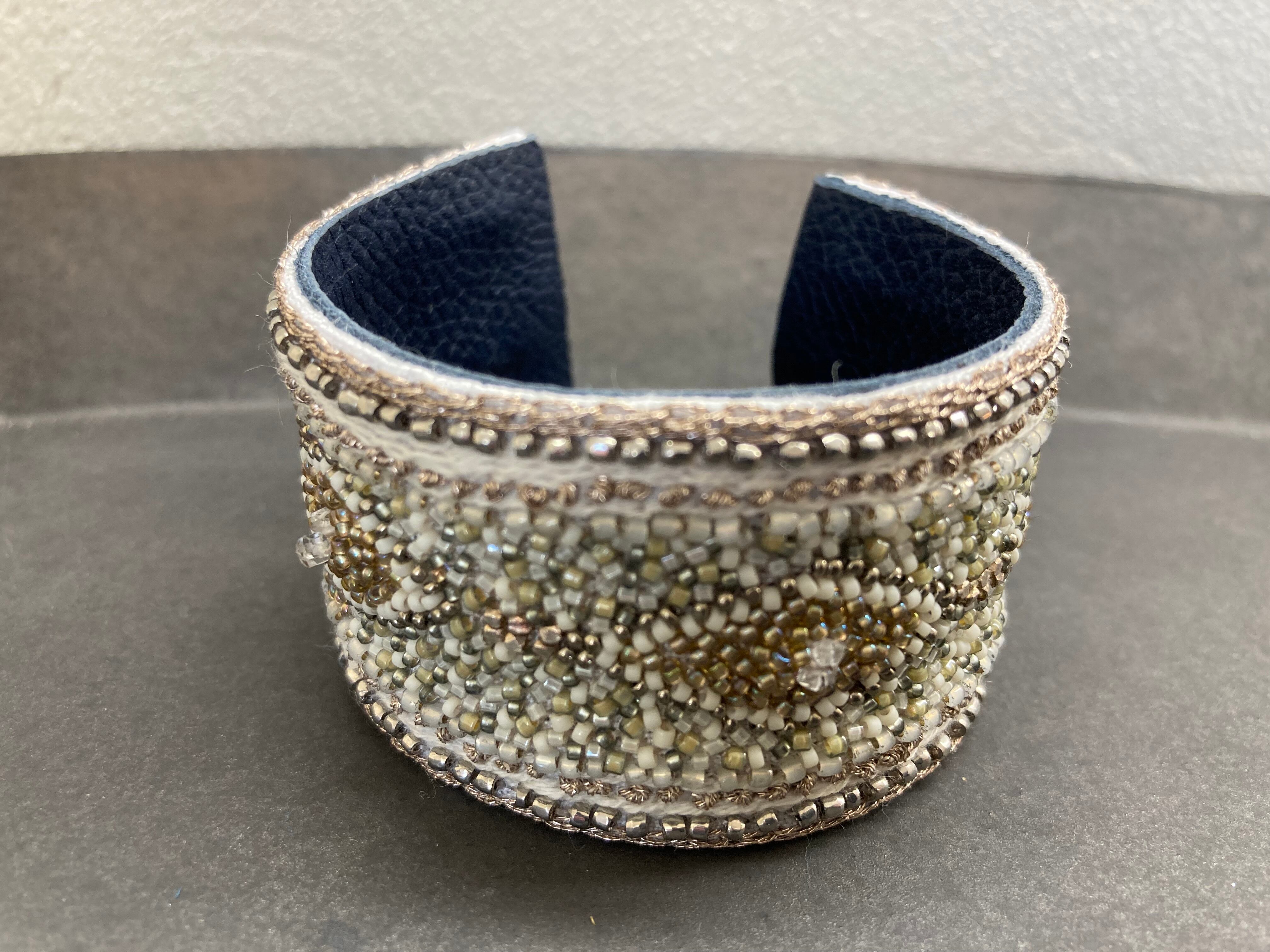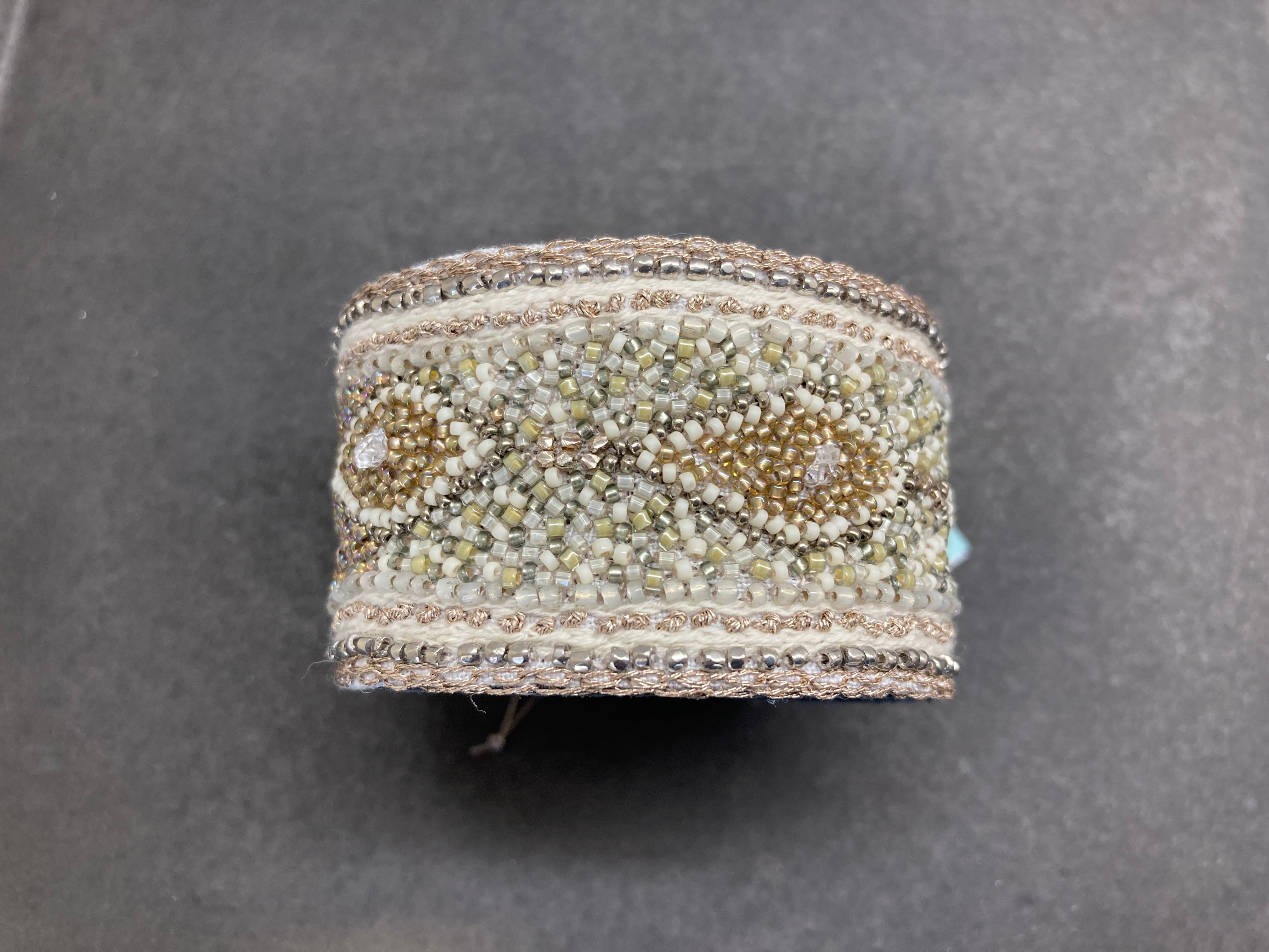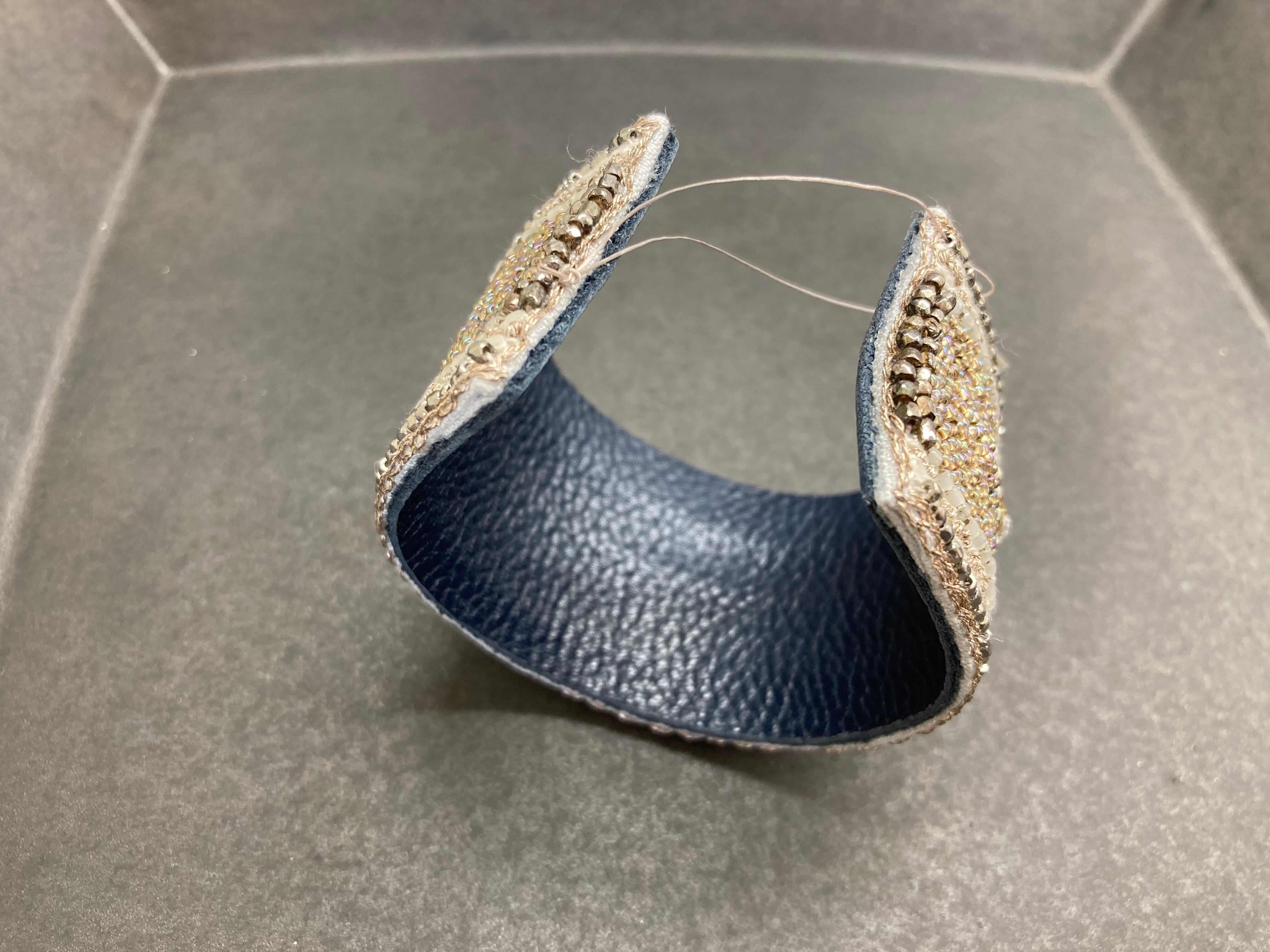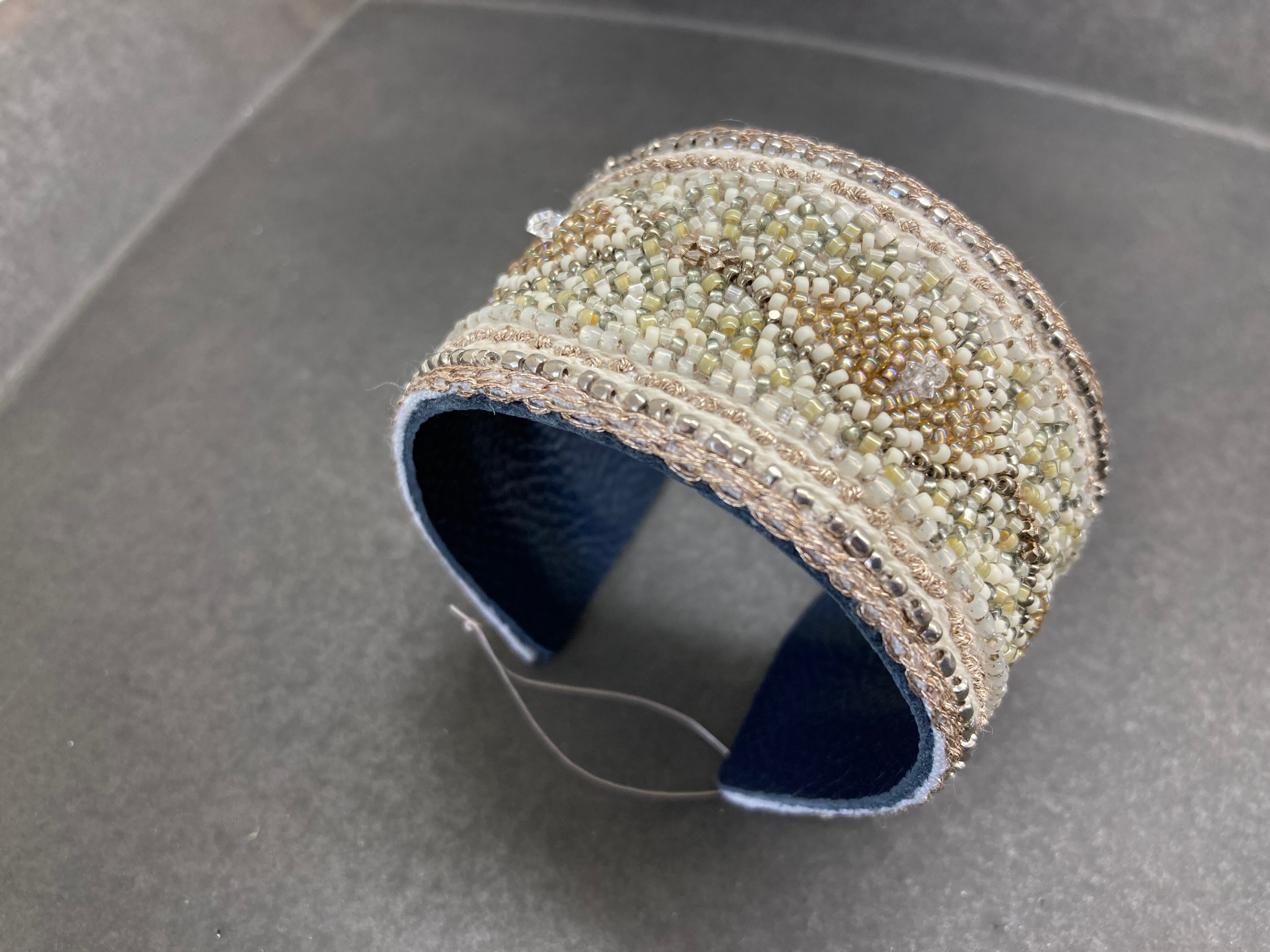 ひと針ひと針、ビーズを刺して作品に仕立てています。