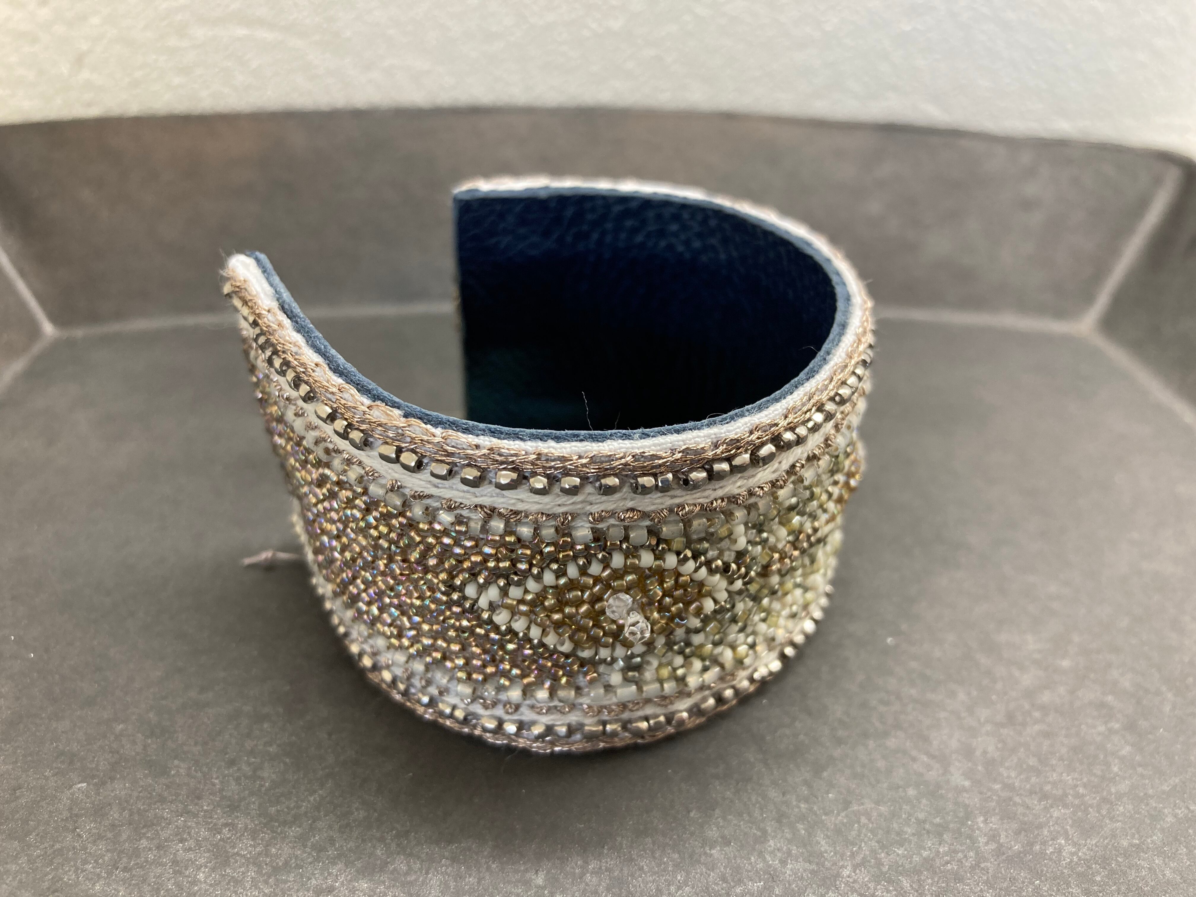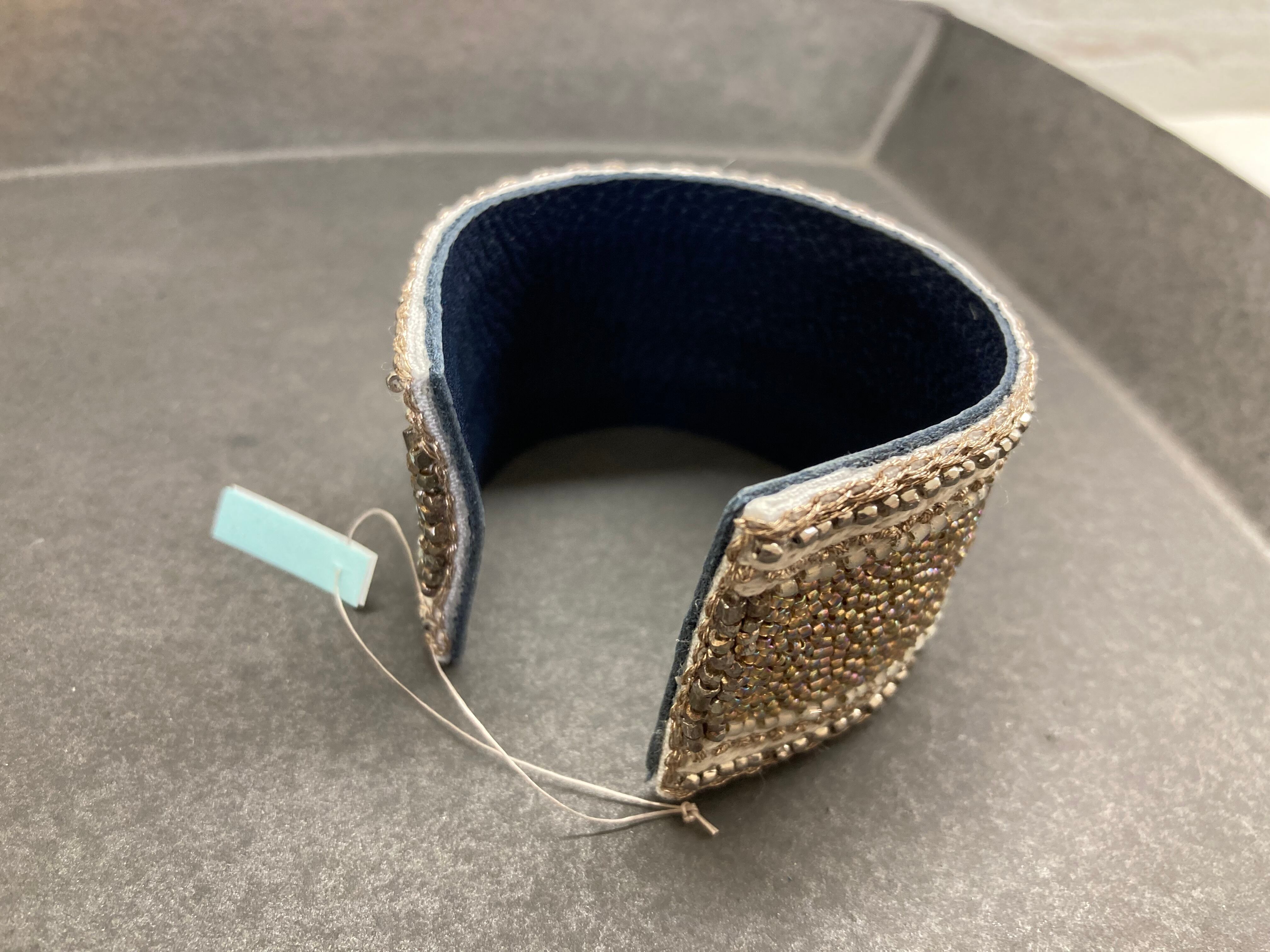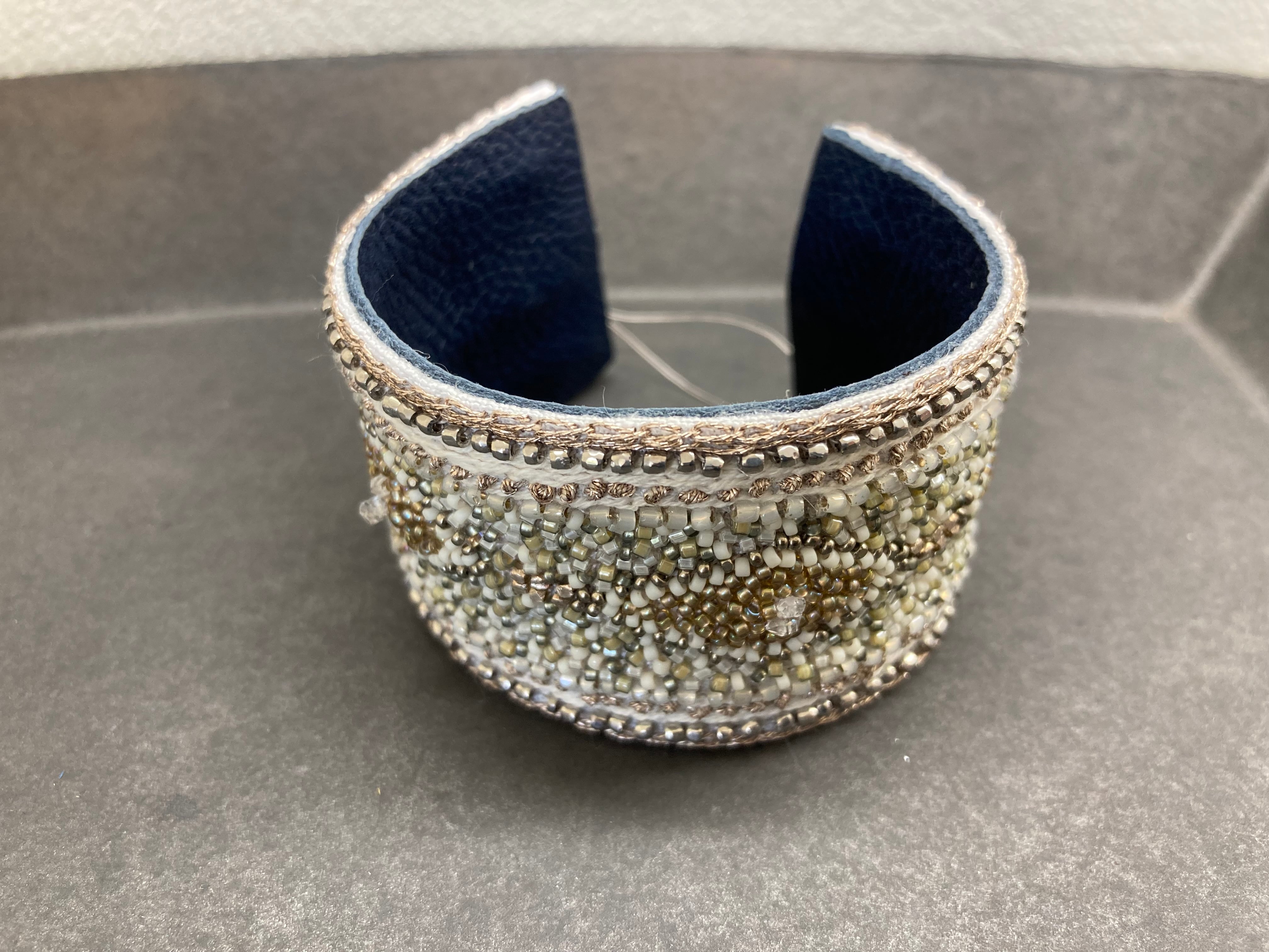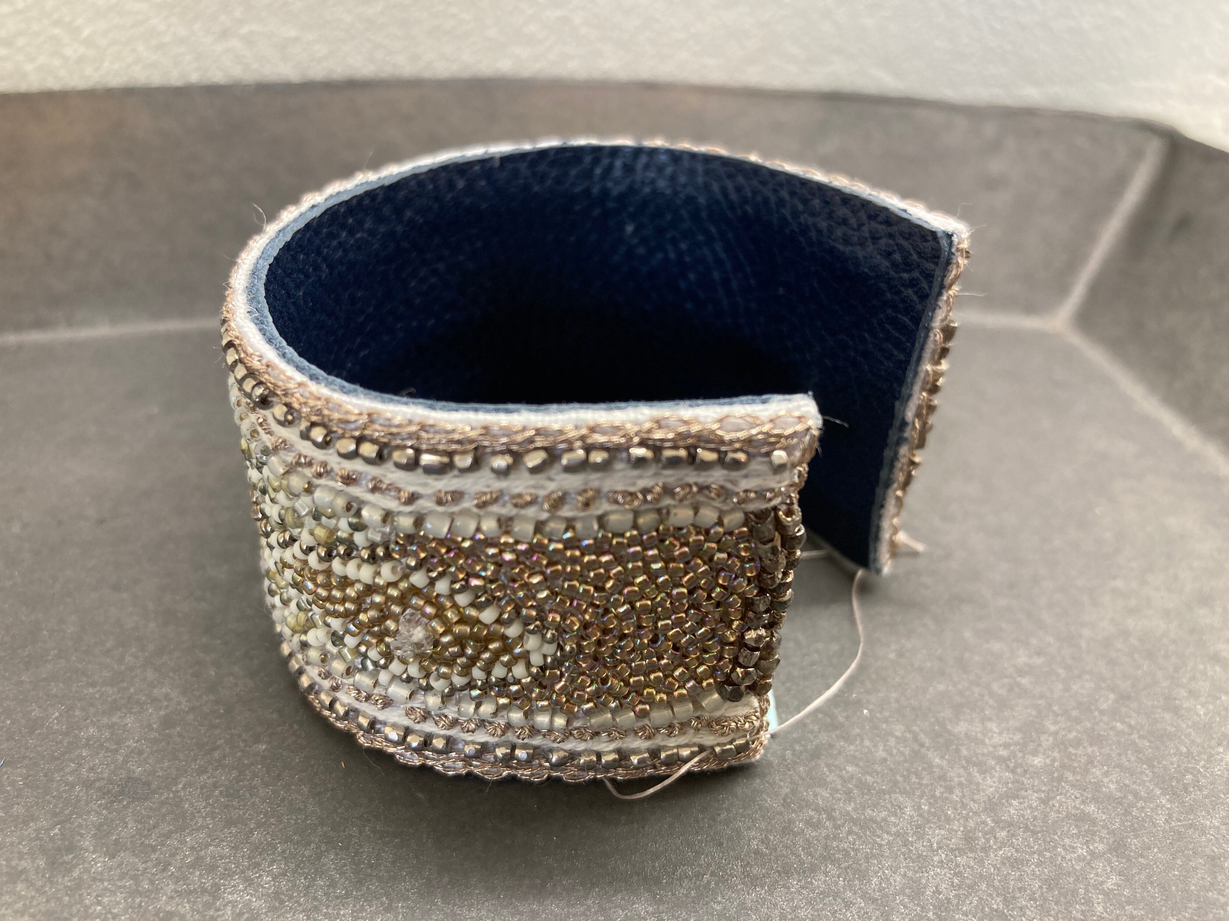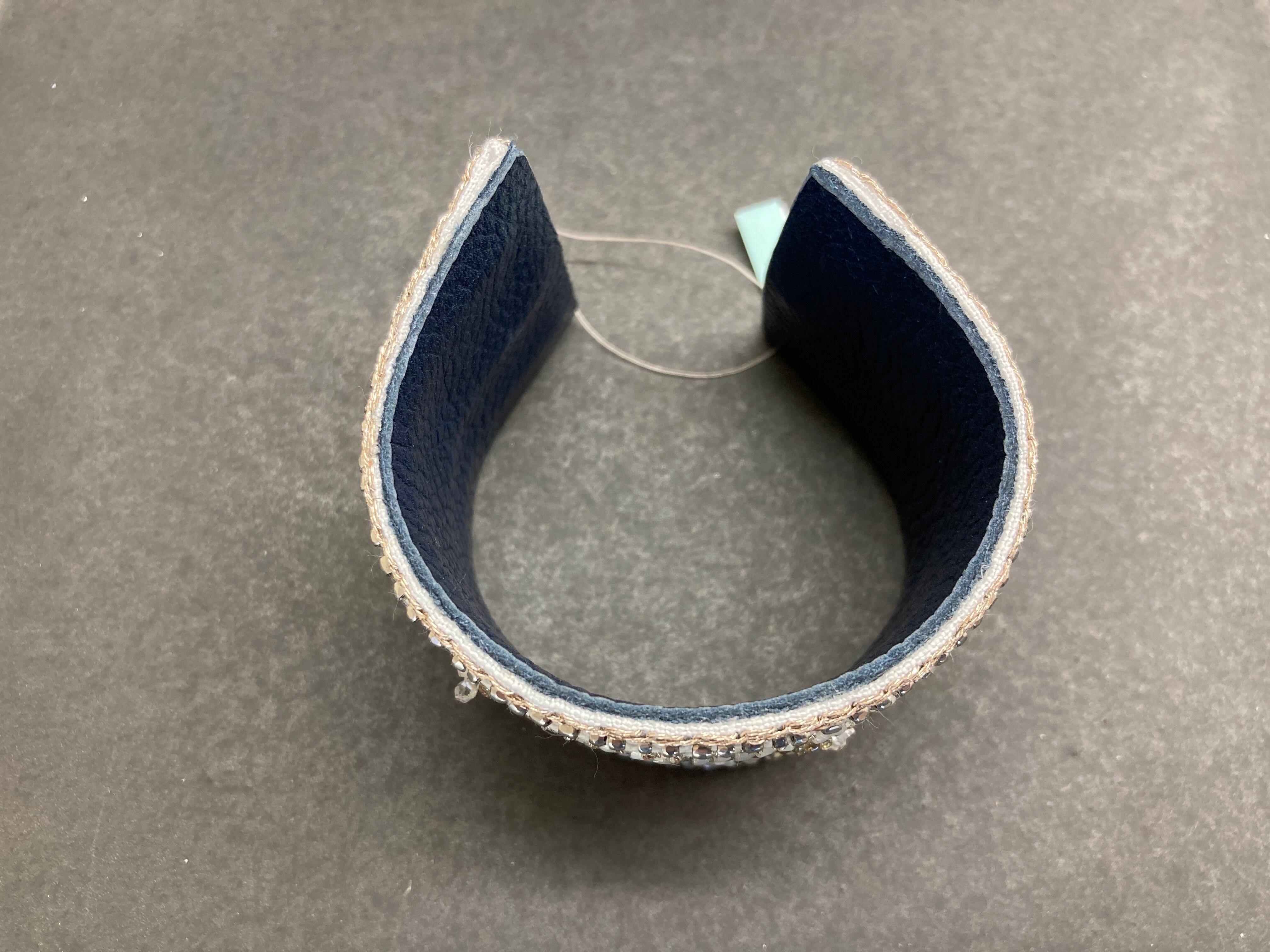 ひと針ひと針、ビーズを刺して作品に仕立てています。