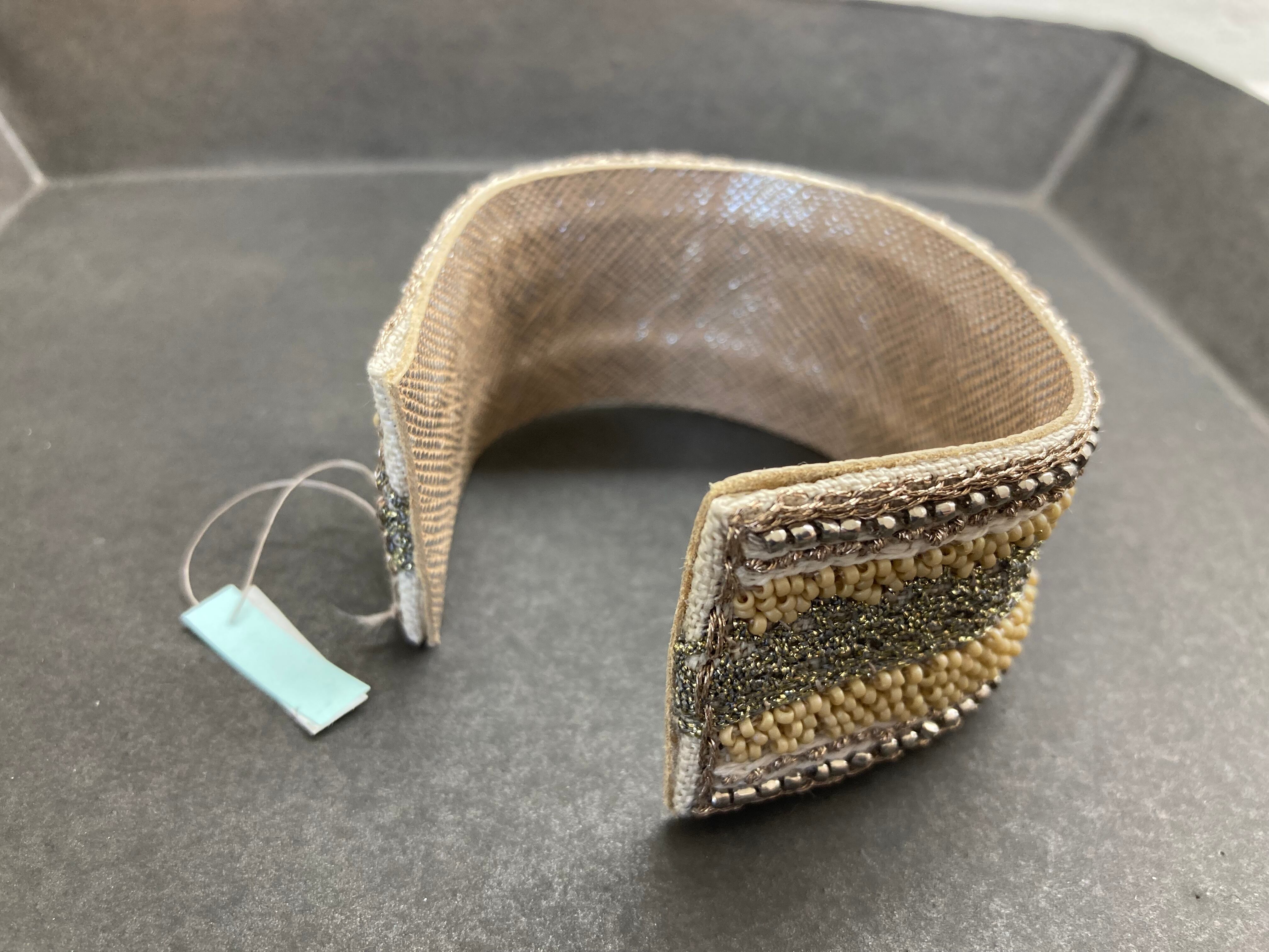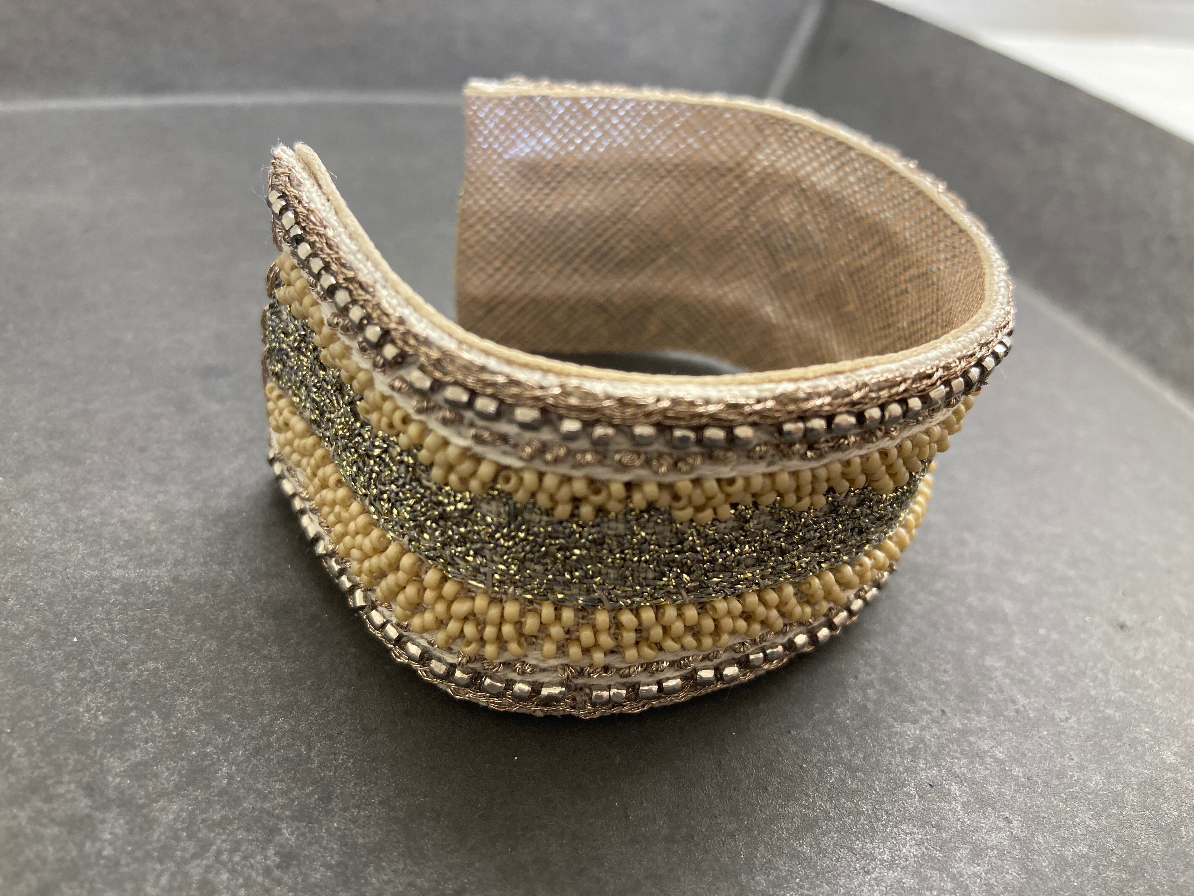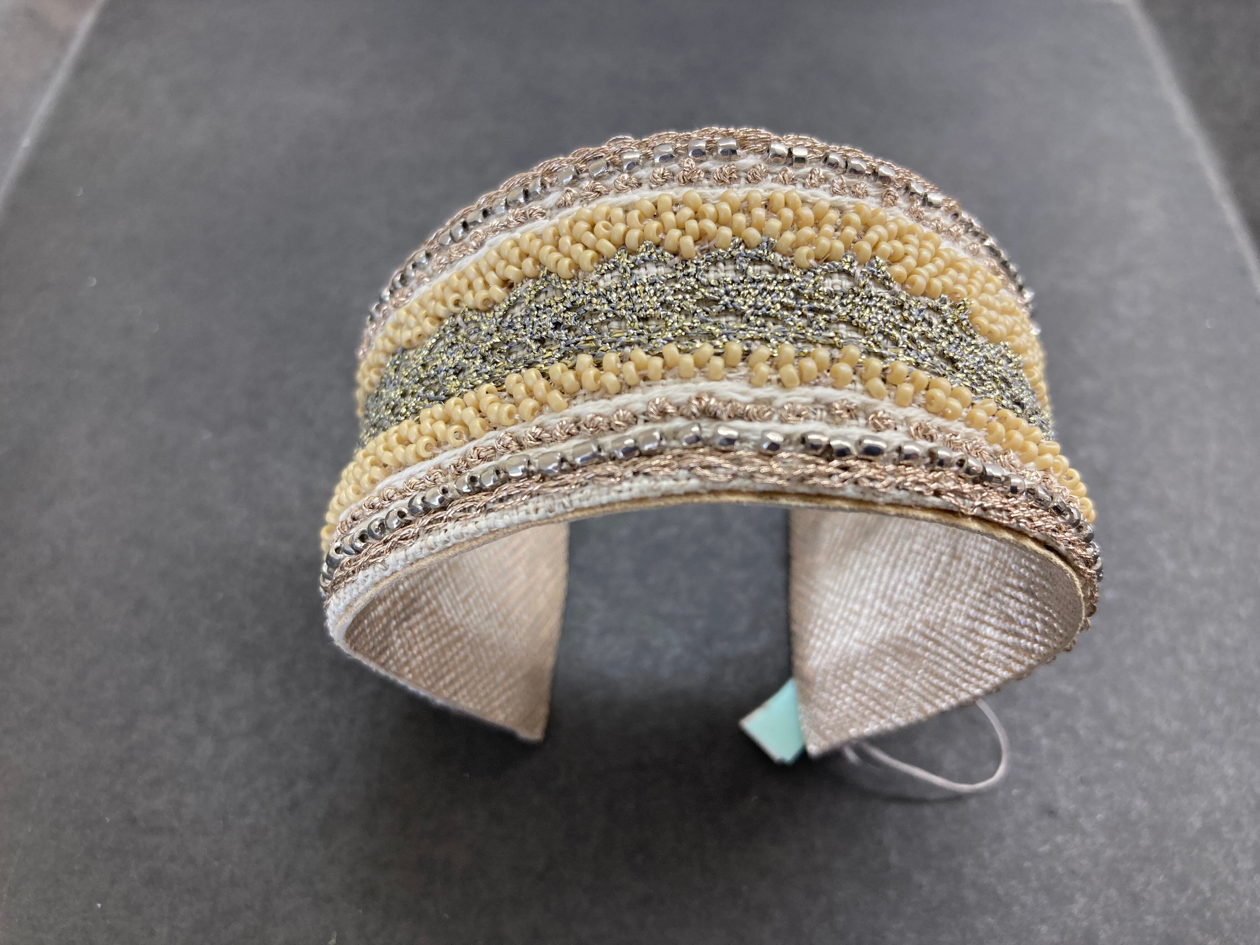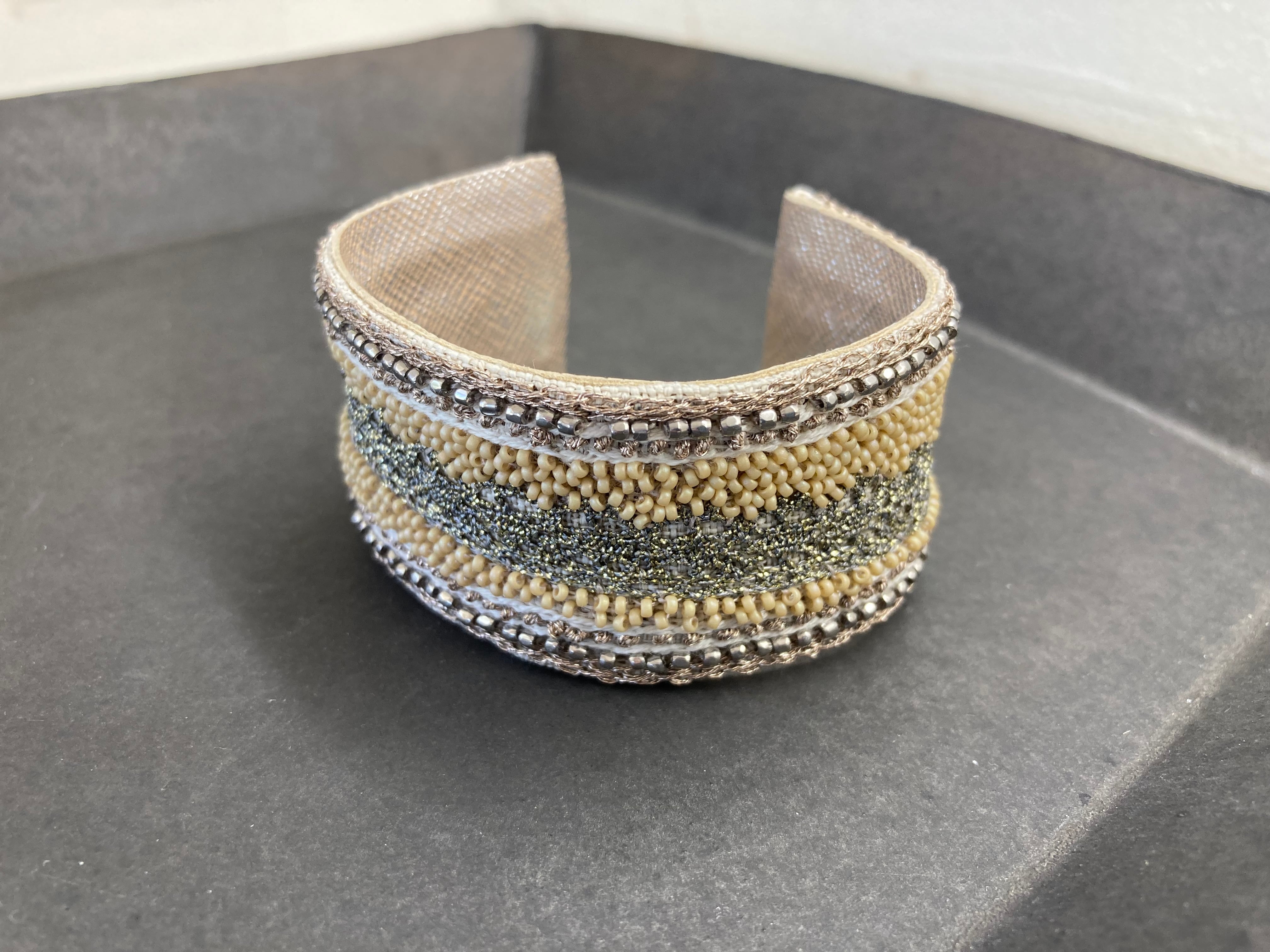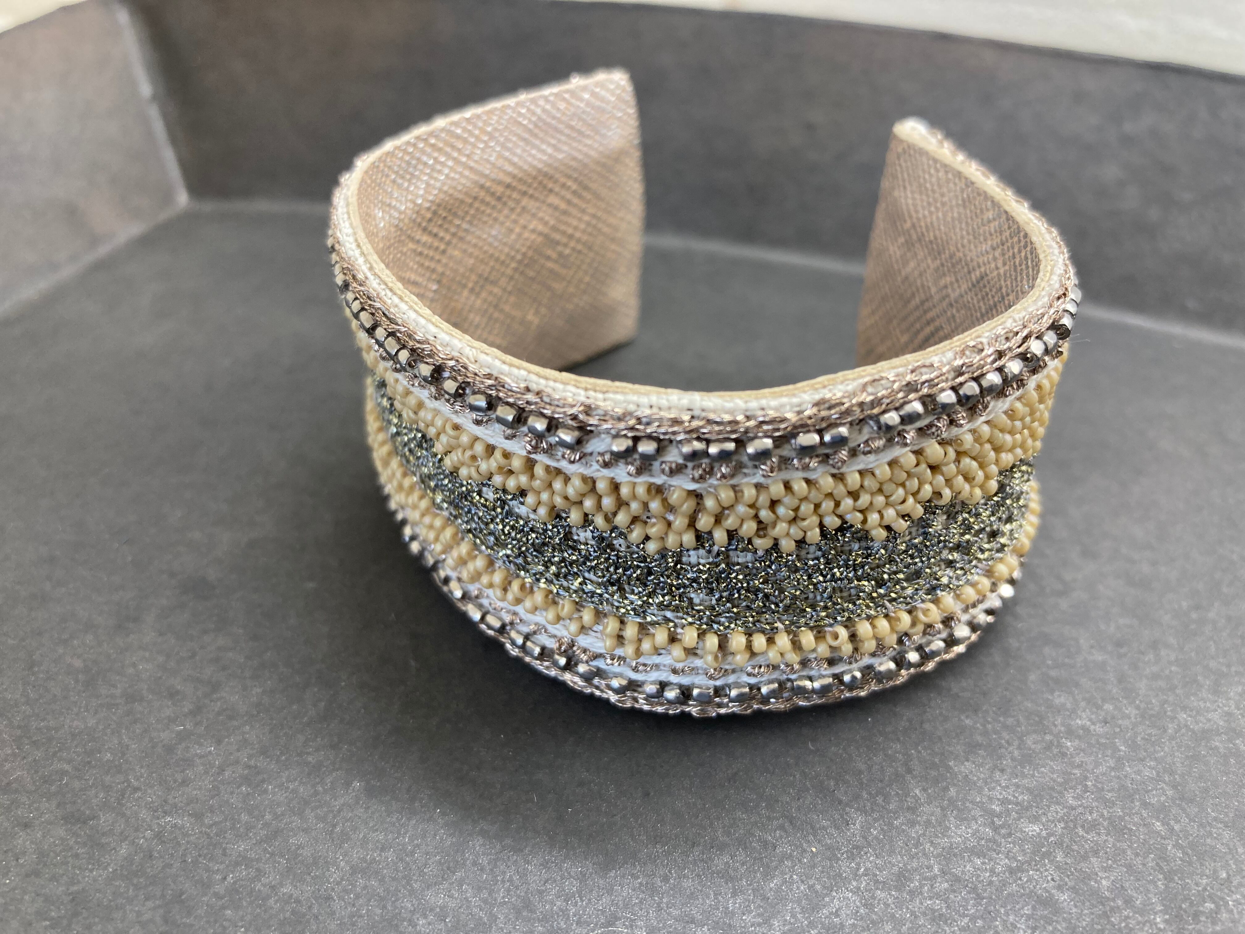 ひと針ひと針、ビーズを刺して作品に仕立てています。