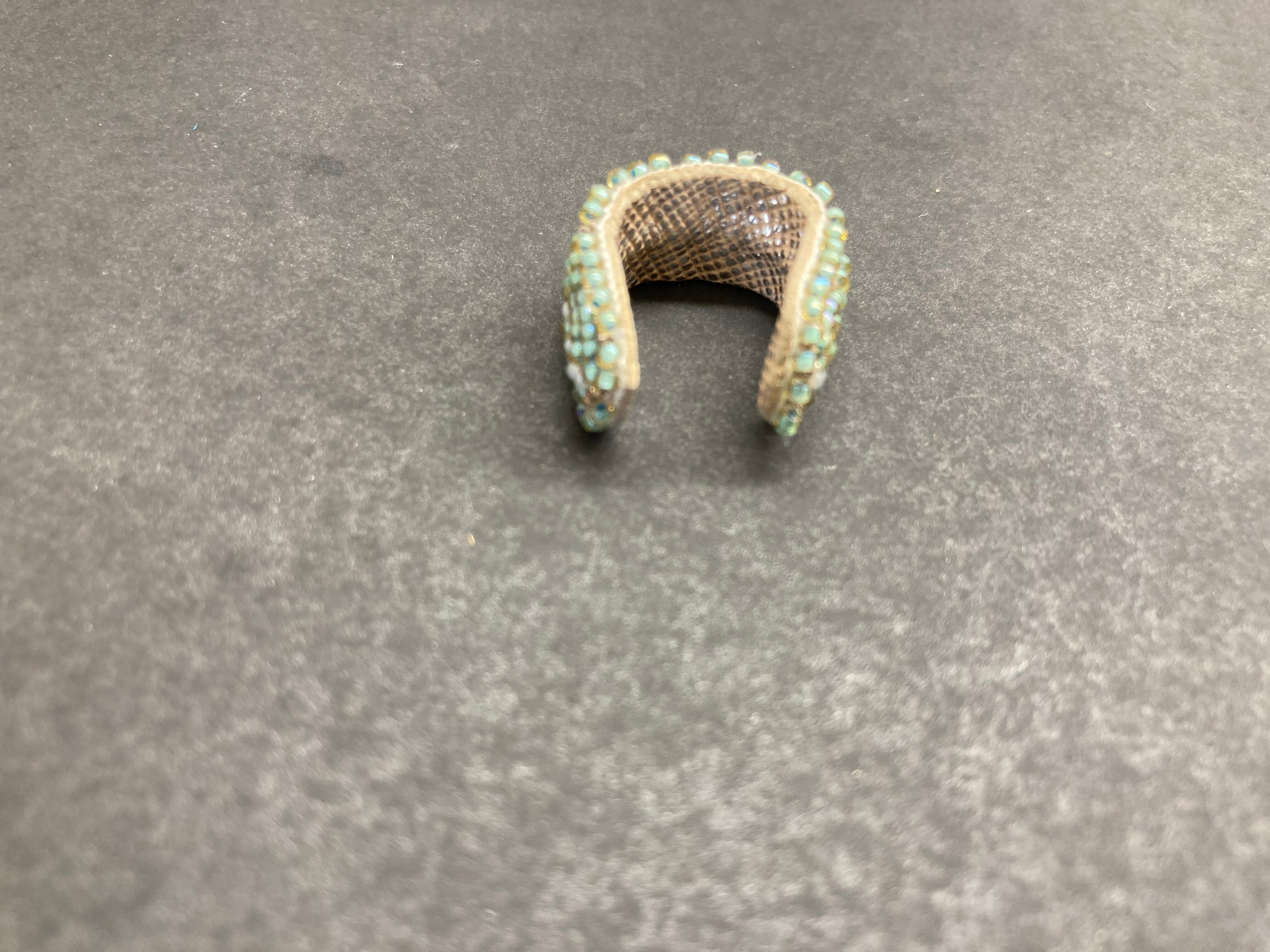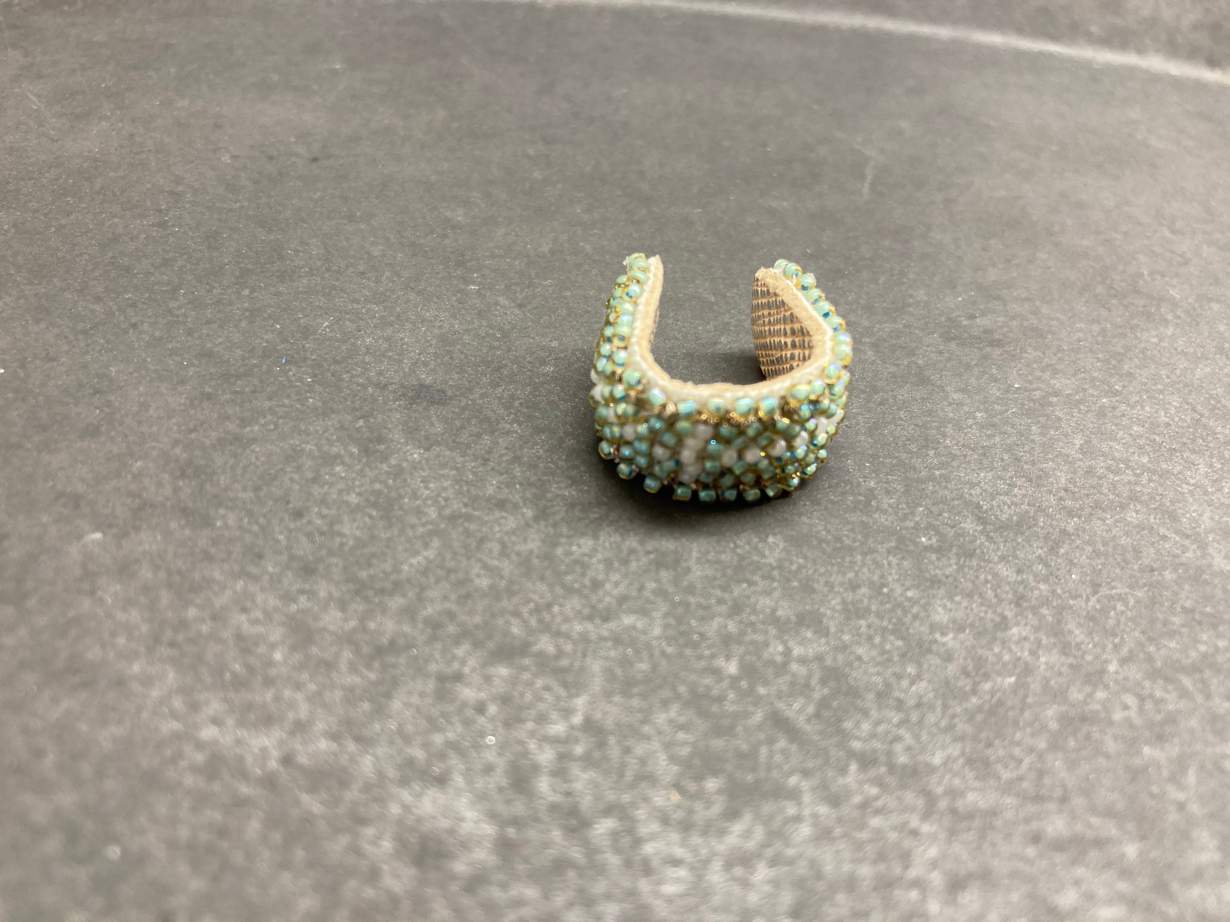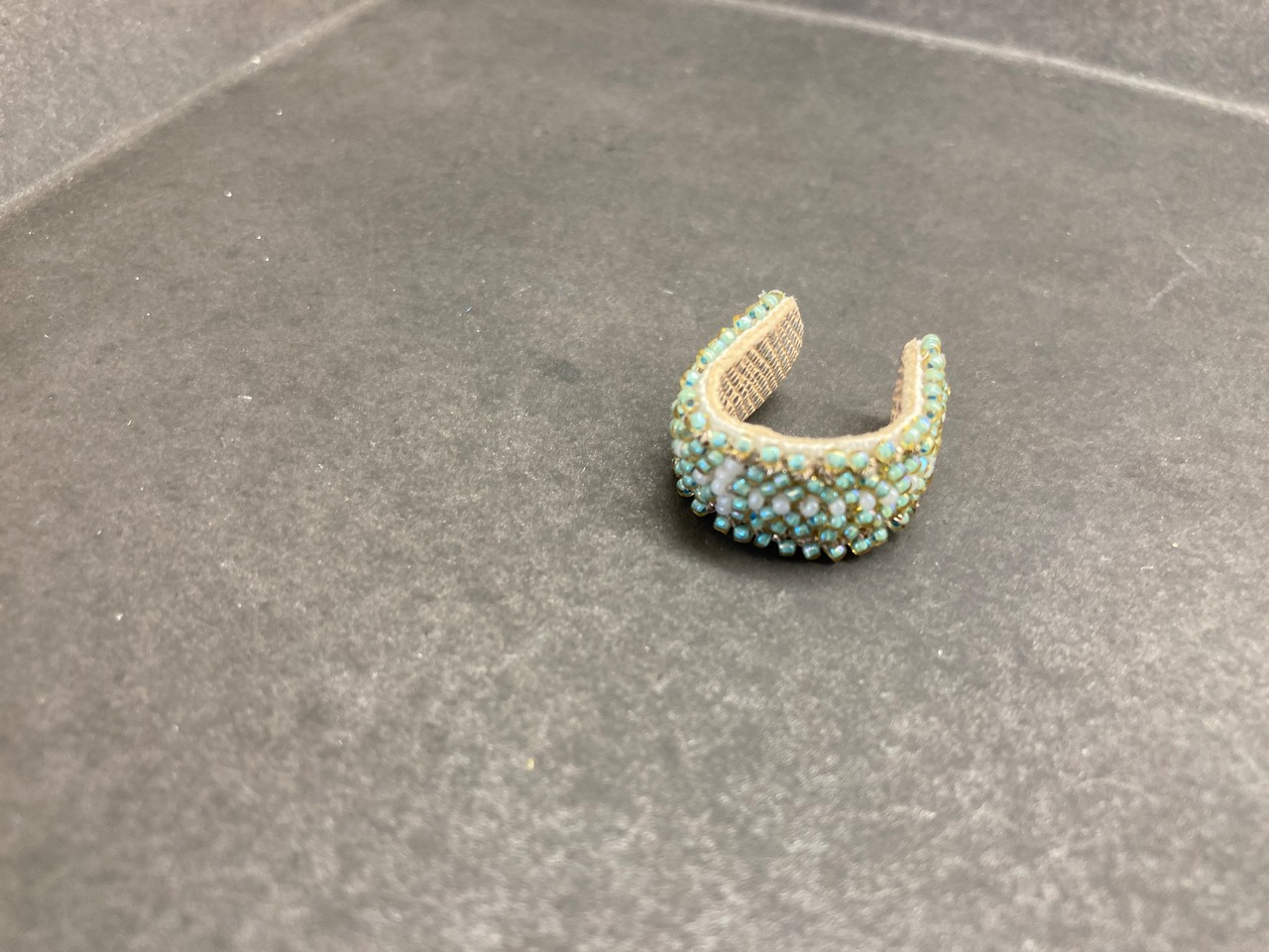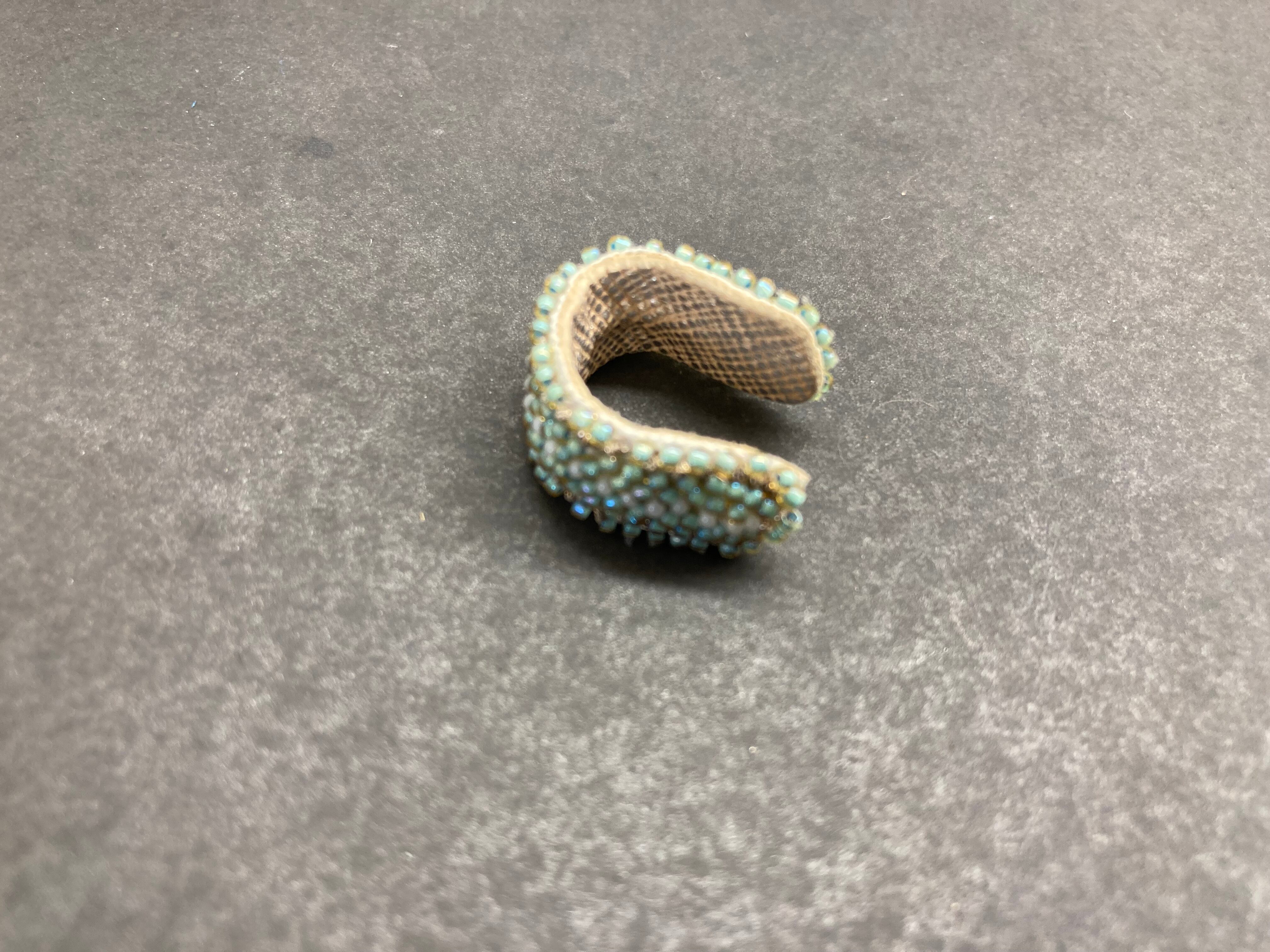 ひと針ひと針、ビーズを刺して作品に仕立てています。