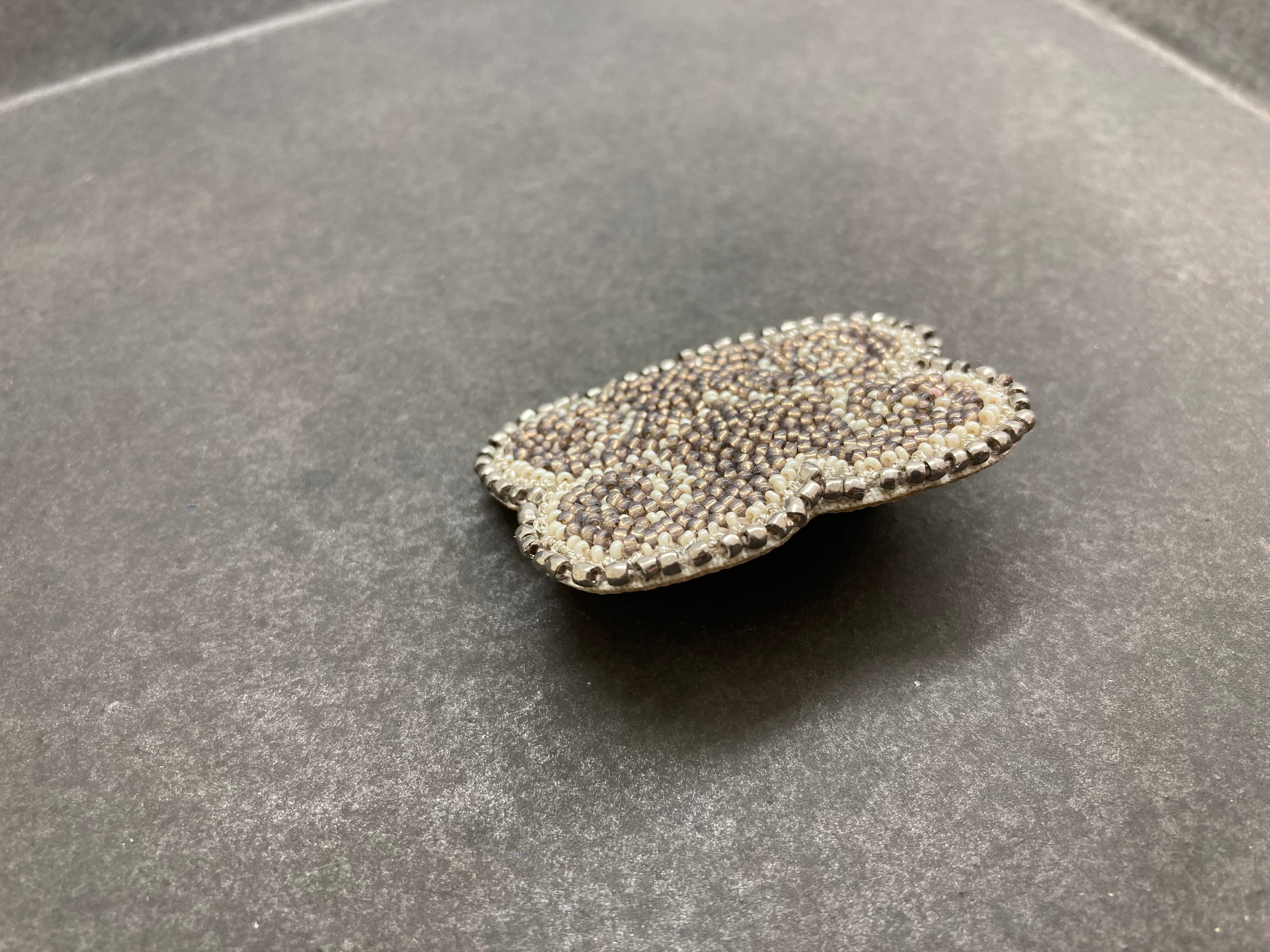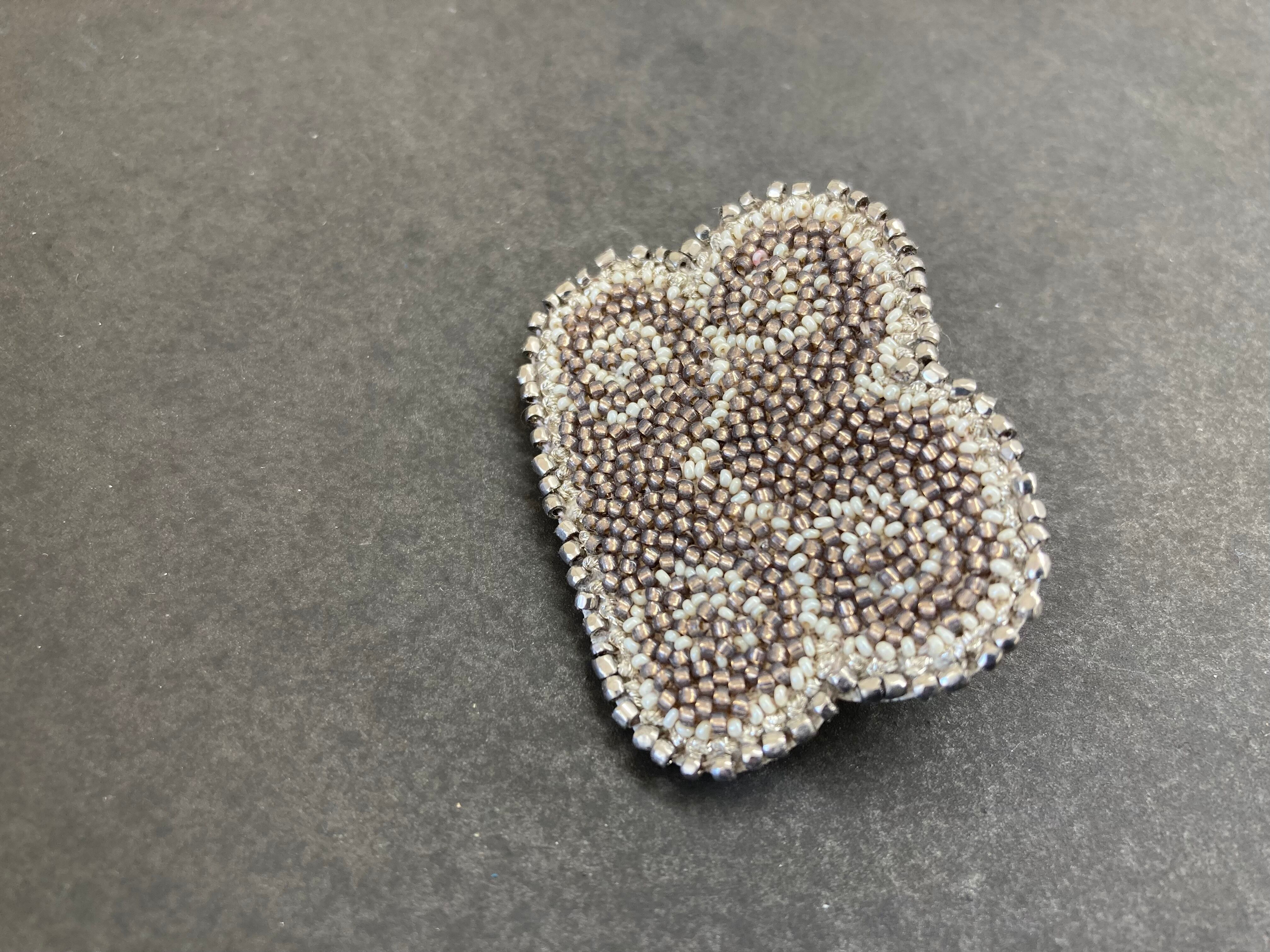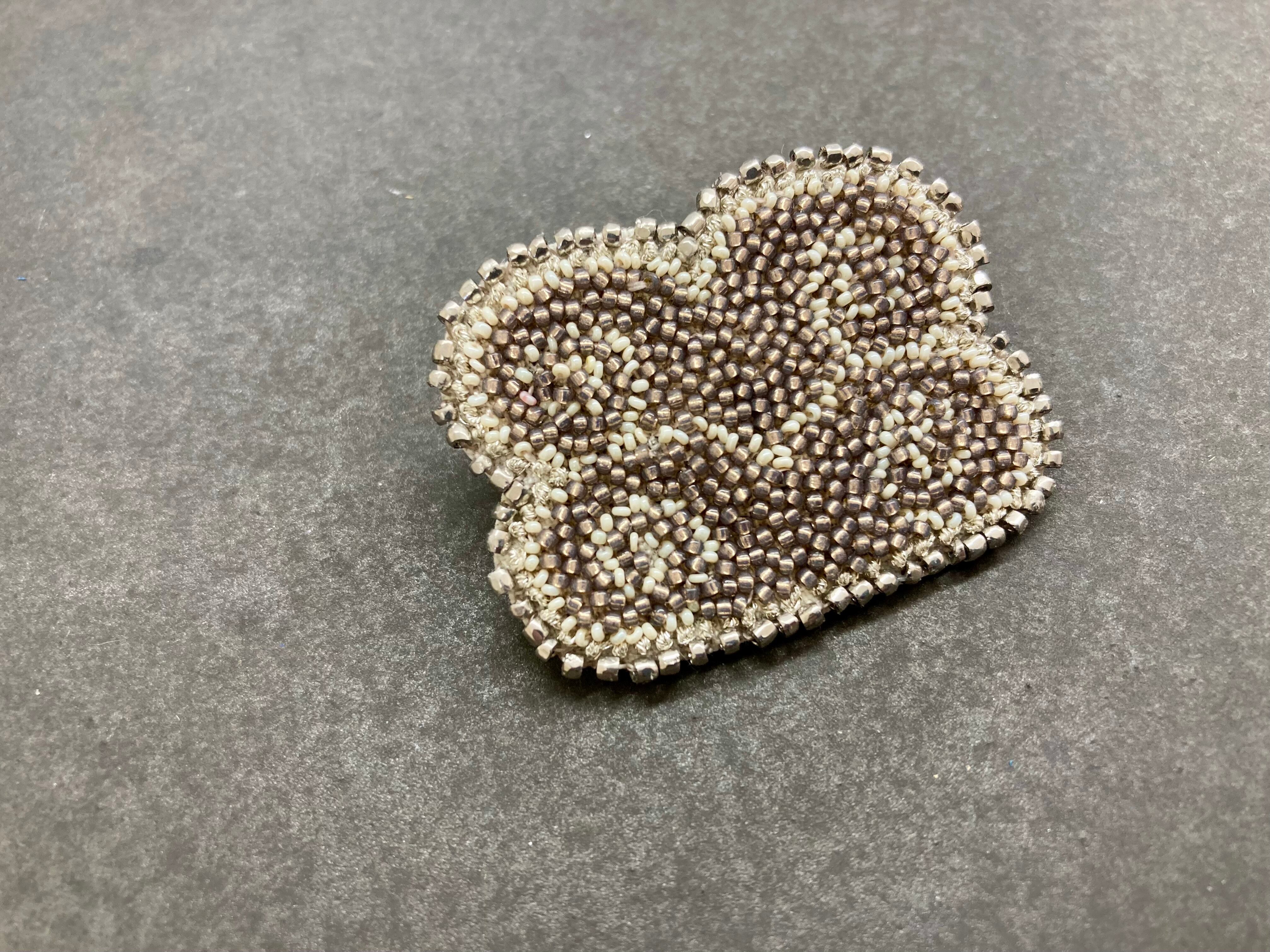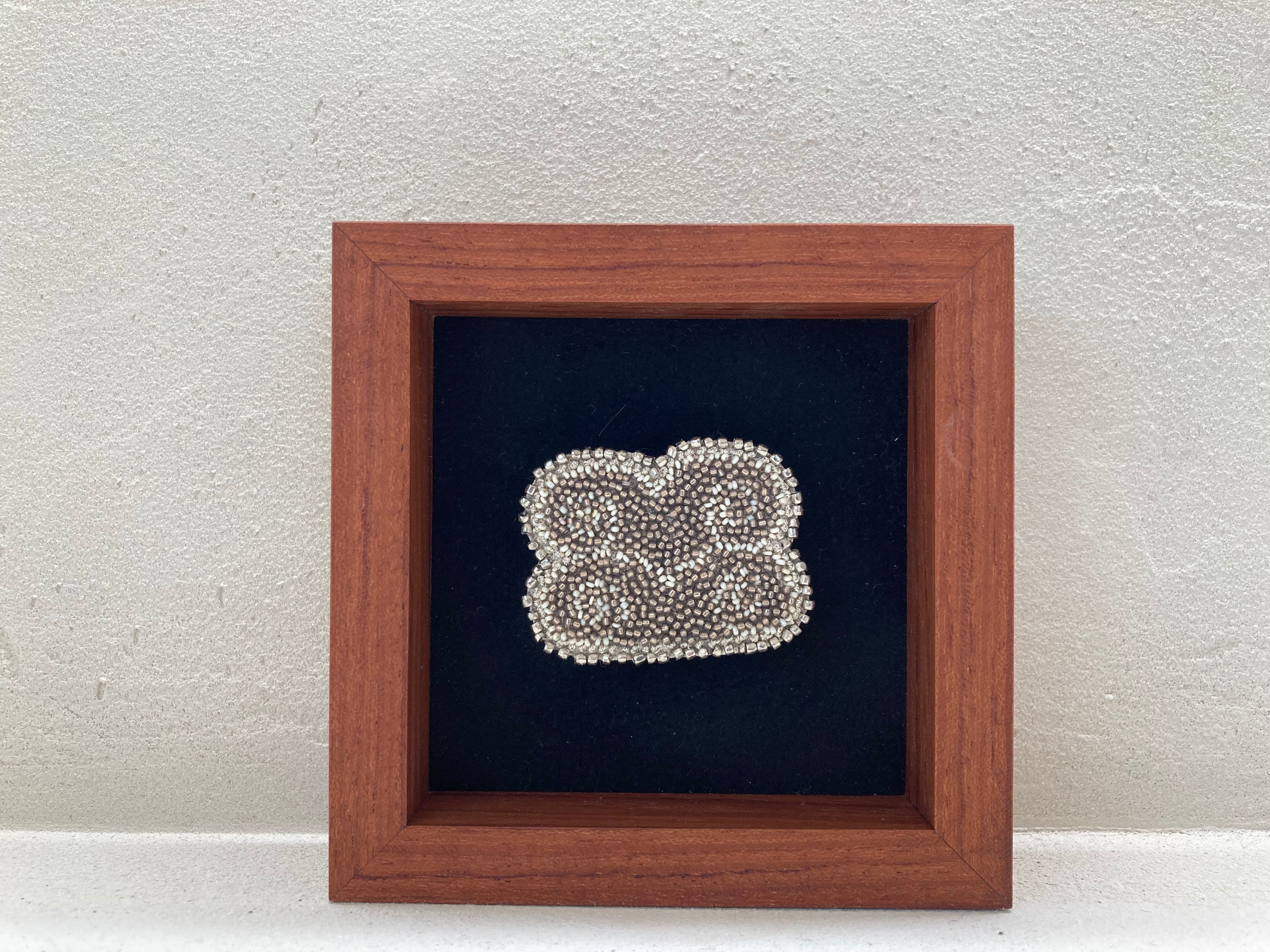 ひと針ひと針、ビーズを刺して作品に仕立てています。