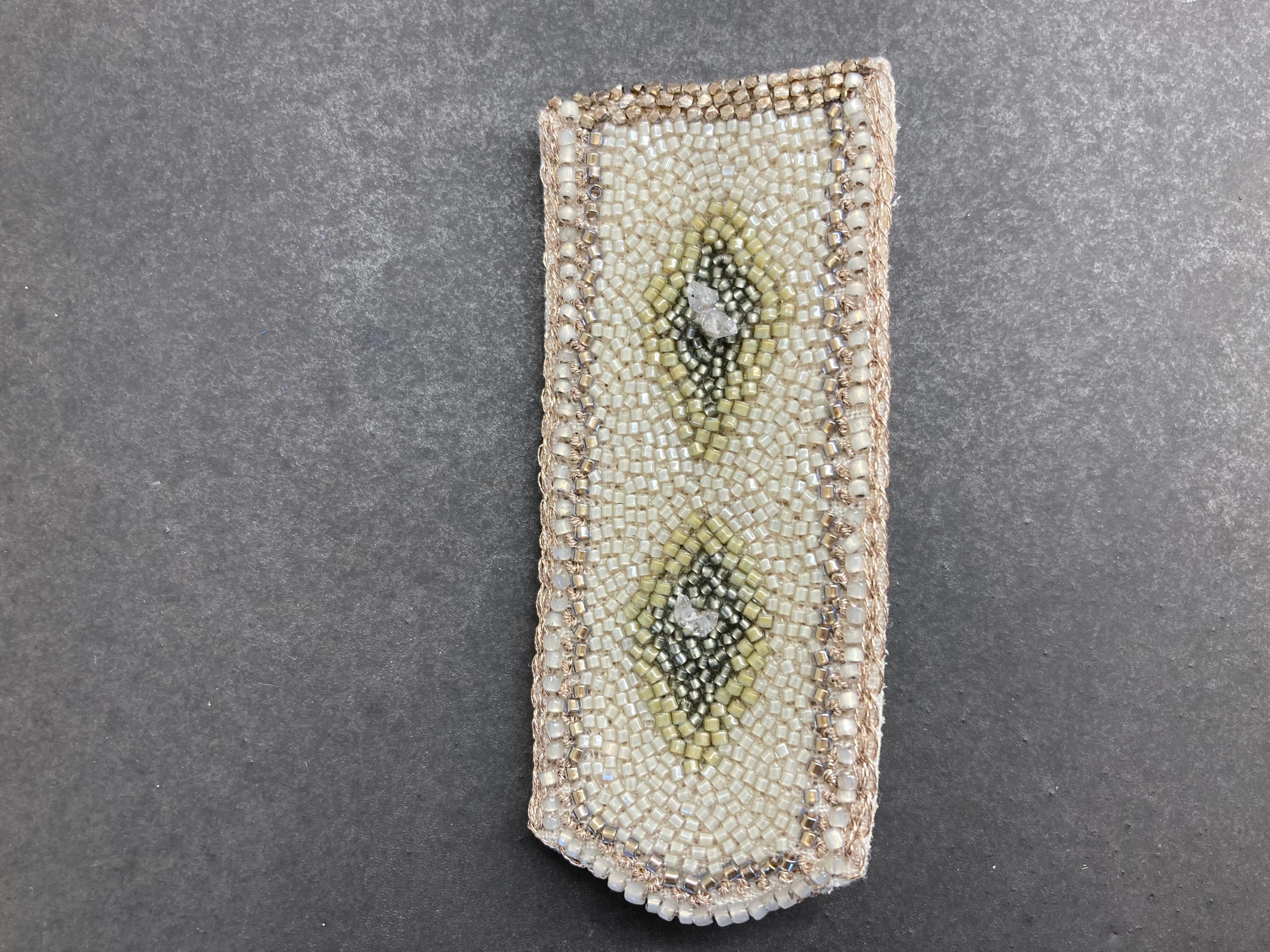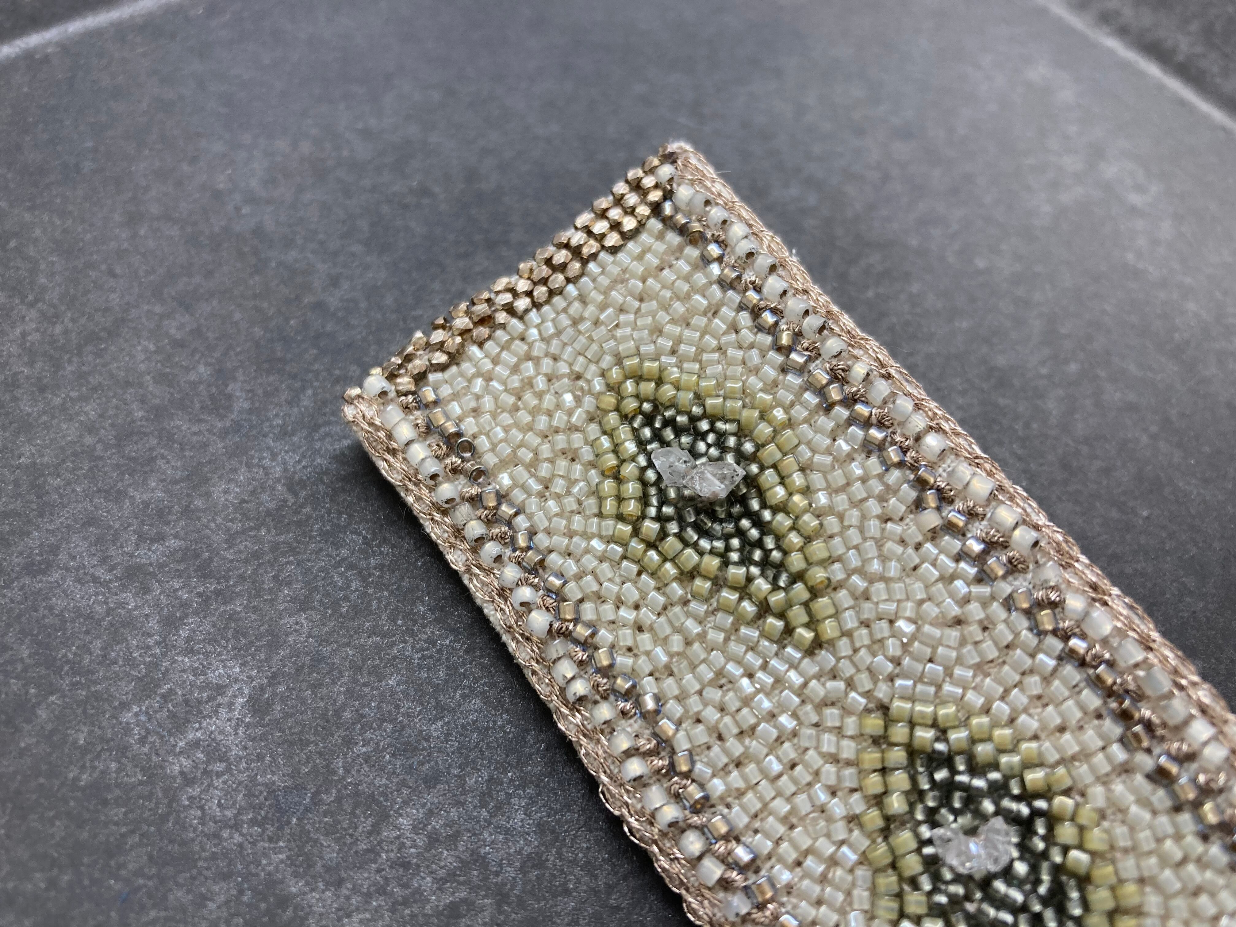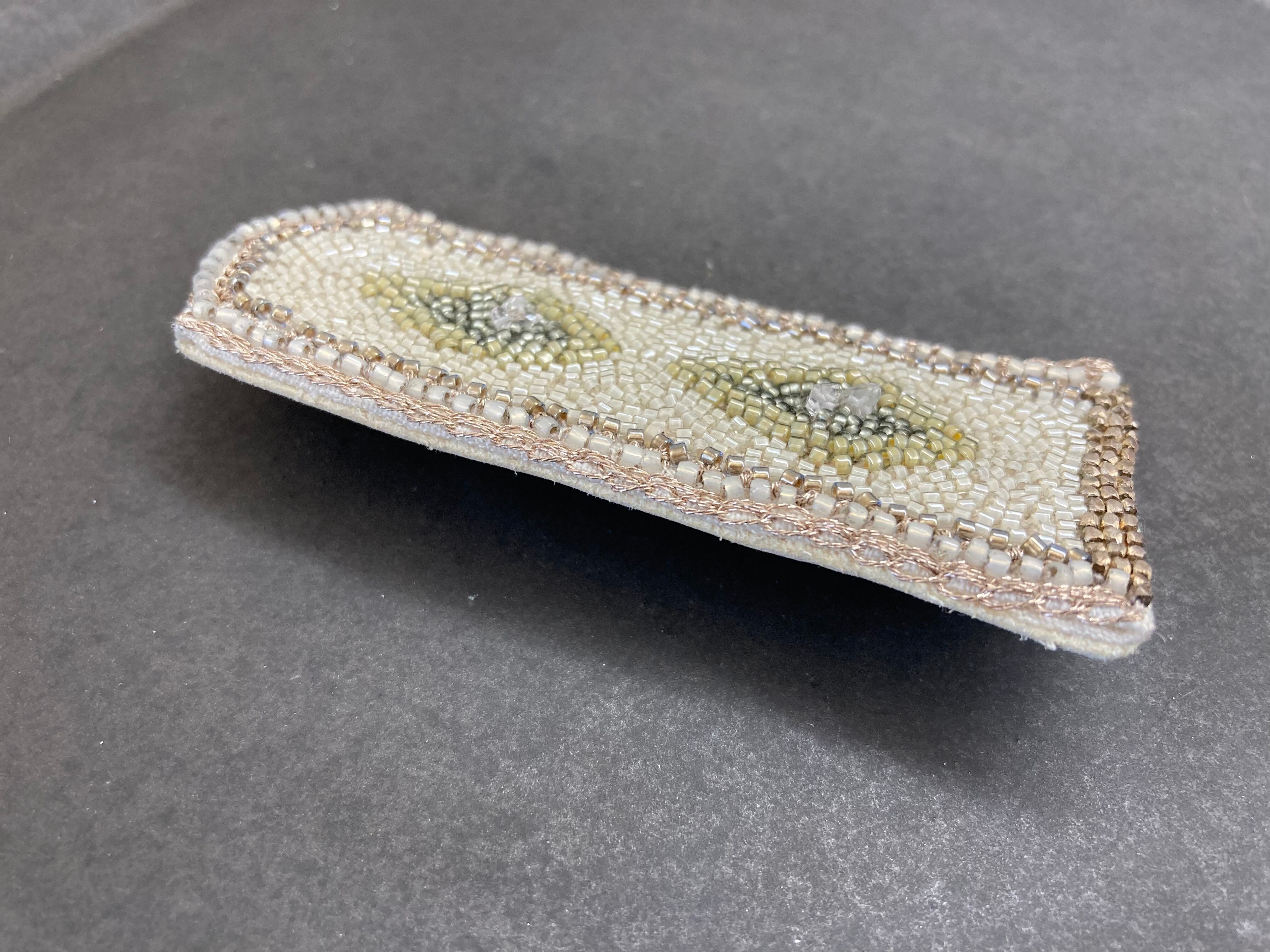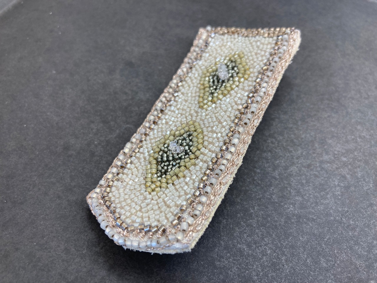 ひと針ひと針、ビーズを刺して作品に仕立てています。