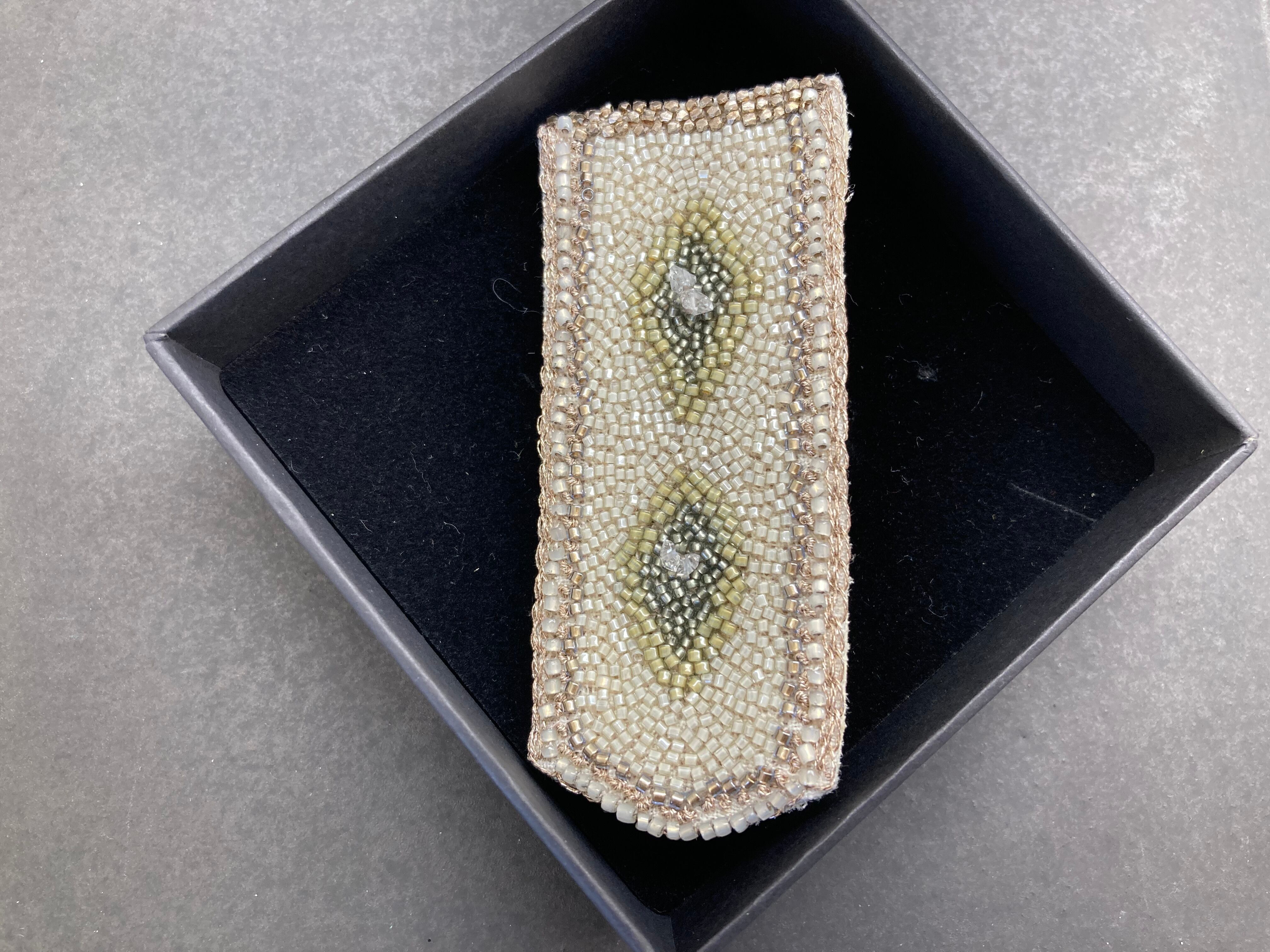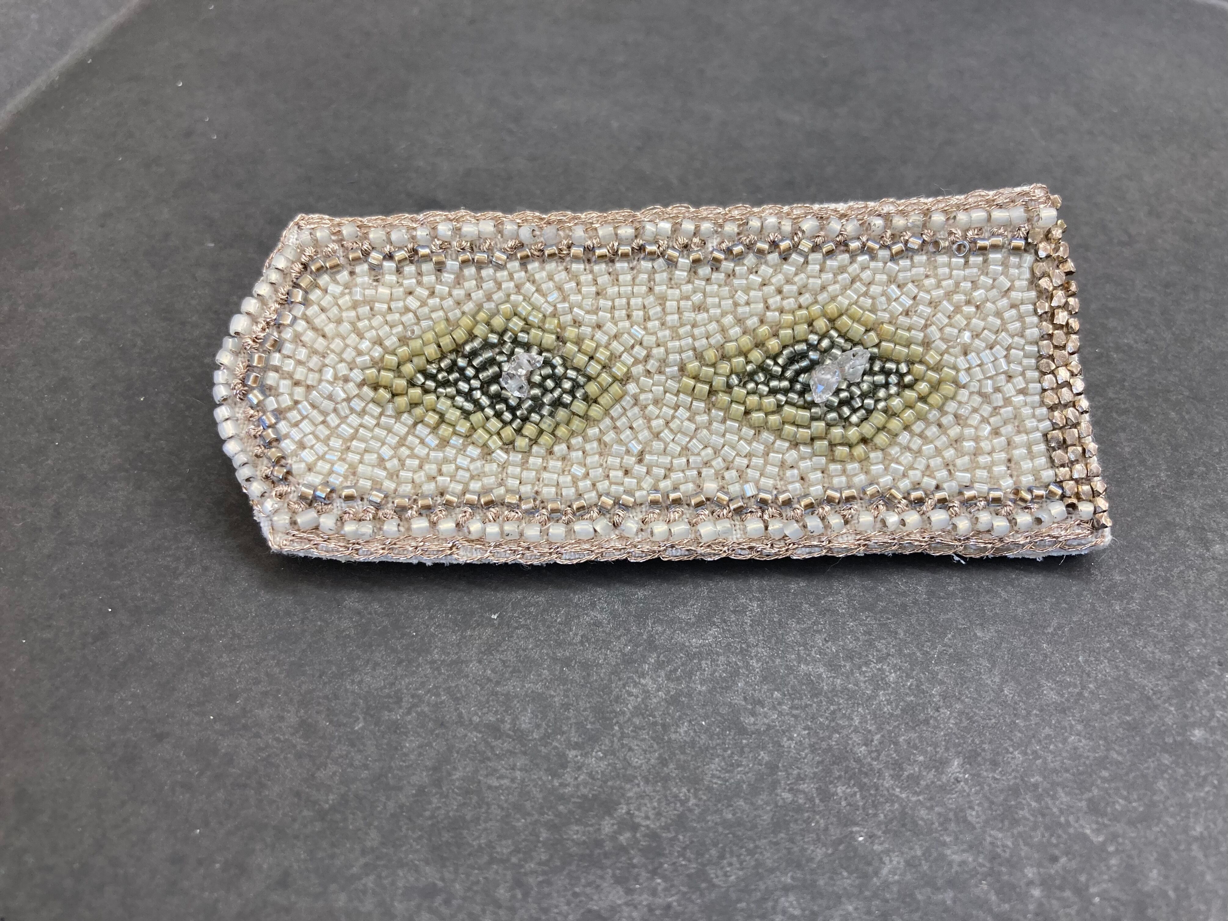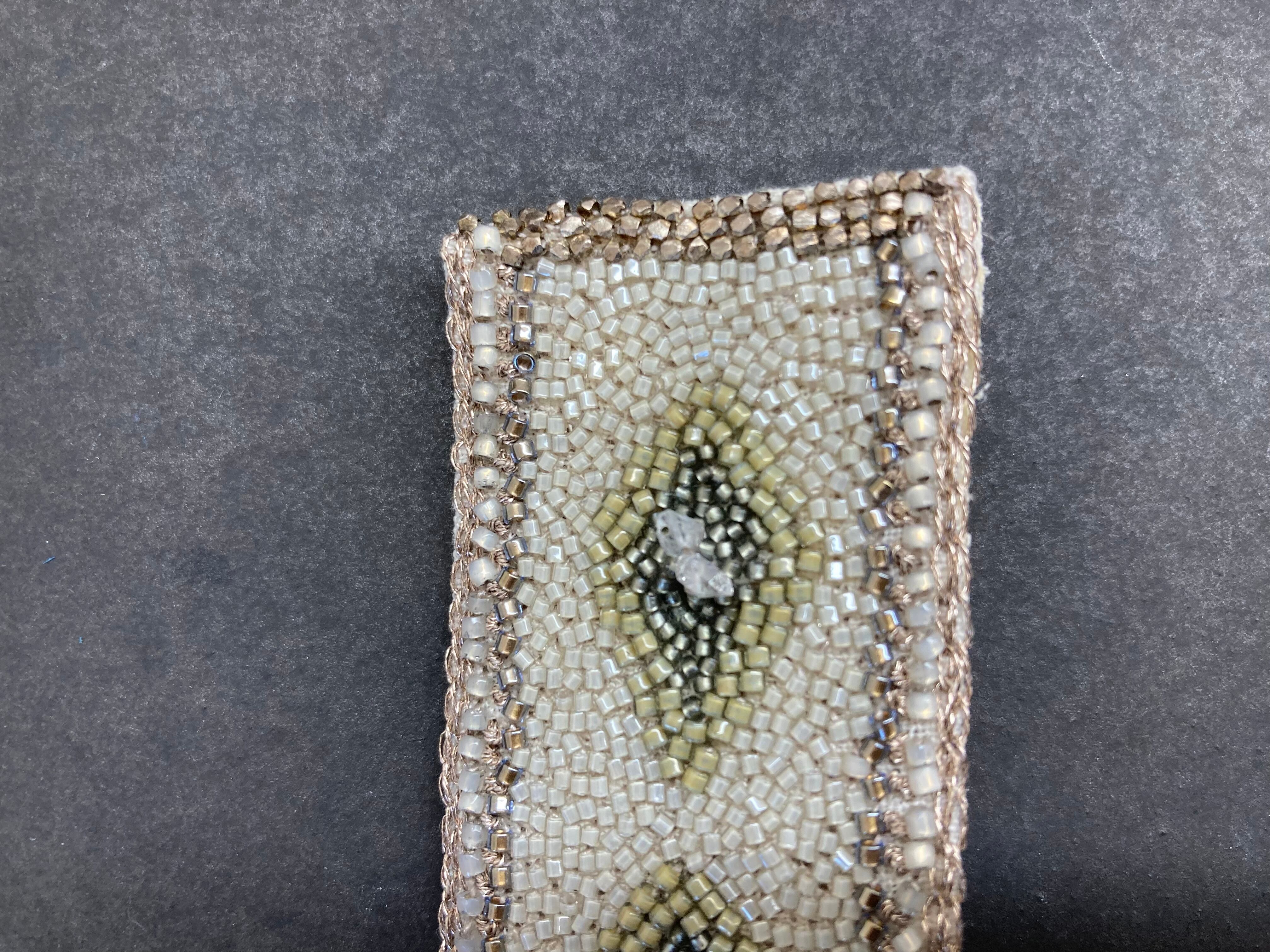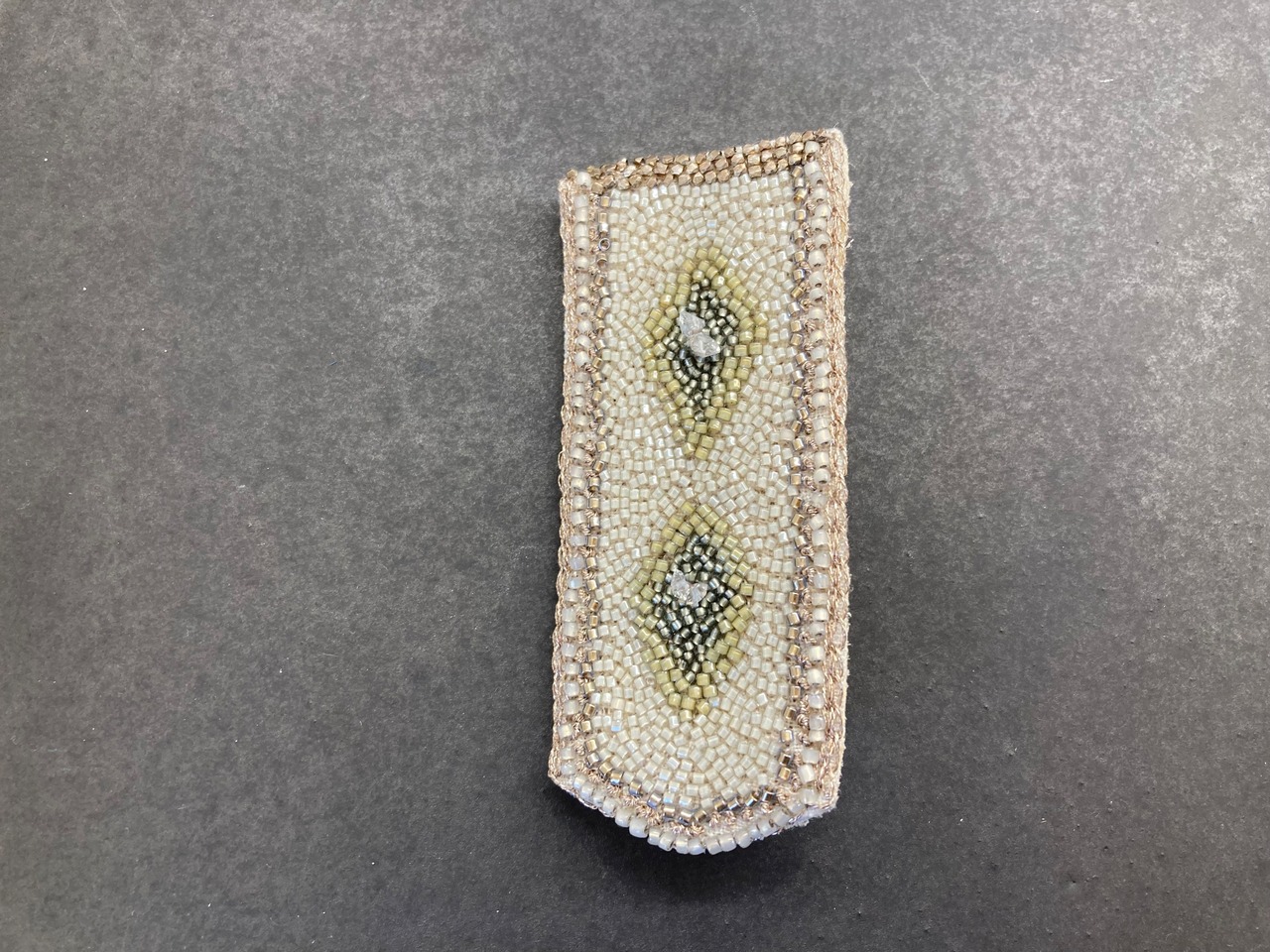 ひと針ひと針、ビーズを刺して作品に仕立てています。