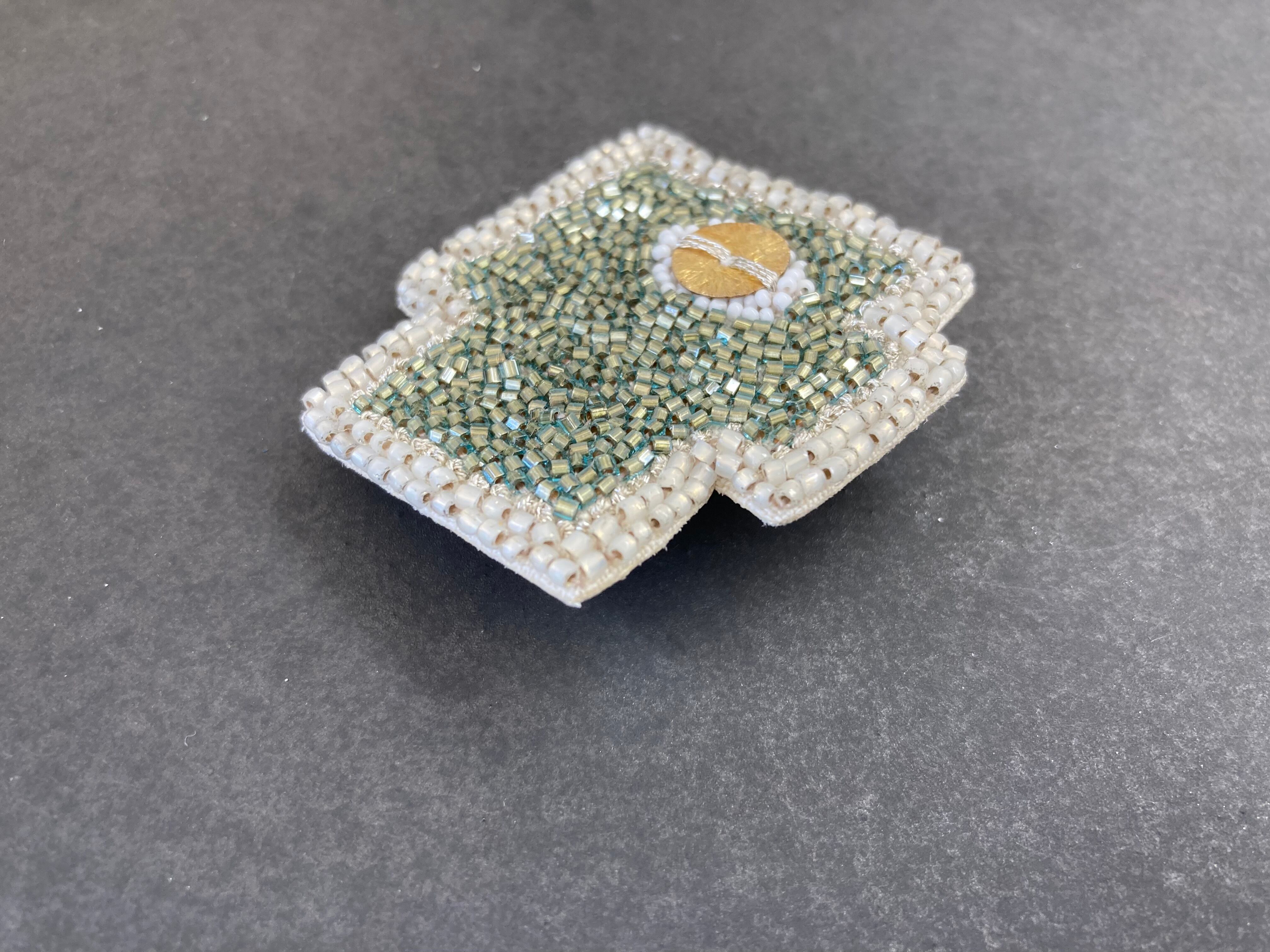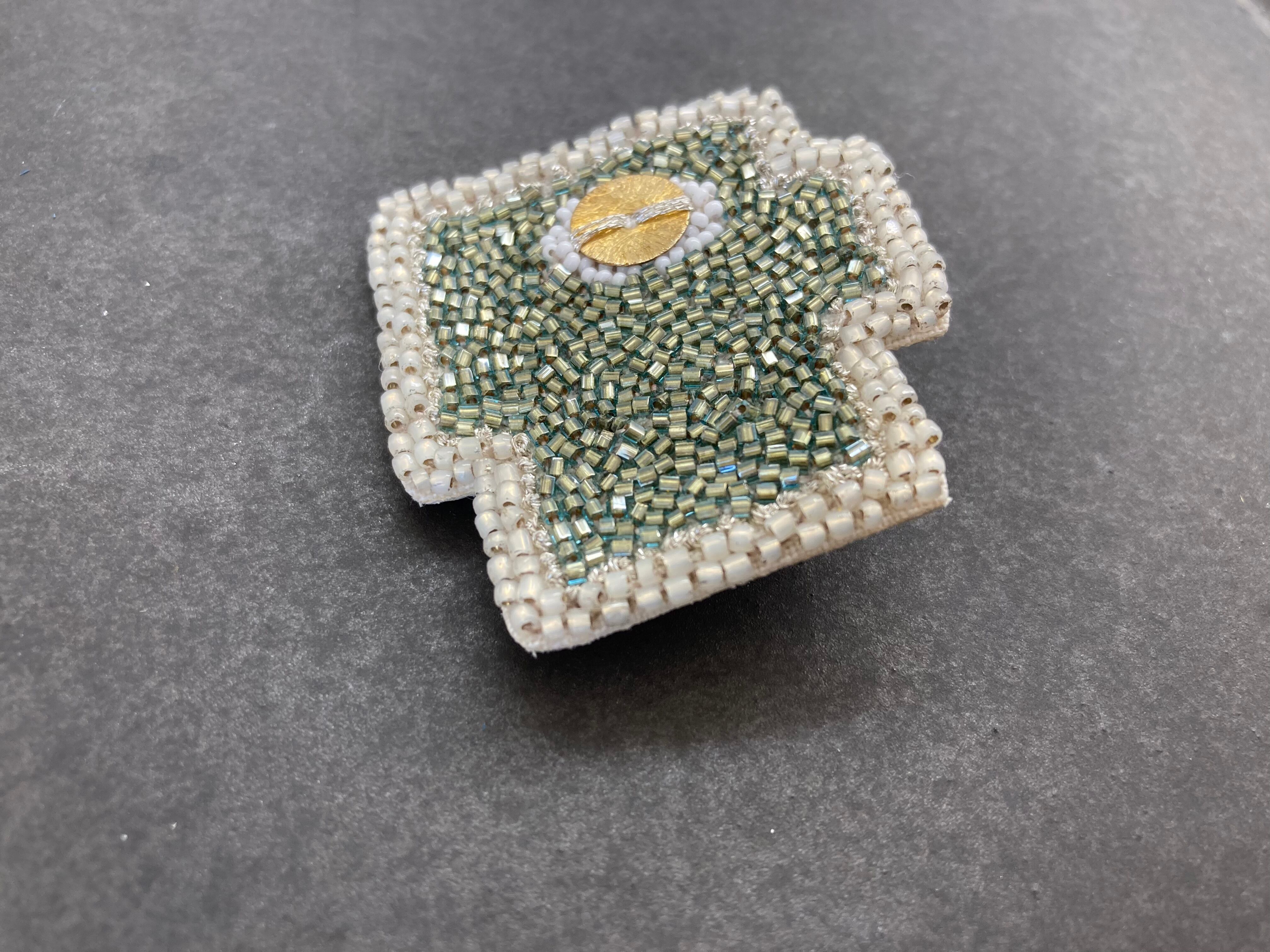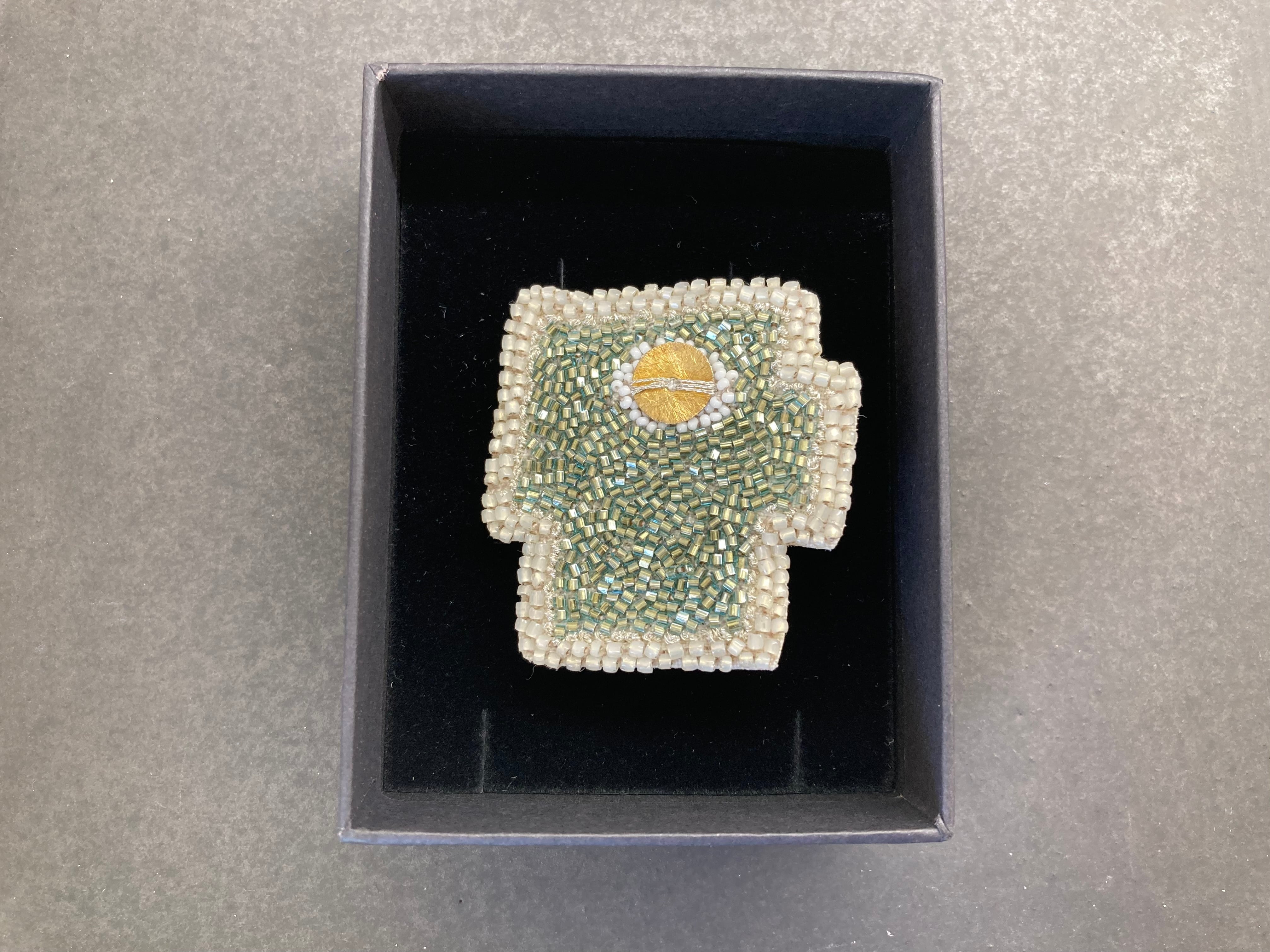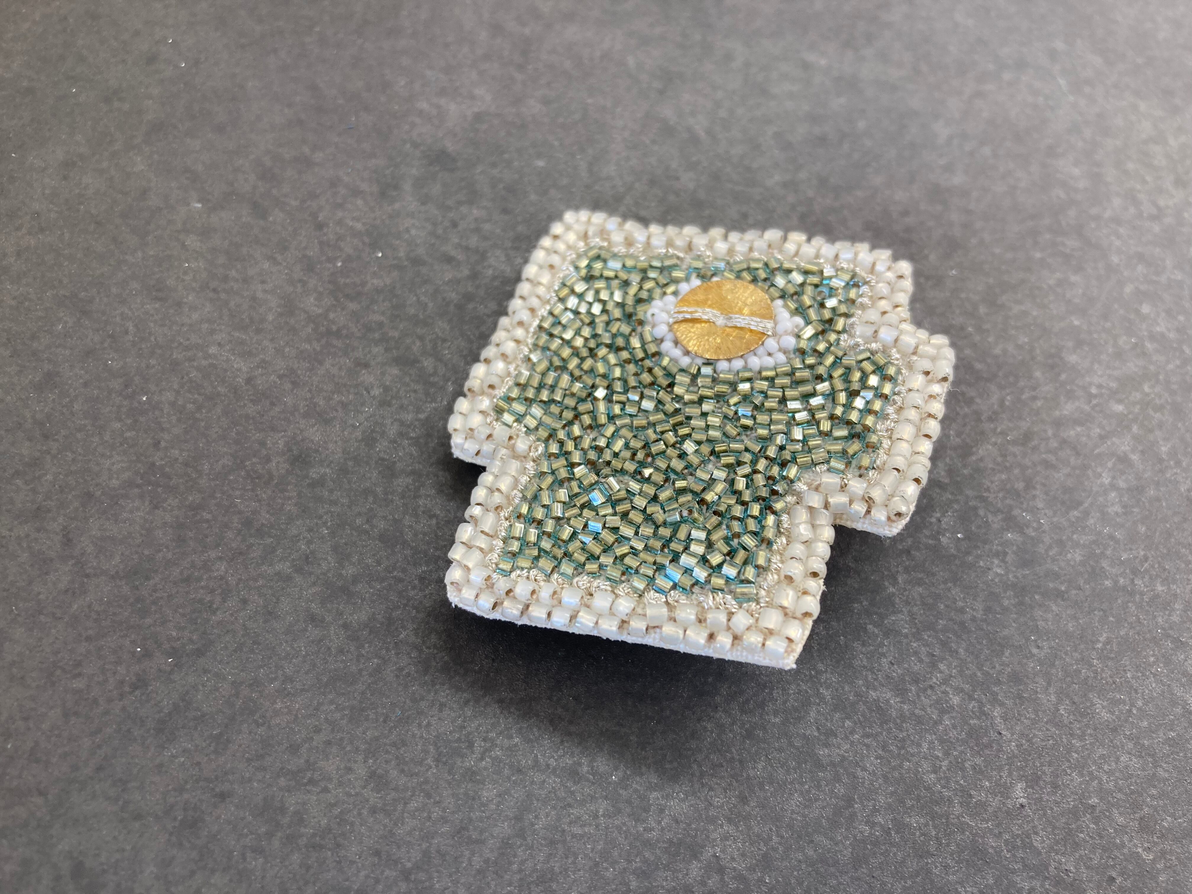 ひと針ひと針、ビーズを刺して作品に仕立てています。