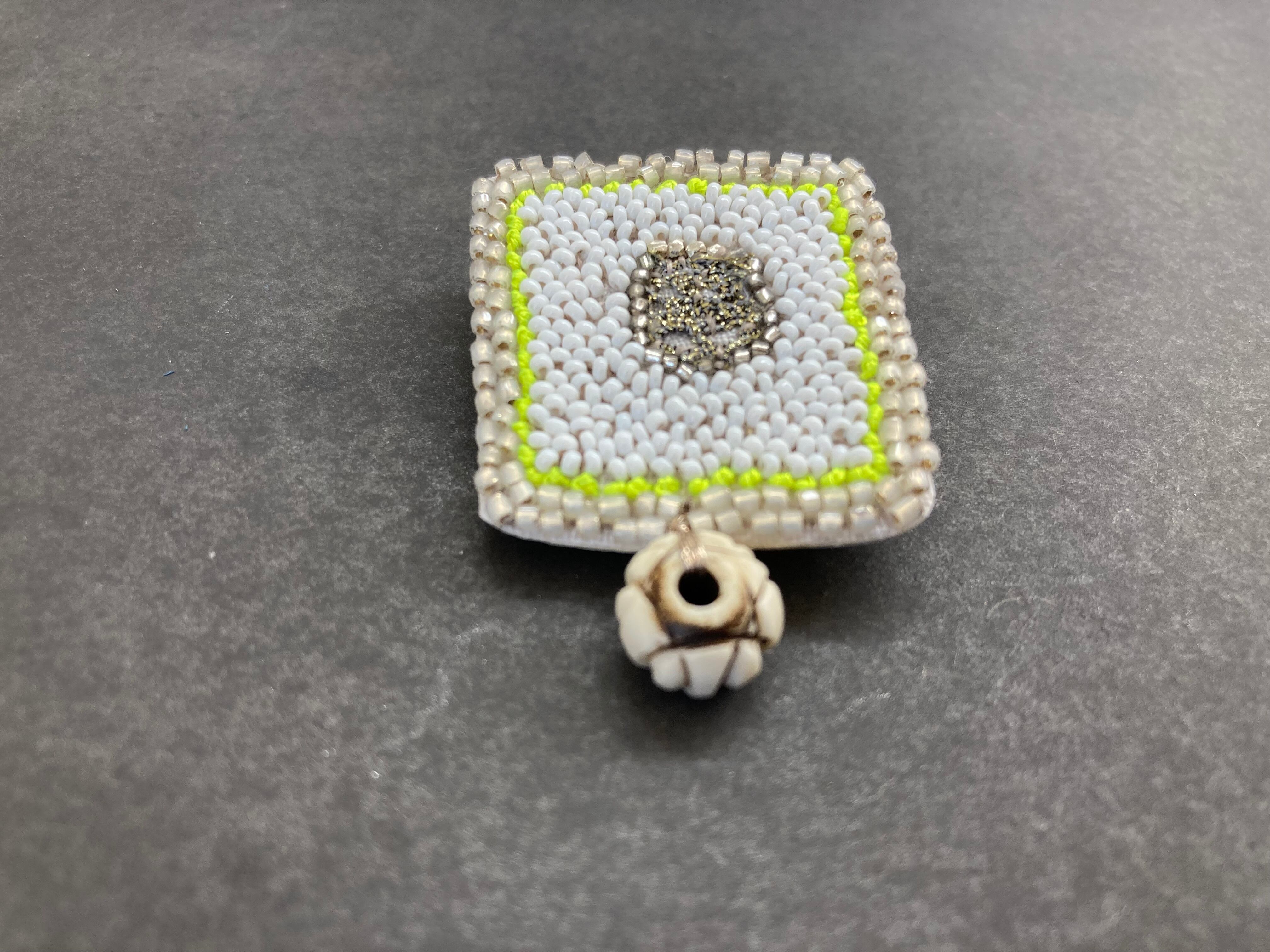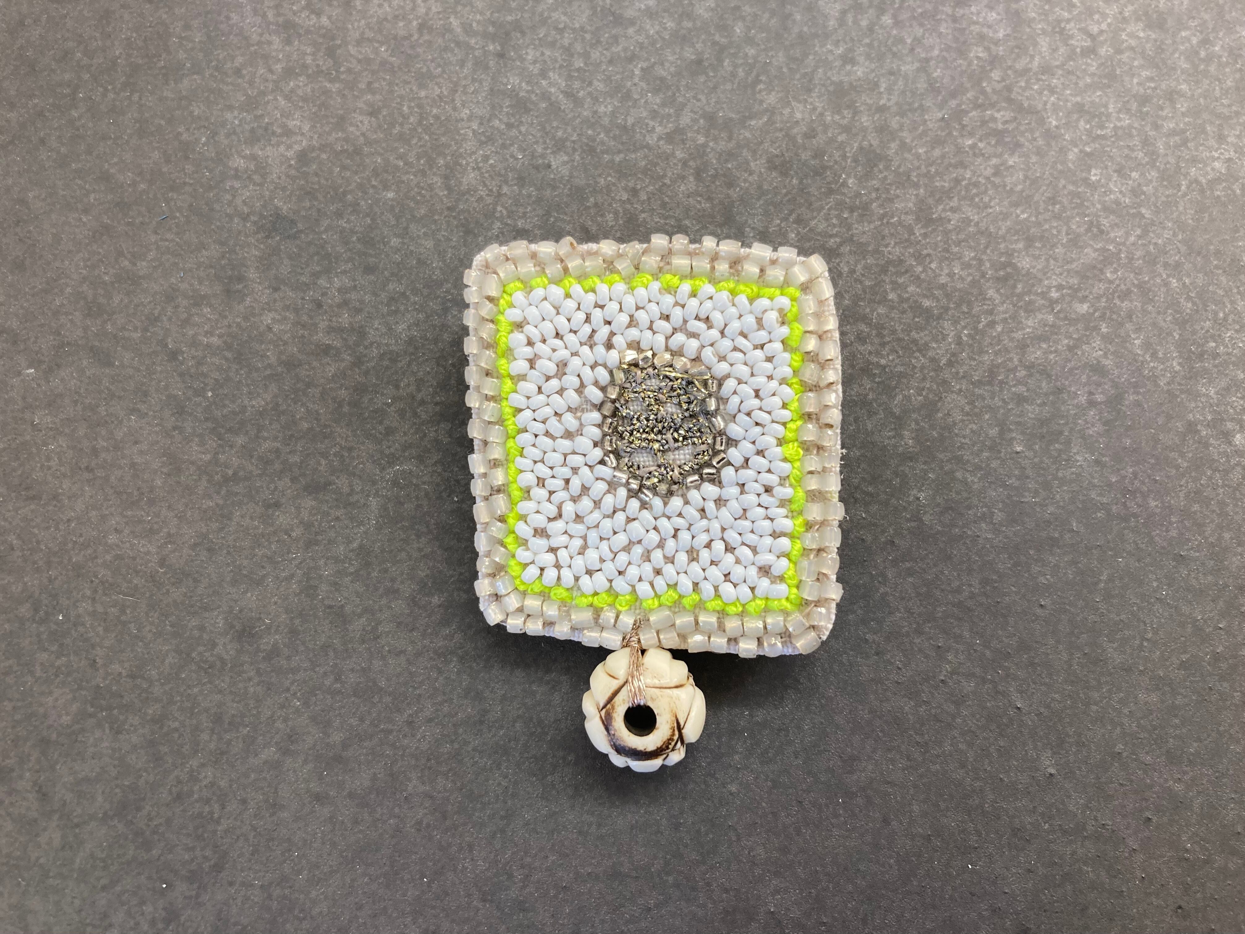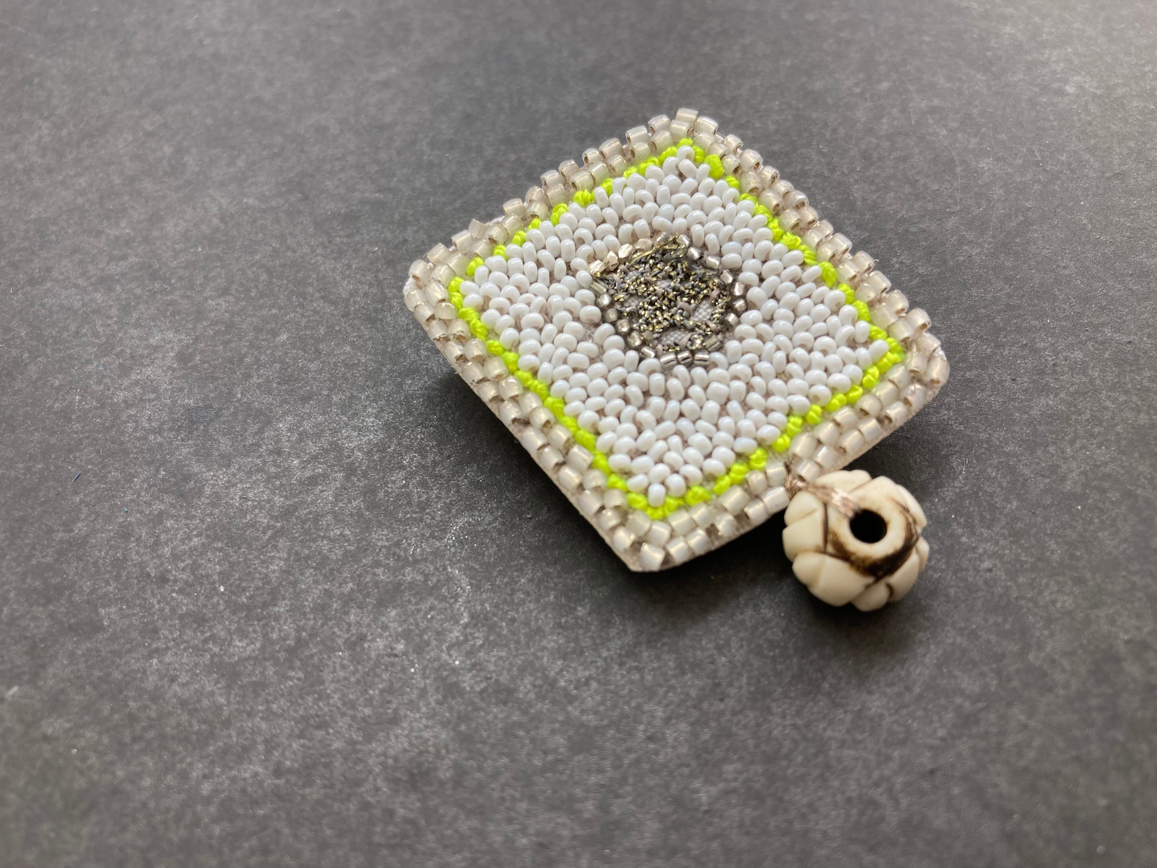 ひと針ひと針、ビーズを刺して作品に仕立てています。