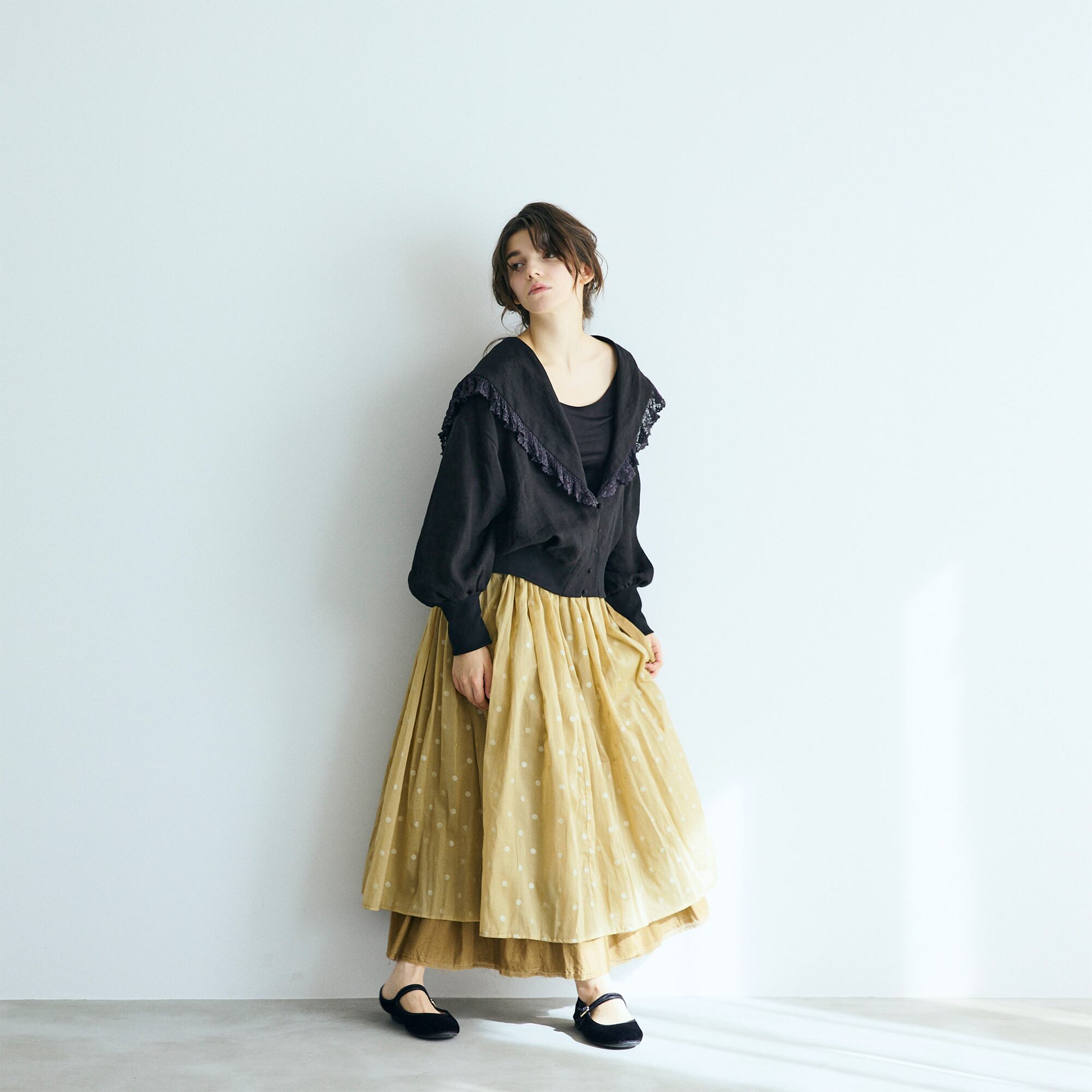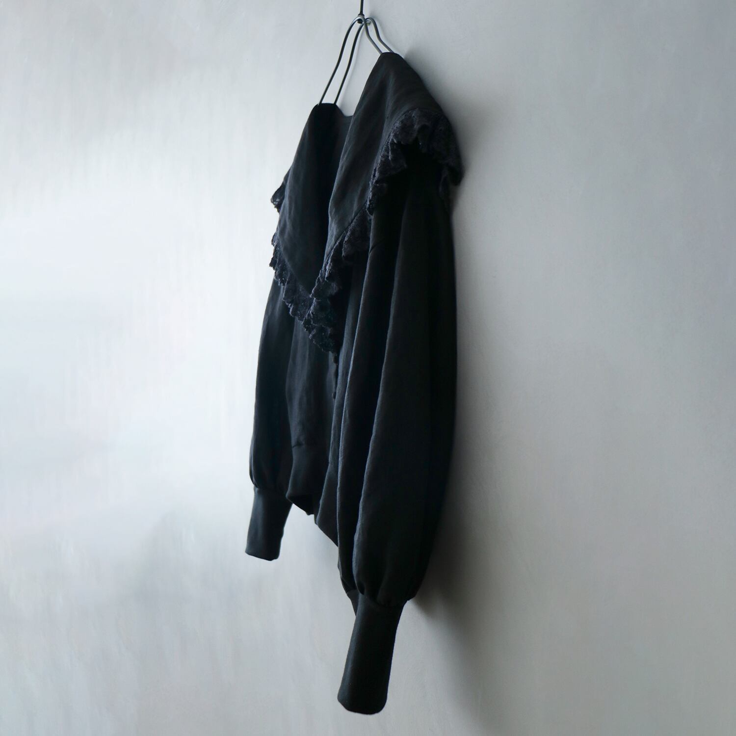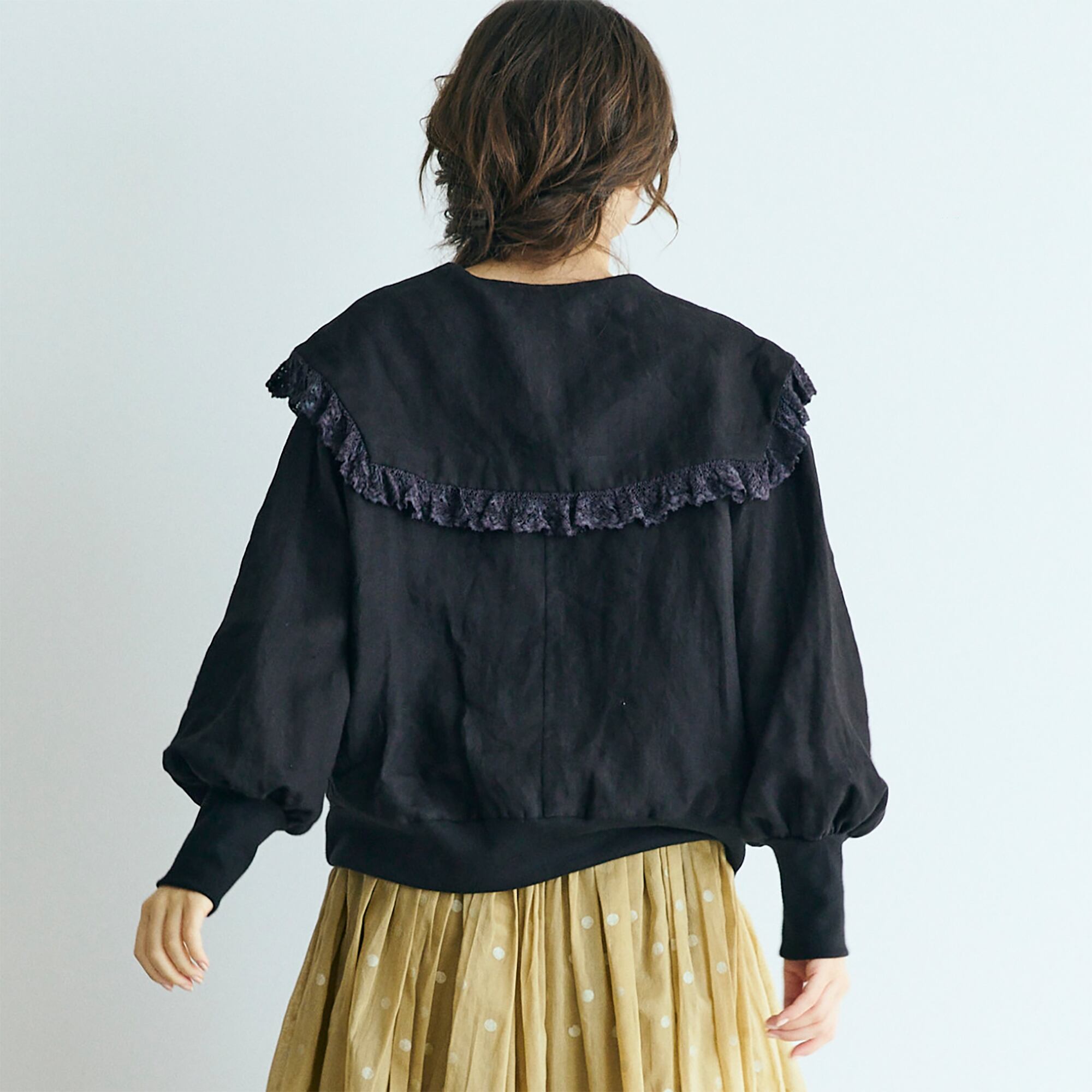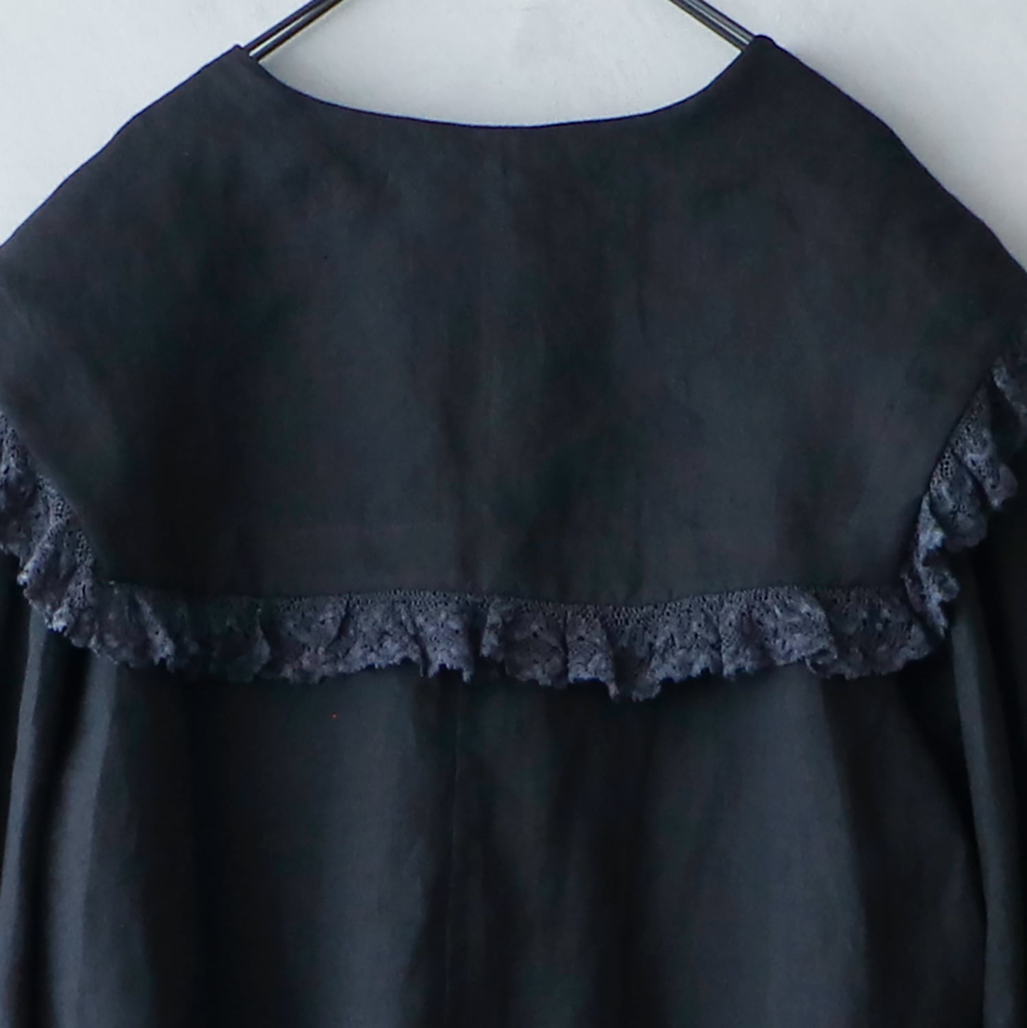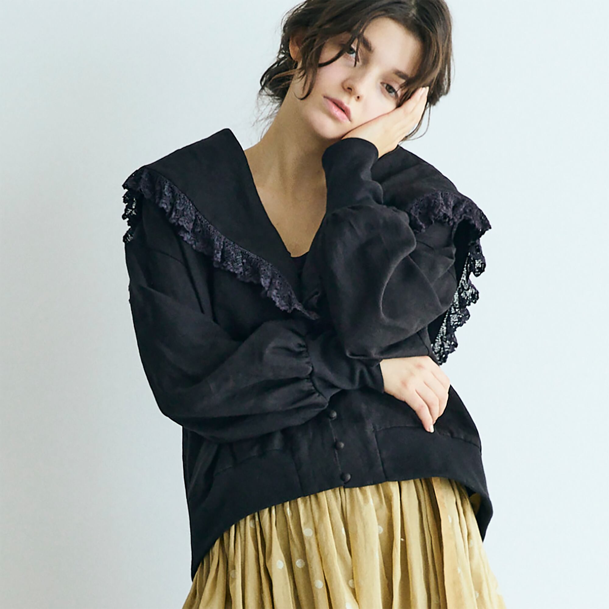クラシックなセーラーカラーを思わせる広めの襟は、顔まわりに柔らかな陰影を生み、レースの透け感が肌にそっと光を落とします。