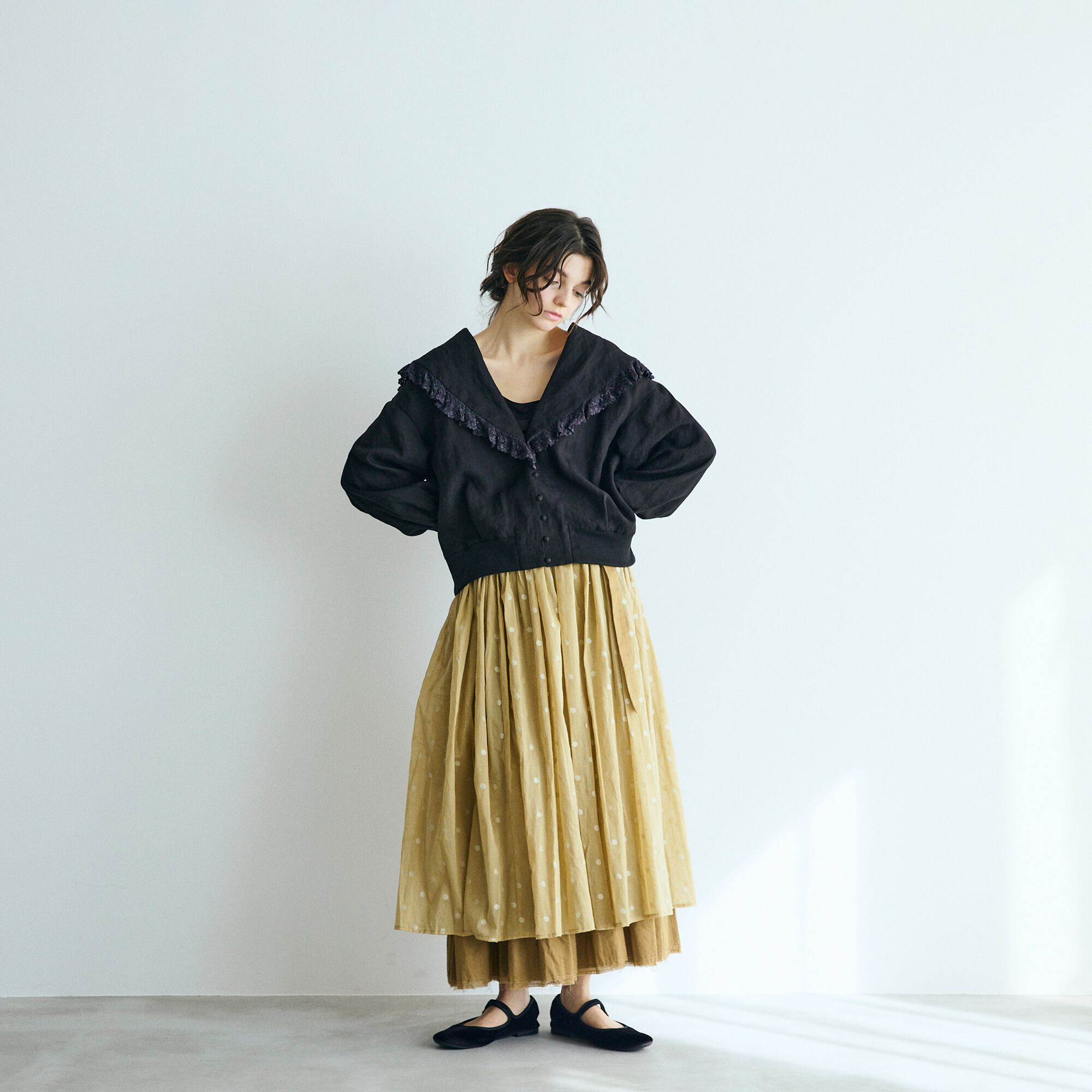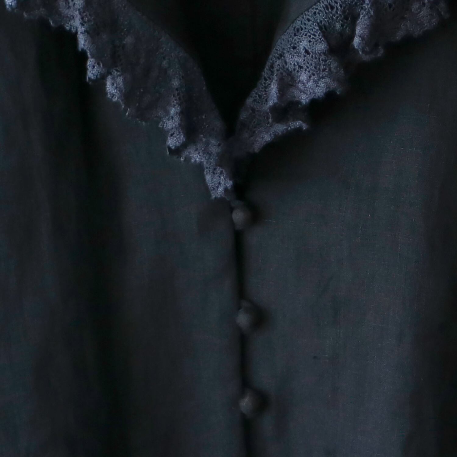 襟元をぐるりと囲む繊細なリネンレースが、どこか懐かしく、