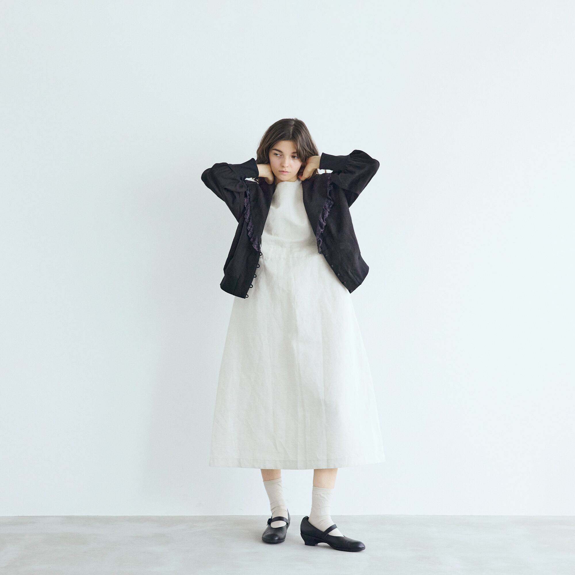 フロントに並んだ小さなくるみボタンは、手仕事の温もりを感じさせながら、控えめな愛らしさを添えています。