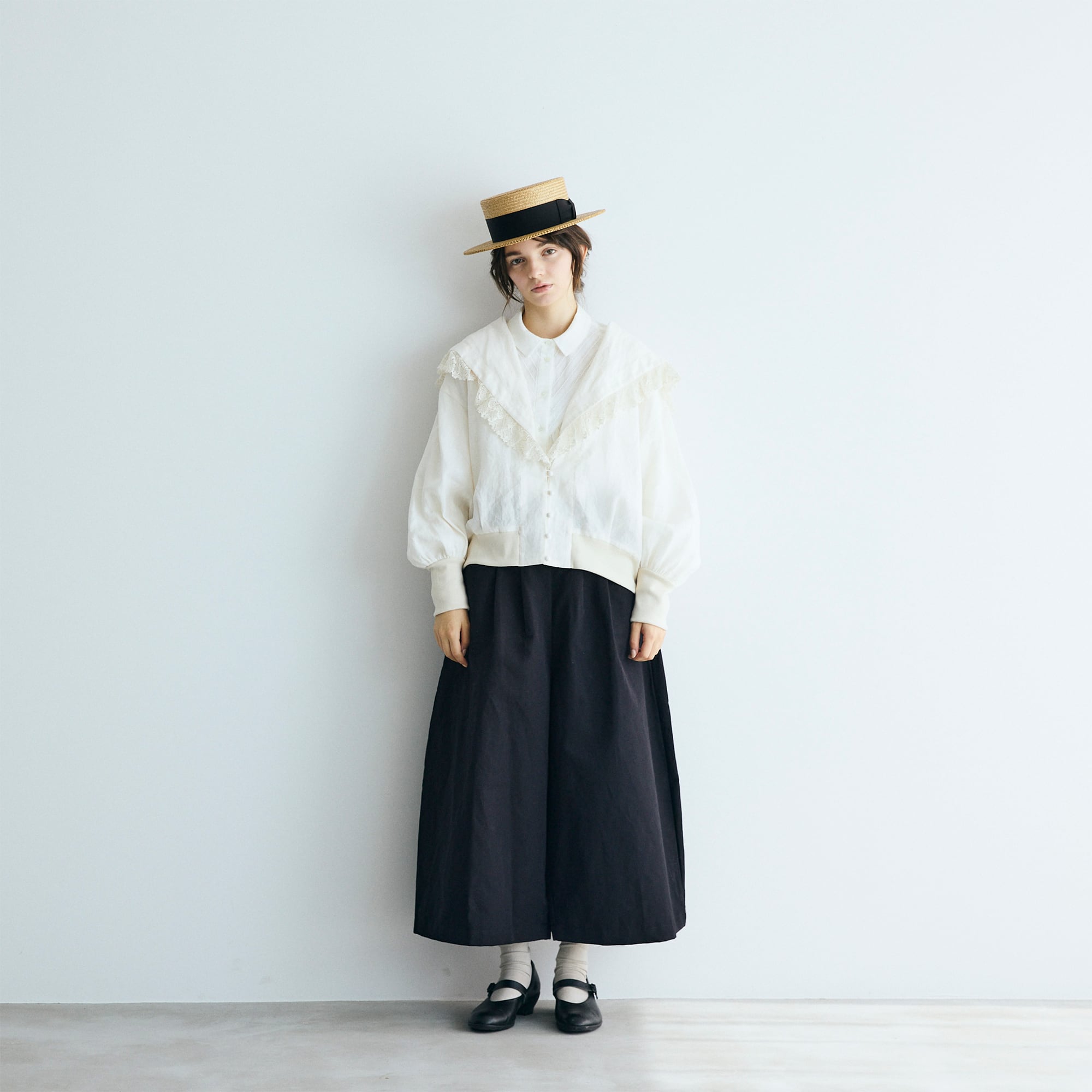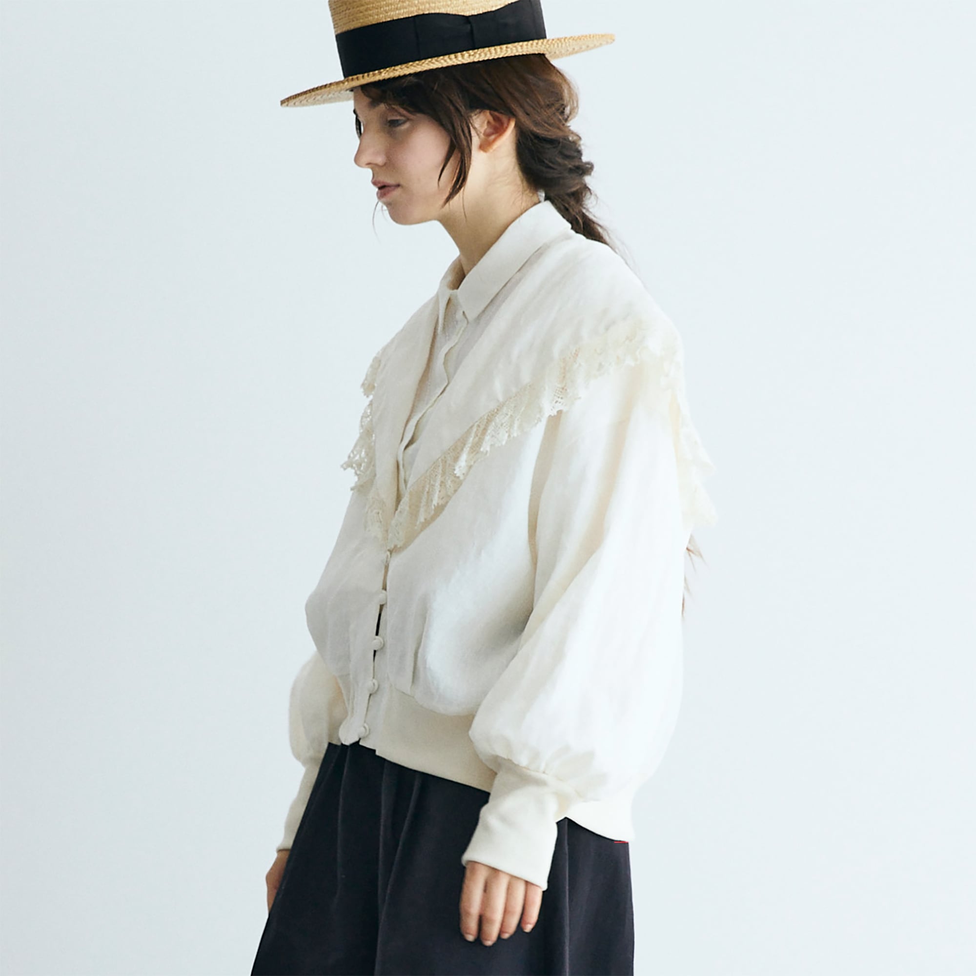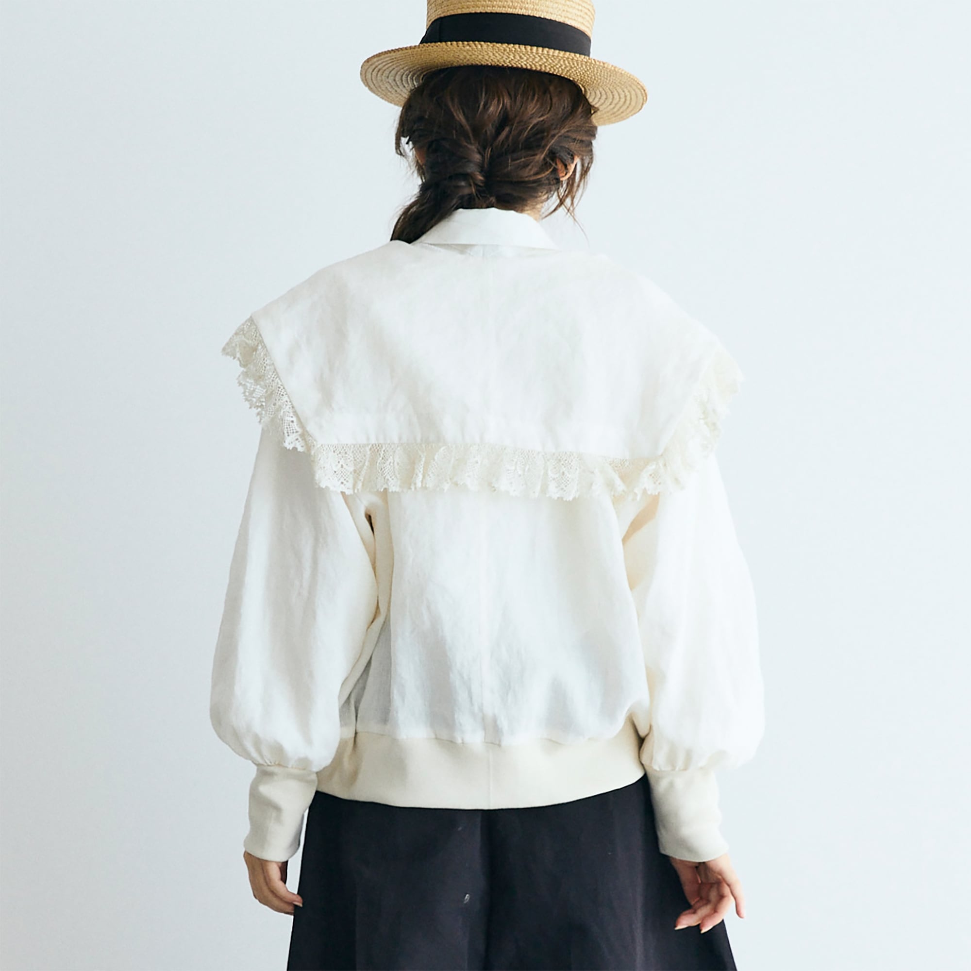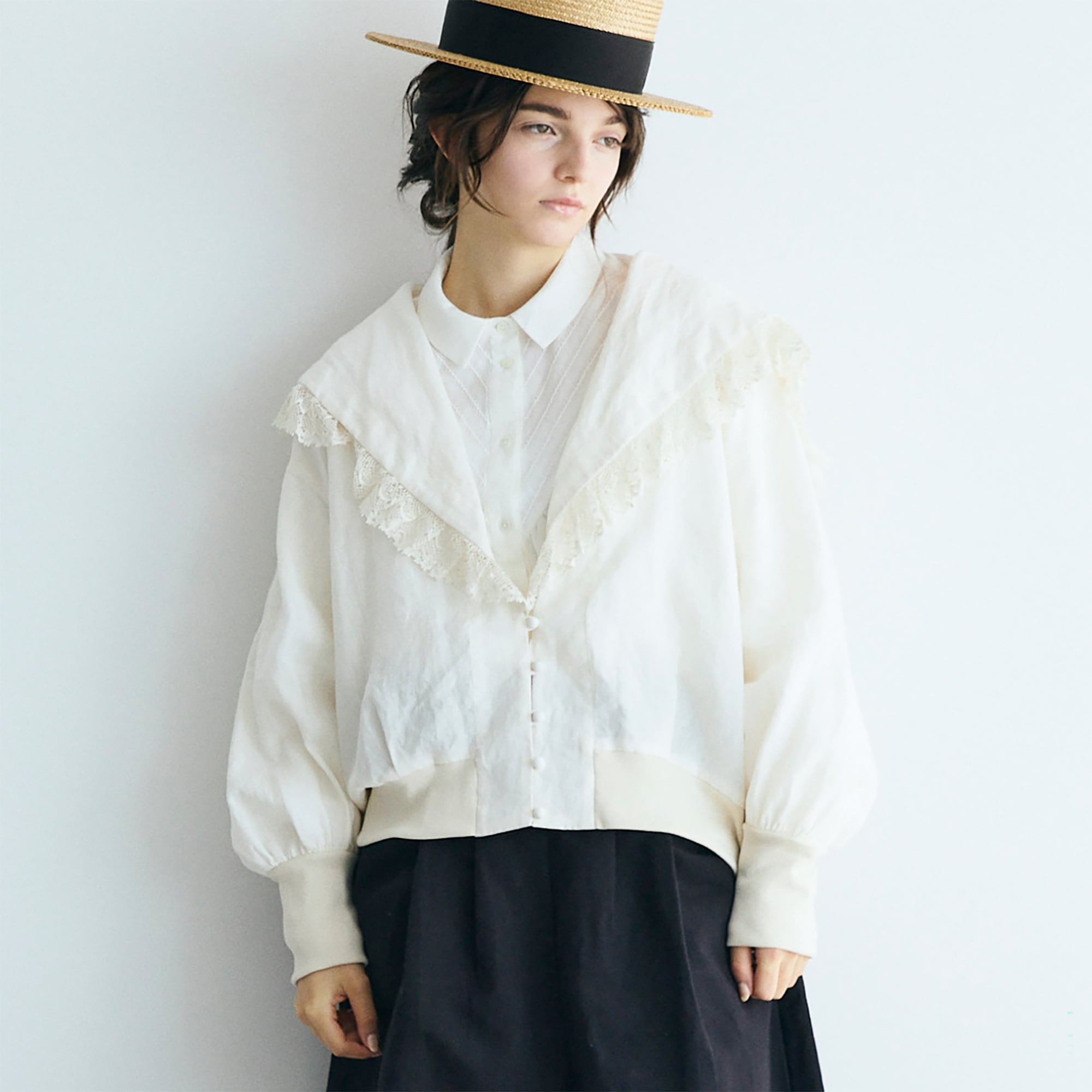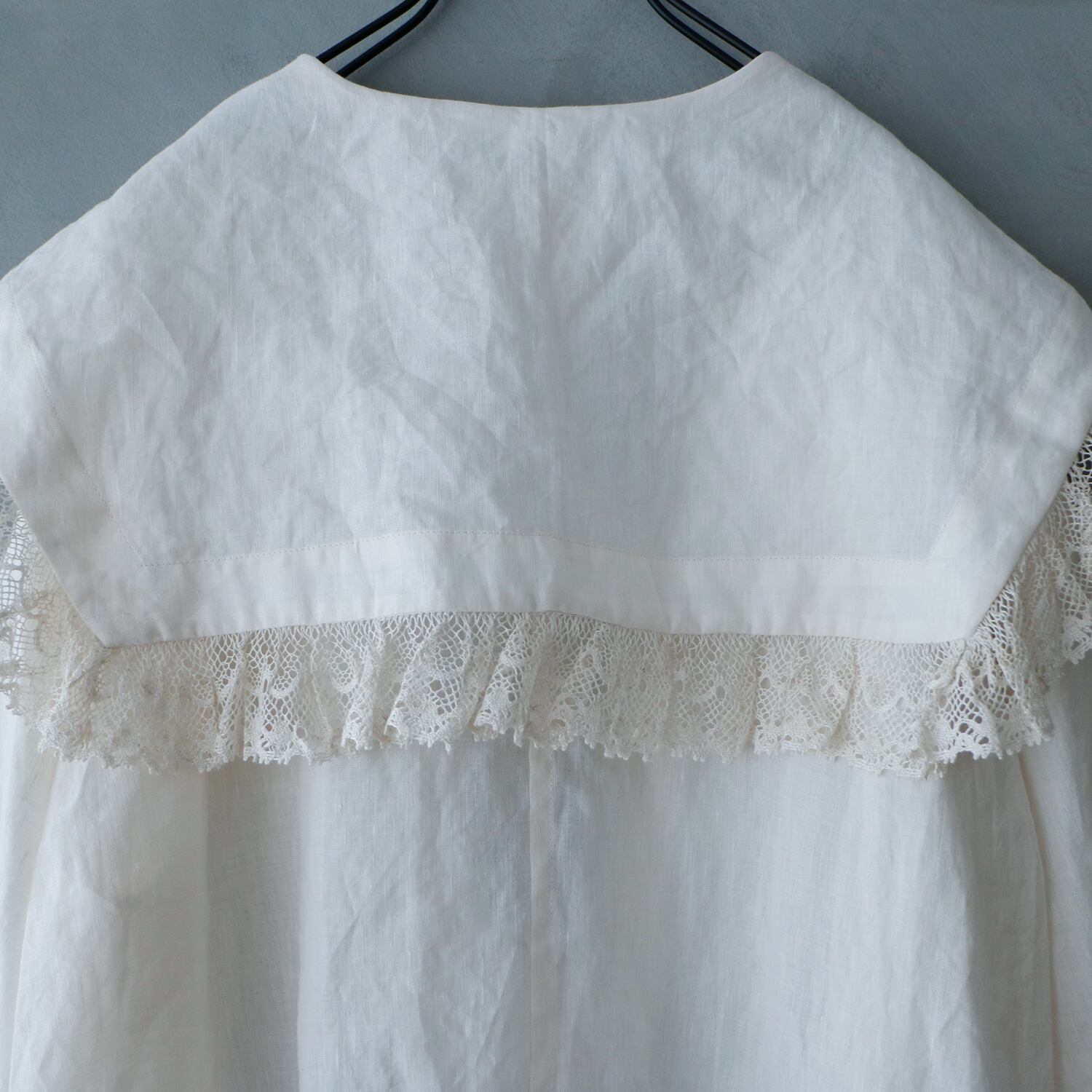 クラシックなセーラーカラーを思わせる広めの襟は、顔まわりに柔らかな陰影を生み、レースの透け感が肌にそっと光を落とします。