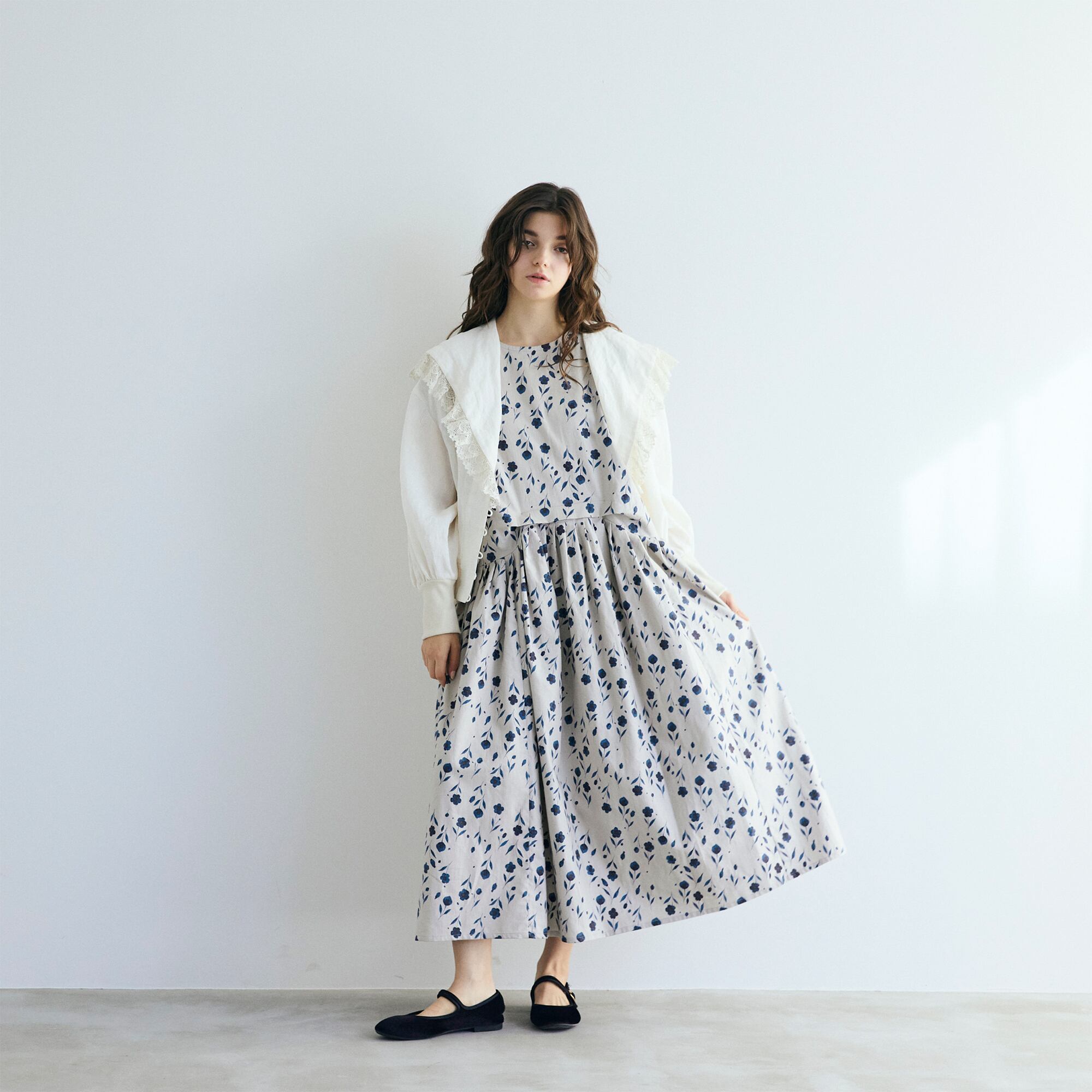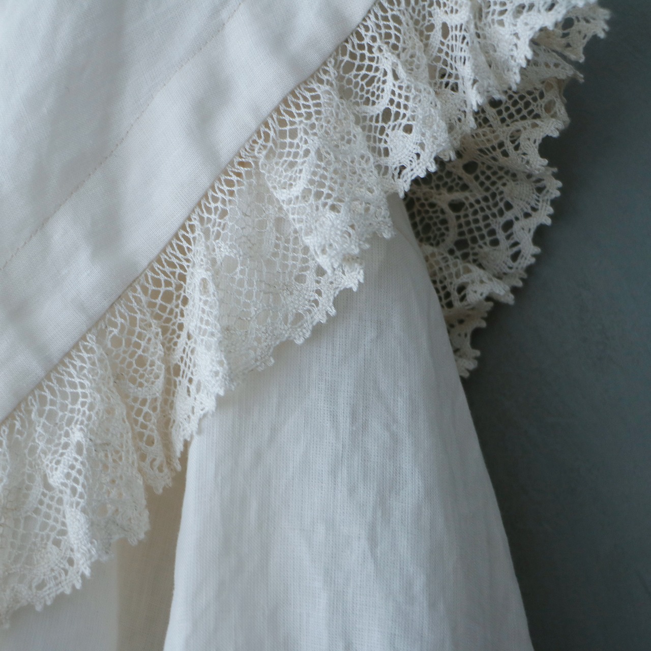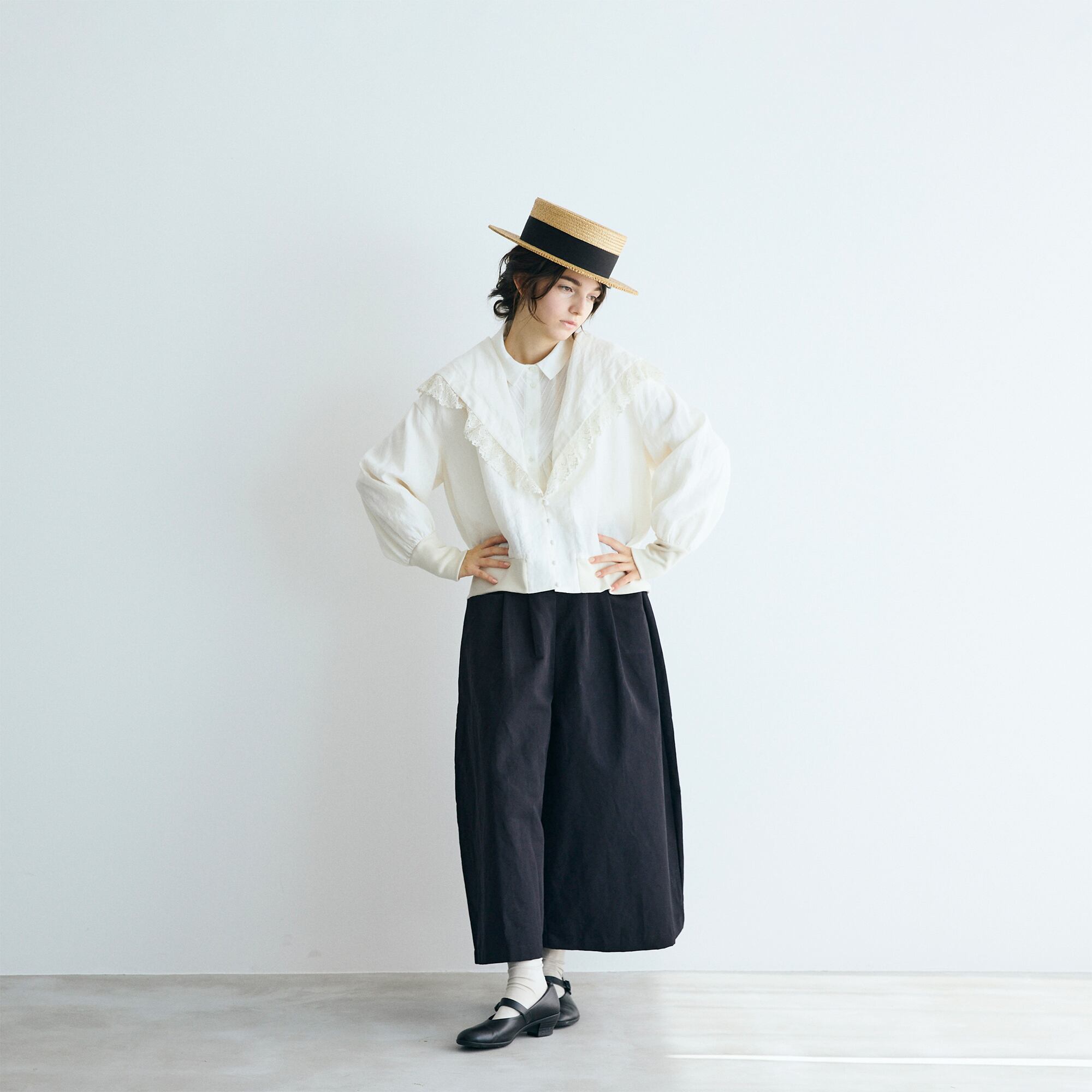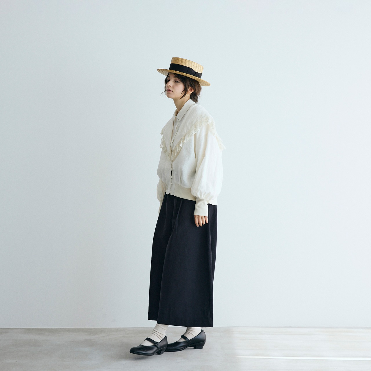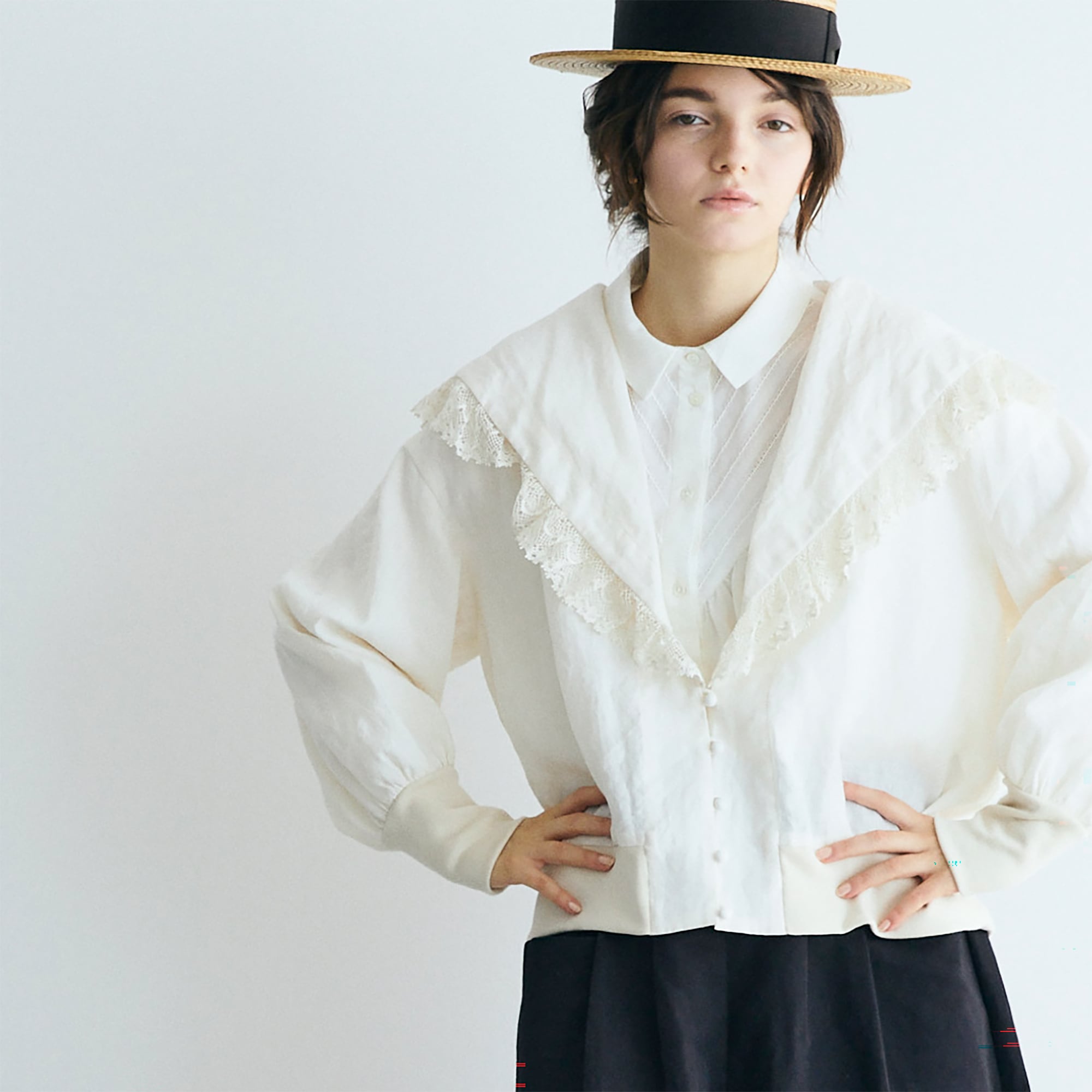 クラシックなセーラーカラーを思わせる広めの襟は、顔まわりに柔らかな陰影を生み、レースの透け感が肌にそっと光を落とします。