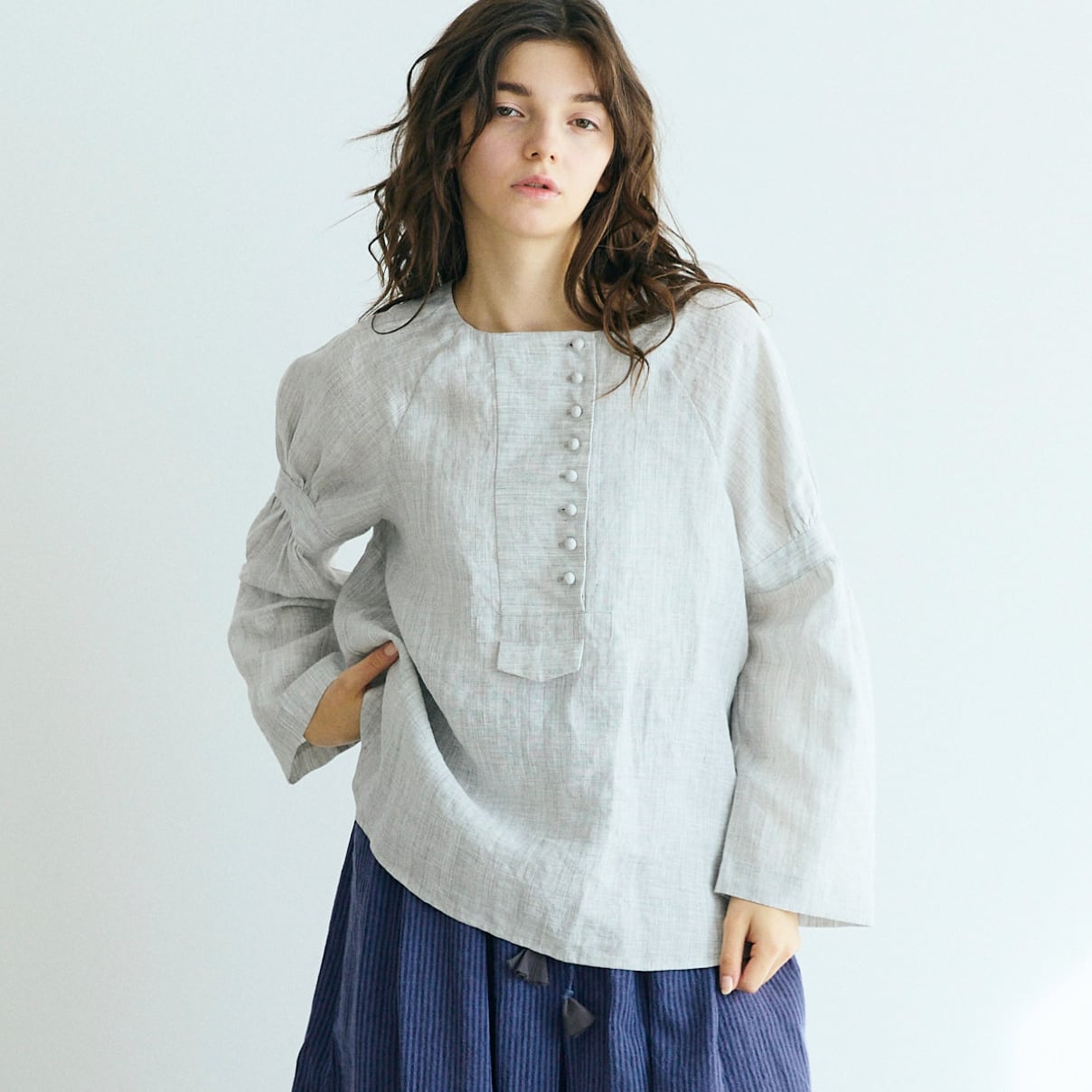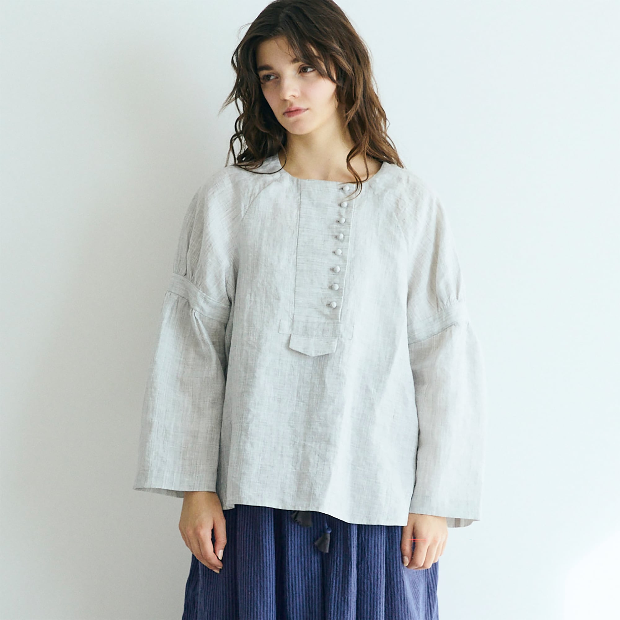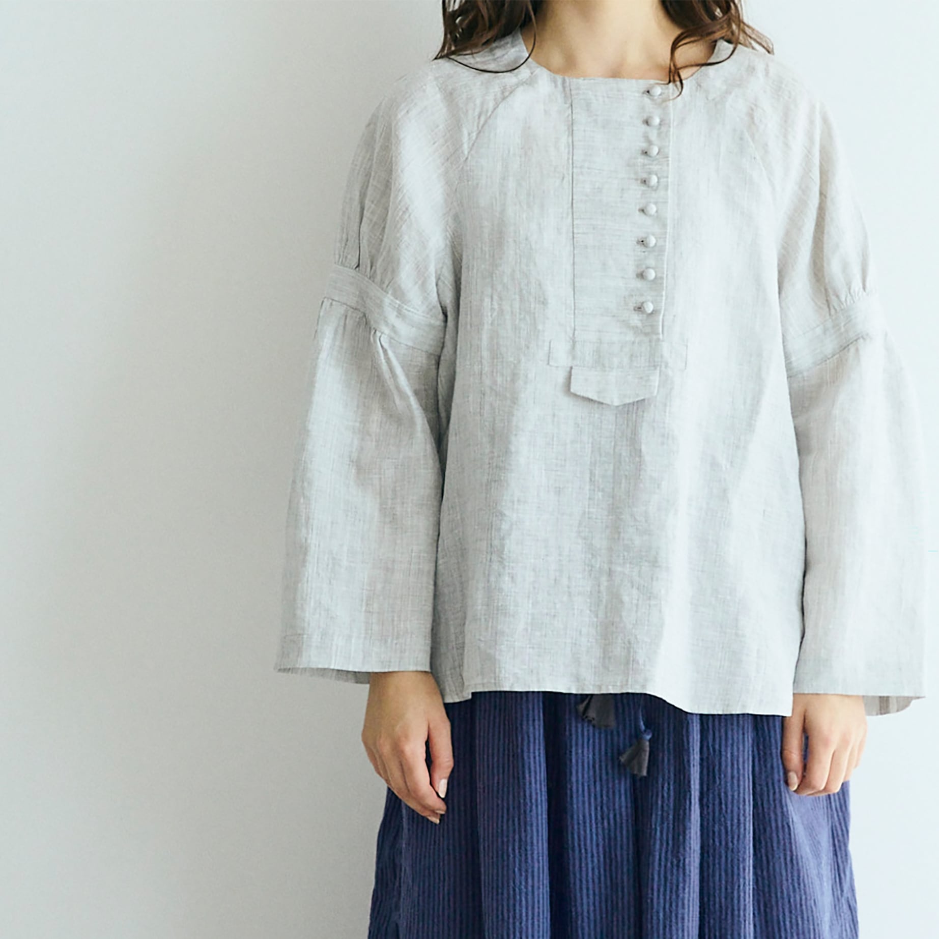 コロコロと並ぶ小さなくるみボタンが、アシンメトリーに愛らしさを添えるリネンプルオーバー。