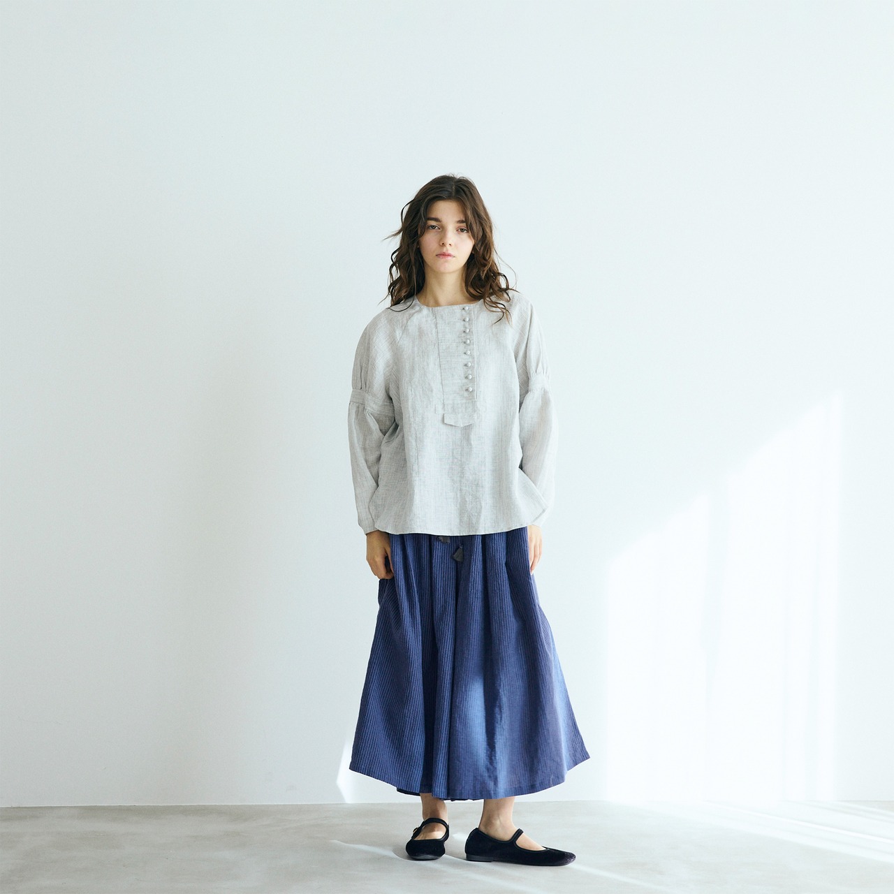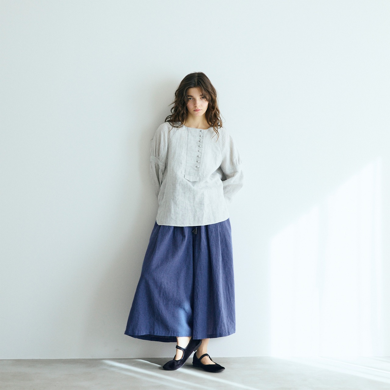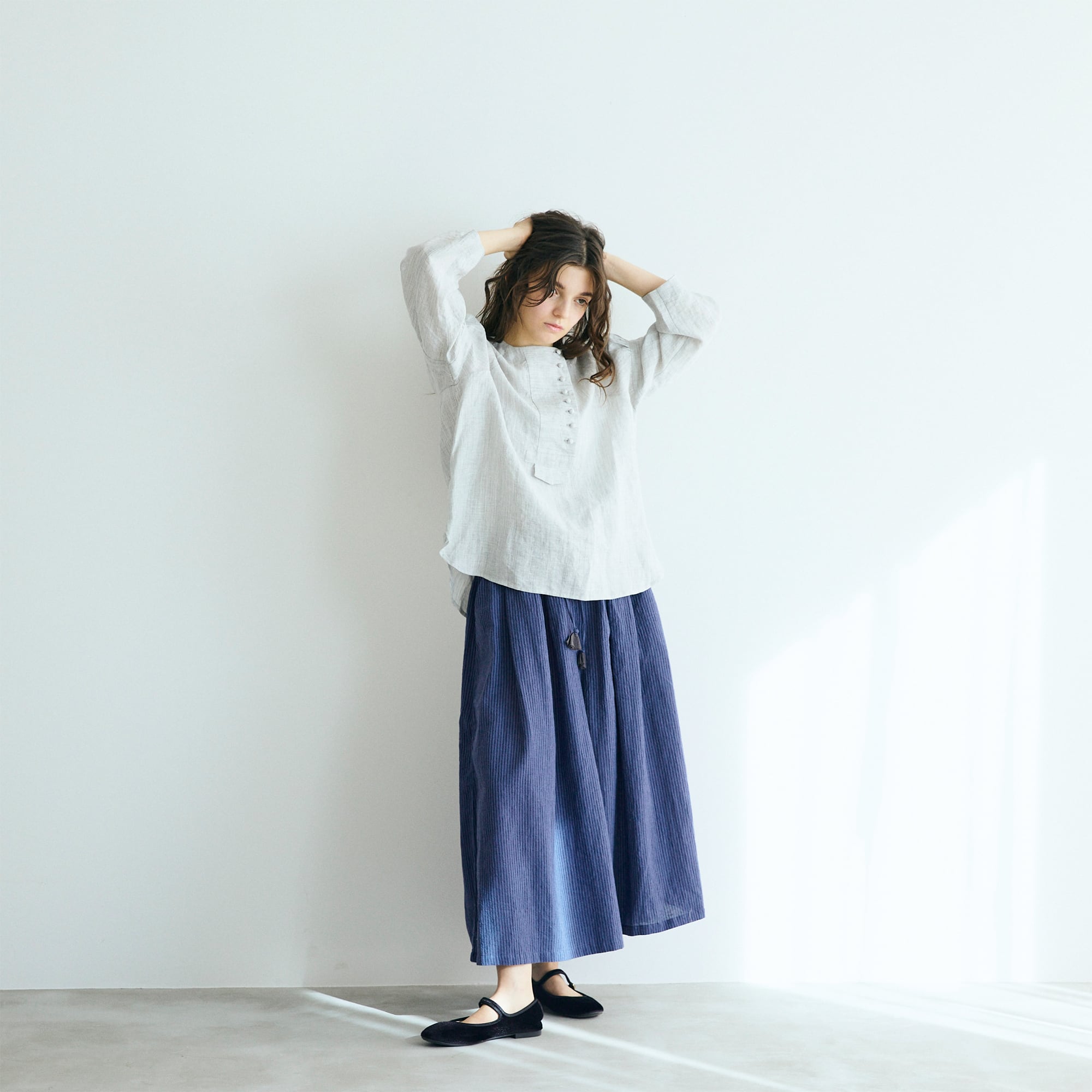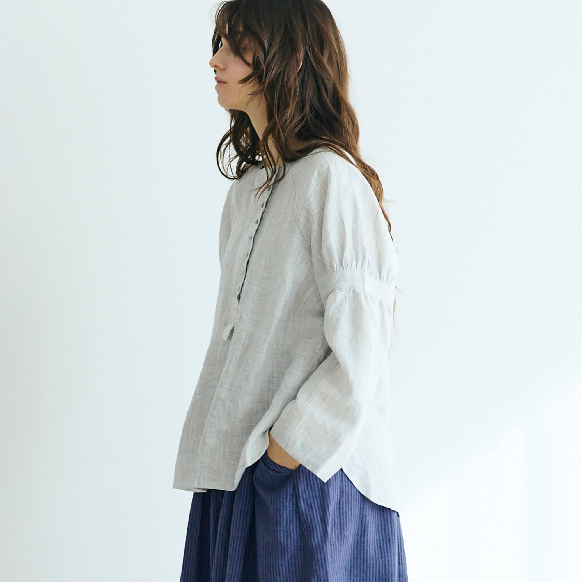 コロコロと並ぶ小さなくるみボタンが、アシンメトリーに愛らしさを添えるリネンプルオーバー。