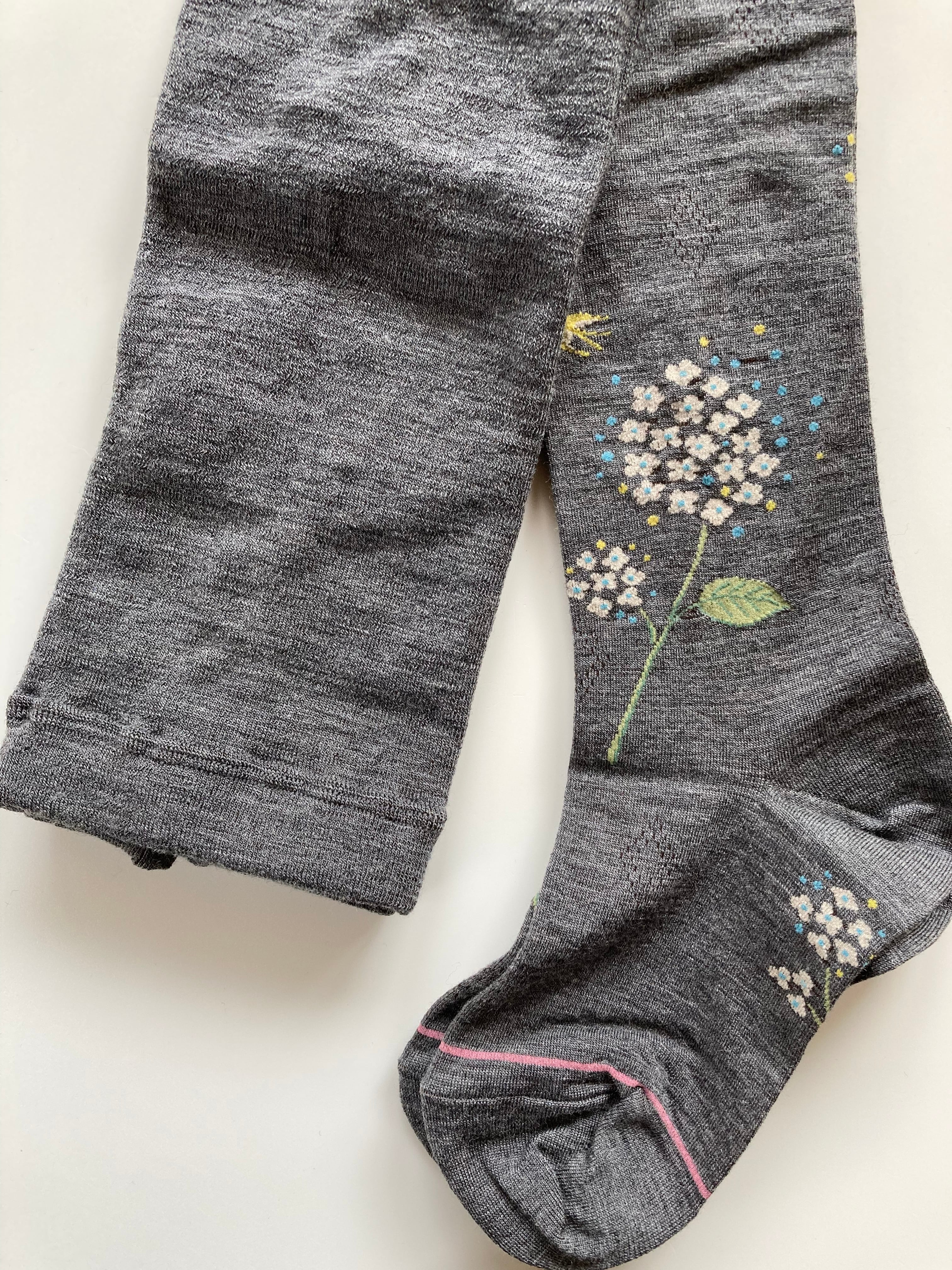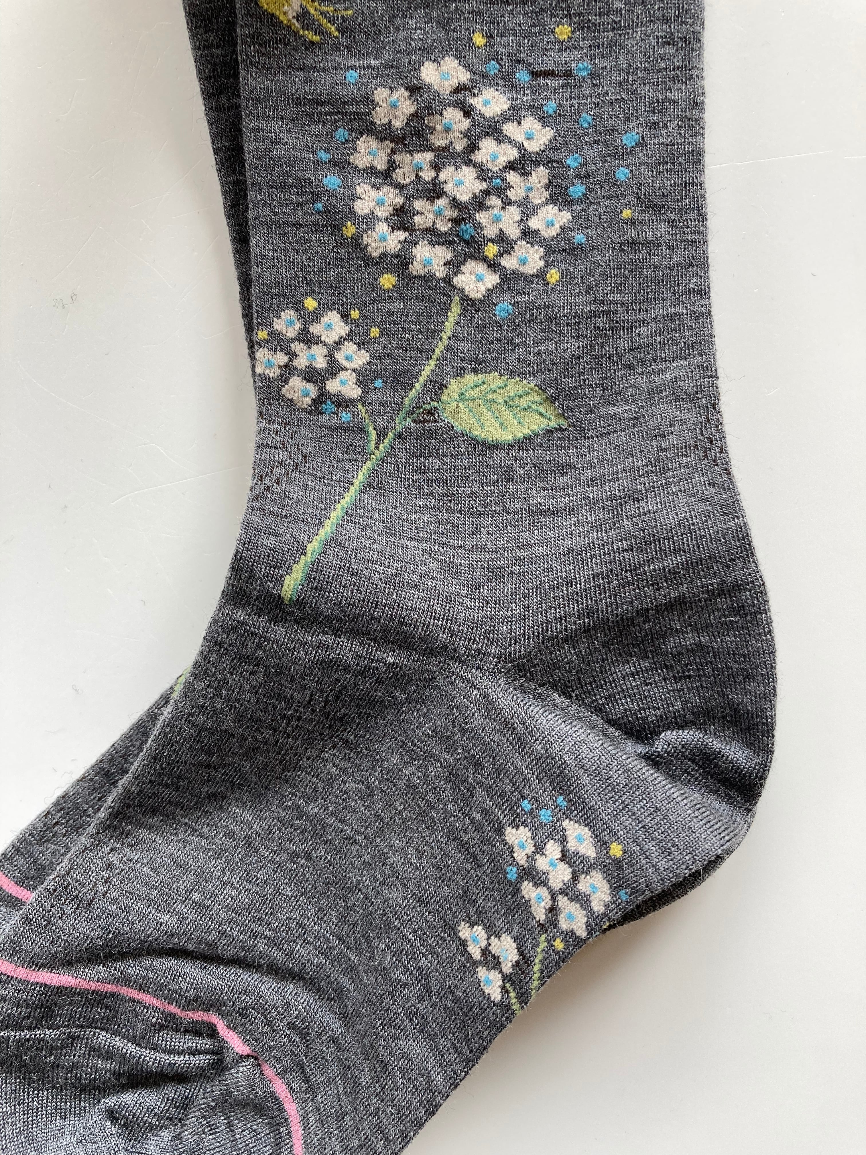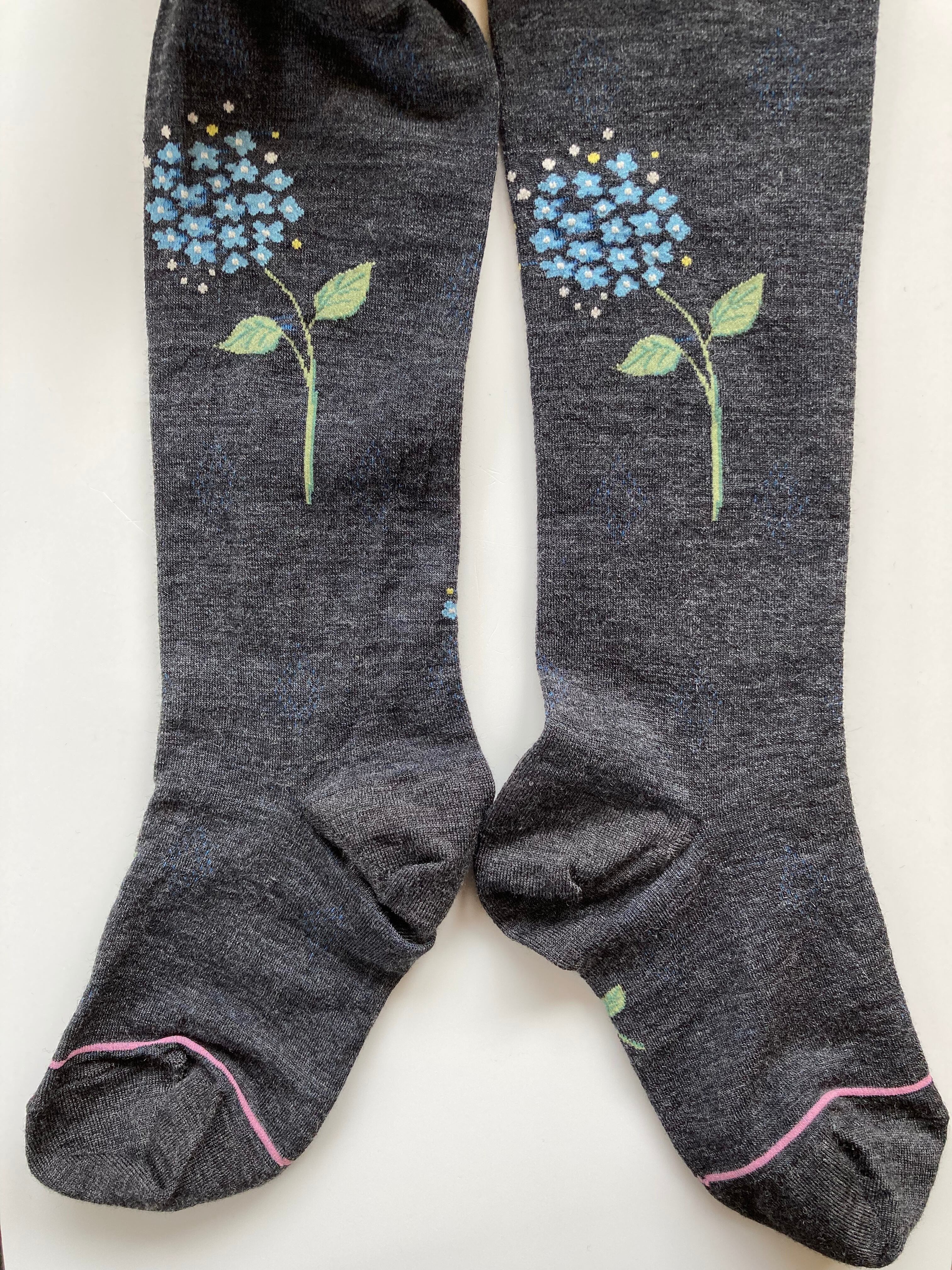 あじさいたちと一羽のツバメの姿を描いたタイツ