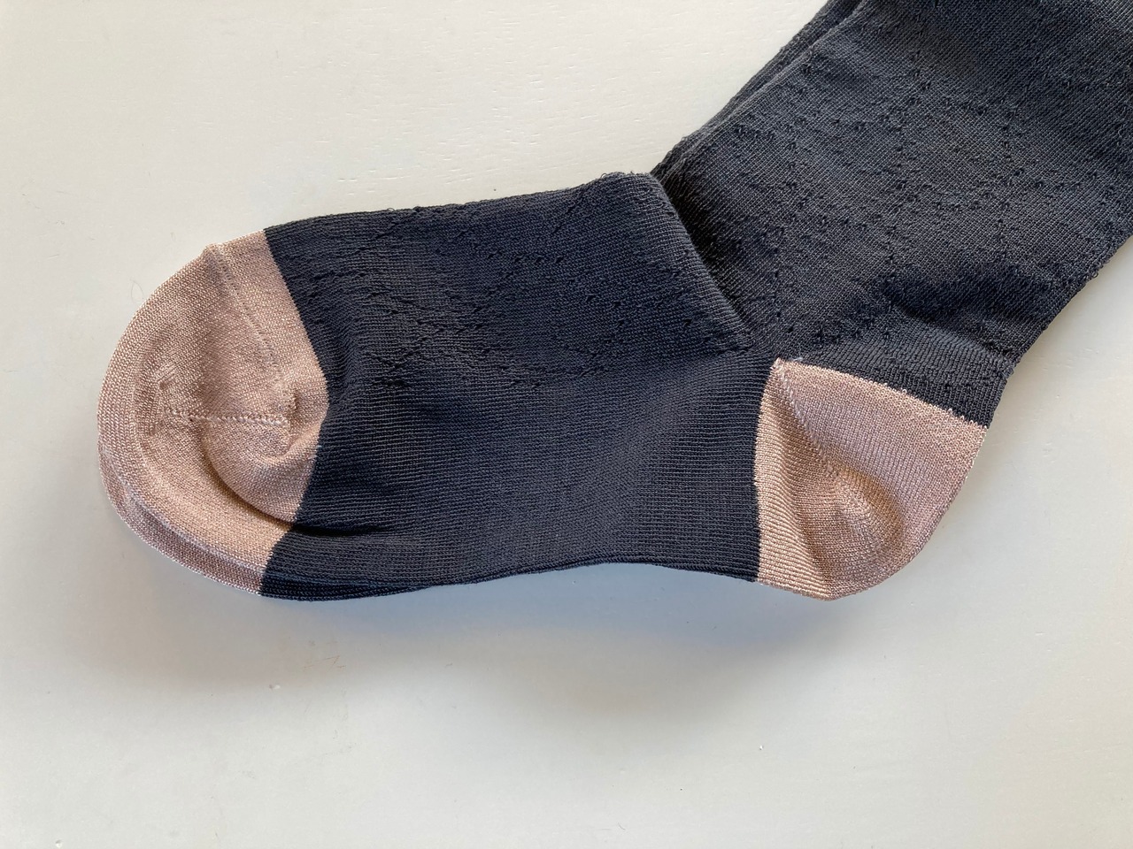 つま先とかかとは控えめなラメ糸です。